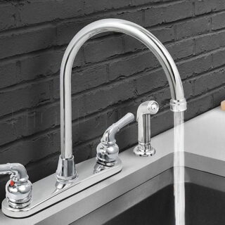 $39.86Add to cartThis two-handle kitchen faucets offer symmetric styling and steadfast performance. The high-arc design of its swivel spout allows you the flexibility and reach to fill modern cookware. This kitchen faucet features two lever handles, 1/2-inch IPS connections, a matching spray, and a deluxe chrome finish. Includes color-matched plastic sprayer with 48-inch.