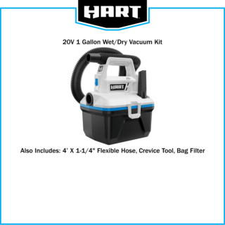 $57.27Add to cartHARTs 20V 1 Gallon White Wet/Dry Vacuum HPWD33 cleans up messes of all sorts around the house. Along with sucking up sawdust, debris and pet hair, the 40 CFM gives it plenty of suction to clean up liquid spills like a broken pipe or your kids spilled milk. The hose and crevice tool allow you to tackle a variety of applications. And the integrated blower port makes for quick cleanup. You can even dry off your deck after you washed it. Another really nice thing about this vac is its relatively small footprint. The lightweight, compact design makes it easy to tuck away in a corner of the garage or next to a workbench. It also comes with an onboard storage for convenient access to accessories and a pivoting hose for multi-directional use. Kit includes: 1 Wet/Dry Vac, 4 x 1-1/4 flexible hose, crevice tool, bag filter, and operators manuals.