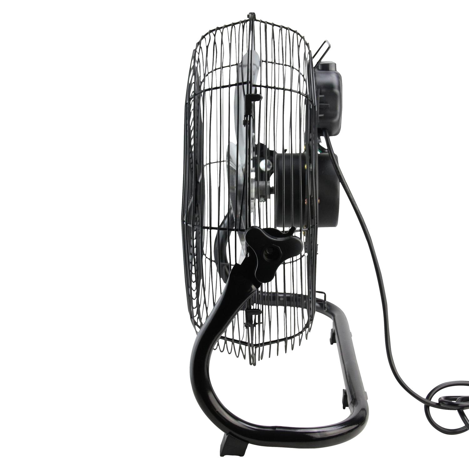Ban muggy stagnant air with this powerful portable fan Features: Three speed control allows you to adjust air velocity Can be tilted 90 degrees Stoppers on the stand prevent scratching surfaces The three blades are safely housed underneath a 1.8 mm wire grill 5.5′ lead cord Handle on the back for easy carrying Quiet operation For indoor use only 120 volts 60 hertz 1.75 amps 210 watts Dimensions: Overall: 16.25″ high x 17.5″ long x 10″ wide Fan Head: 14″ diameter x 4″ wide Blade: 5.25″ long x 4.5″ wide Material(s): aluminum/wire/plastic