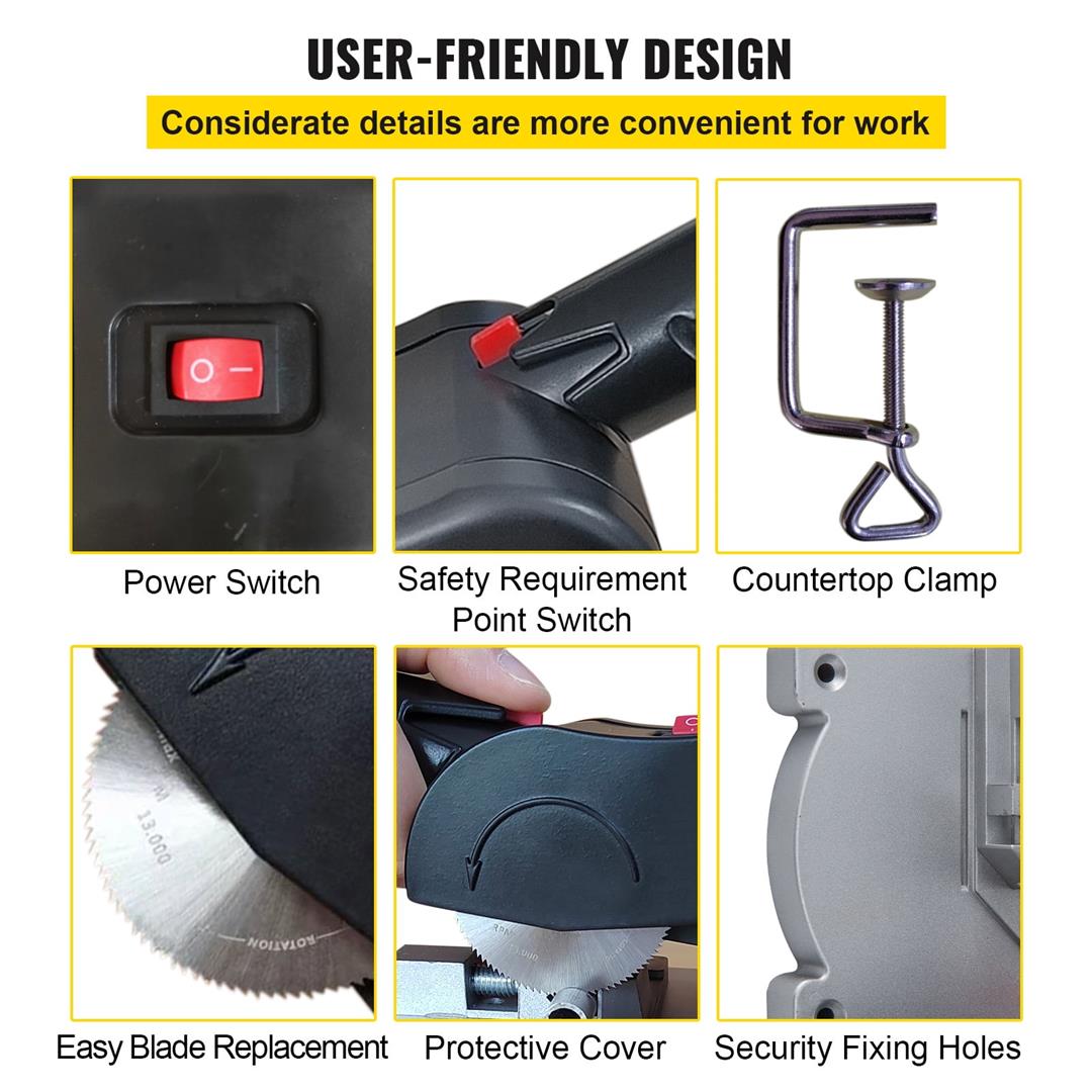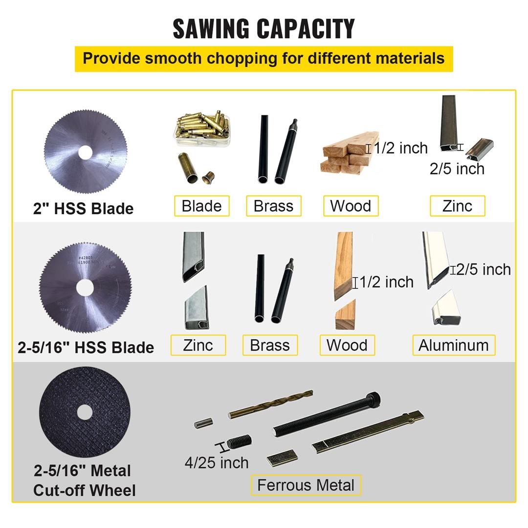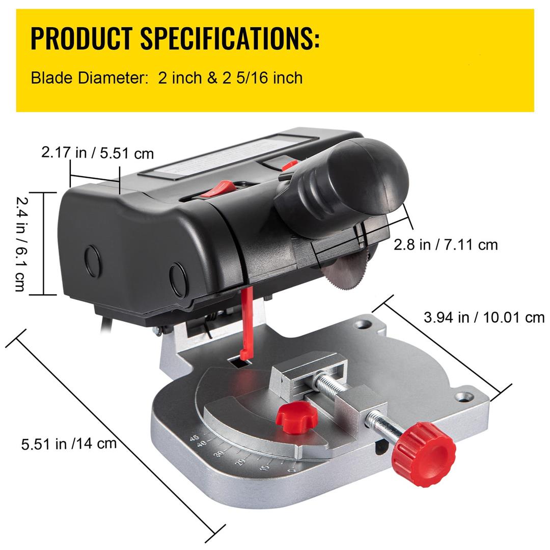 Smooth Chop-saw: Our mini miter cut-off chop saw comes with two 2-5/16 inch blades. It features a 1/2 inch (12 mm) cutting depth of non-metal material, 2/5 inch (10 mm) of soft material, and 4/25 inch (4 mm) of ferrous metal. Get ready to saw through wood and get your next project started this season! High-Speed Performance: The 90 W motor features low noise, and the high efficiency of our mini miter saw generates a rotation speed of 7800 RPM. Because of the powerful motor, the benchtop cut-off miter saw can cut different materials quickly. Its compact and powerful, so you can cut faster than ever before. Portable & Easy to Use: The base clamping jig of our mini miter saw can fix the machine on the desktop firmly. And there are fixing holes that ensure further stability. Half of the blade is covered in a protective housing to keep the operator from accidentally hurting their hands. Wide Application: Our mini chop saw cuts a wide variety of materials such as wood, metal, plastic. It cuts your tiny metals squarely and smoothly, providing an instantly workable finish. It is ideal for small hobbies and DIY crafts. Flexible 0-45 Miter Cutting: 0-45 miter cutting function makes operation more accurate and effortless. You can easily adjust the angle according to your needs. And it is equipped with a clamping fence that ensures you can push it firmly to clamp on tubes of varying thicknesses.