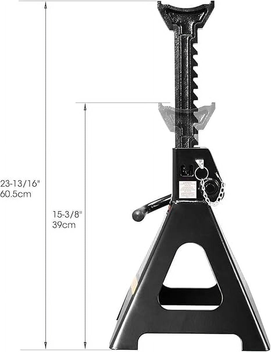 Double locking jack stands that are sold as a pair; Height ranges from 15-3/8″ to 23-13/16″ with a 6 ton (12,000 lb) capacity each Equipped with a double-lock protection feature, increasing safety by 200% Saddle has a large surface area that provides better contact with the load being supported; Large foot base size of 10-13/16″ by 9-7/16″ Single piece, self-locking, multi-position, forged iron ratchet bar provides precise adjustments