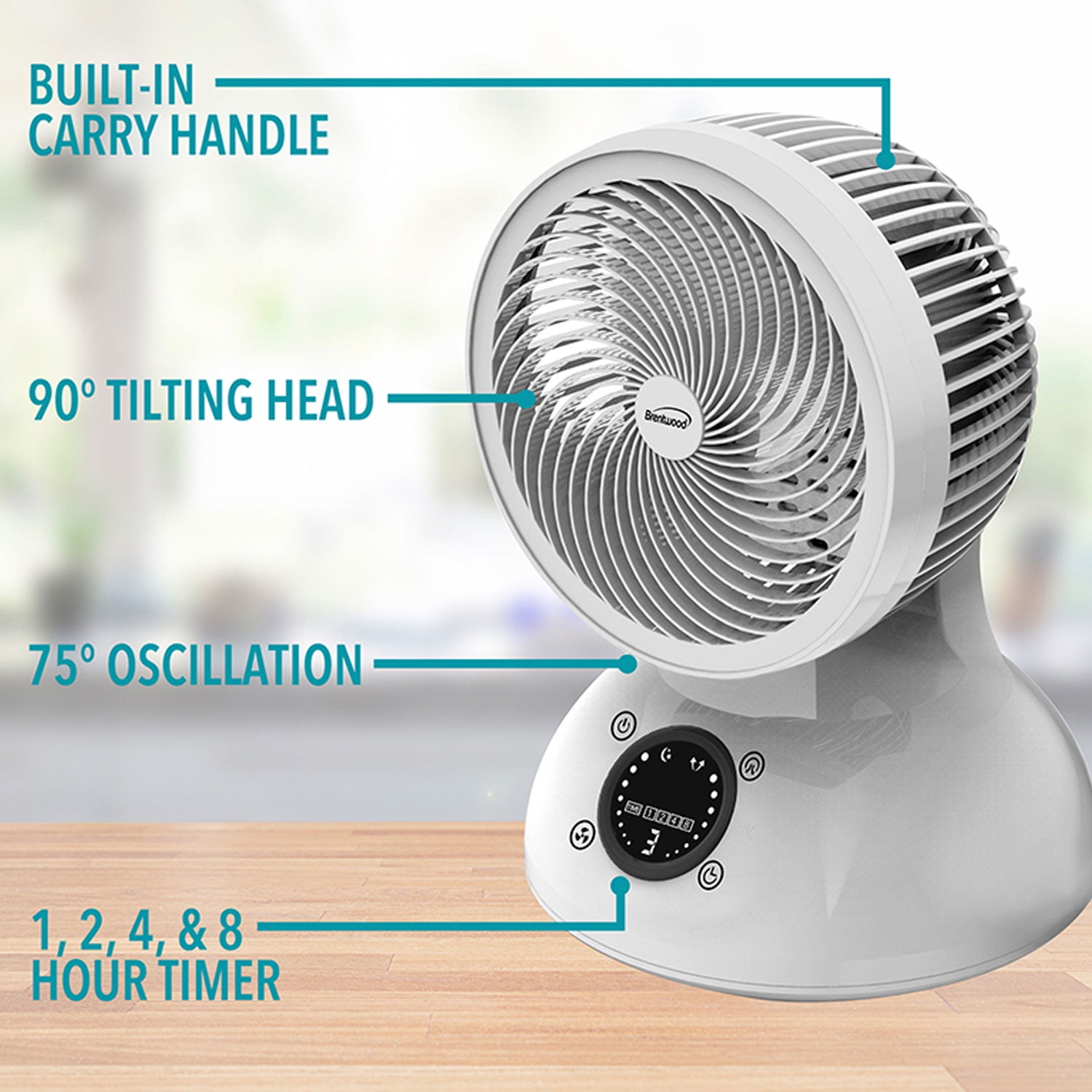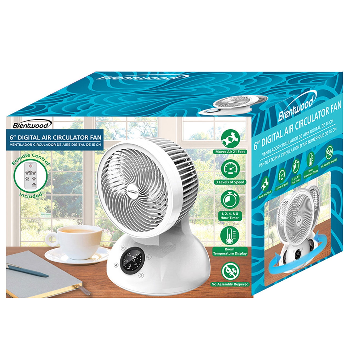 Add a little breeze to your life with the Brentwood 6-Inch Oscillating Desktop Fan. This tall, powerful fan provides comfortable airflow to any home or office space, letting you cool off when the A/C can’t keep up with the summer heat. The 28-watt fan features 3 speed settings which control the strength of room circulation. A pivoting head and oscillating motor direct the airflow throughout the room, perfect for airing out home and office spaces. Deep pitch blades ensure a high air flow of up to 21 feet and head tilts up to 90 degrees, providing circulation for the whole room. Includes a remote and 8-hour timer, temperature gauge, with auto-shutoff, giving you full control over your air quality. Fully assembled and ready-to-use right out of the box, simply plug the fan in and turn stale, warm air into flowing, cool air. The sleek, white design and high-intensity spiral grill add a stylish modern aesthetic to any room the fan is in. Cool off today with the Brentwood 6-Inch Oscillating Desktop Fan.