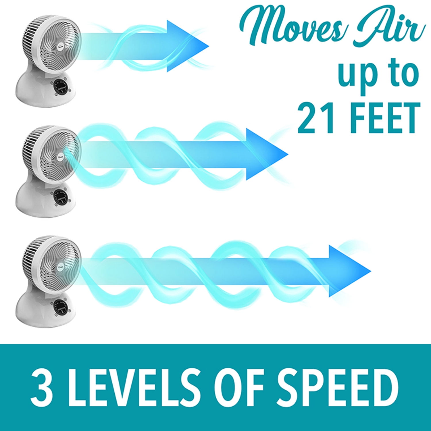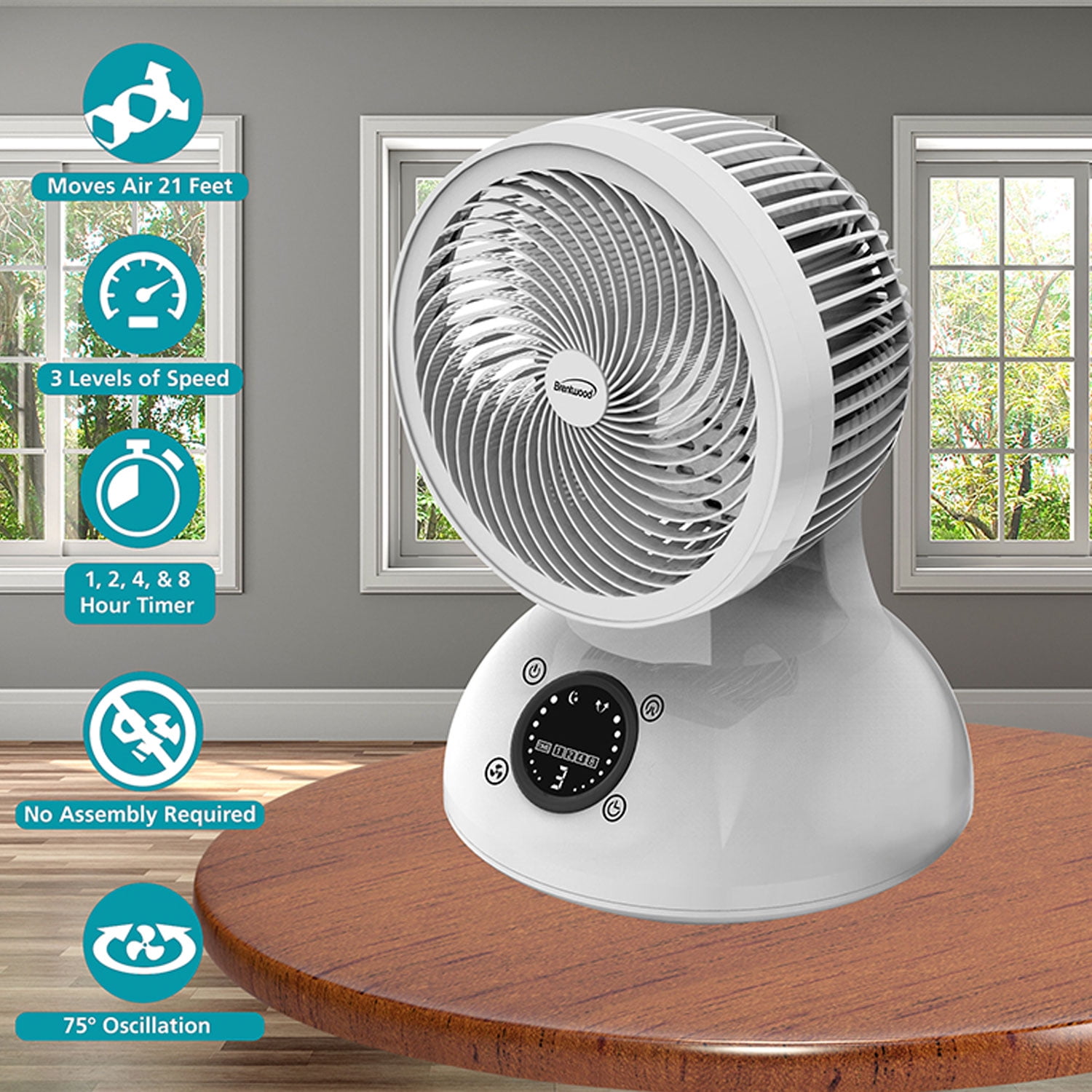 Small-yet-powerful desktop fan provides air circulation to the whole room, perfect for home and office spaces Deep pitch blades and 75-degree oscillation create a maximum air flow of up to 21 feet 3 fan speeds, simple touch controls, and 90-degree head tilt put you in control your air circulation Remote control, 8-hour timer featuring auto-shutoff, and temperature gauge give you full control over your air quality Fully assembled and ready to use right out of the box; plug in, set the speed, and add a breeze to your life Power: 28 watts Color: White Dimensions (L x W x H): 7.50 x 7.50 x 13.25 inches Weight: 3.40 pounds Manufacturer’s warranty: 1-year warranty