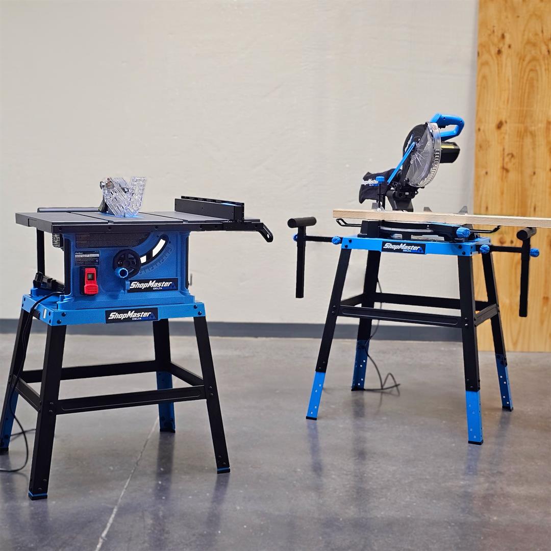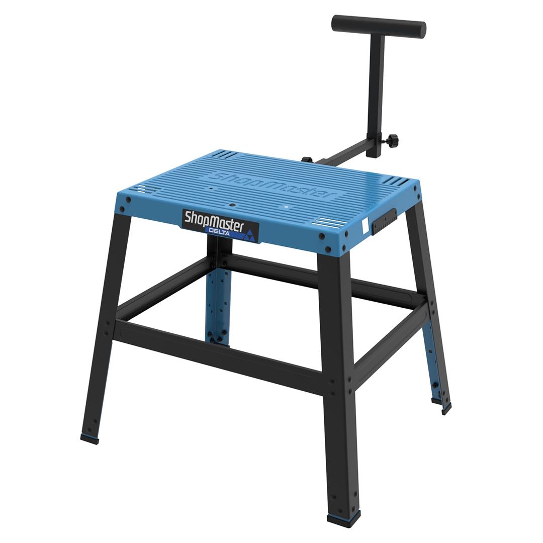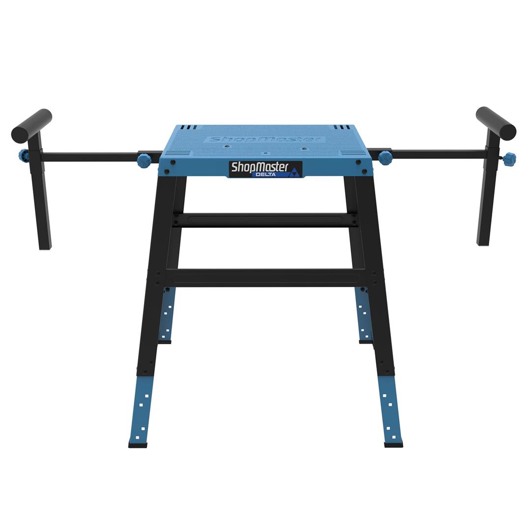 Designed to work with Delta ShopMaster table and miter saws. Adjustable height for table or miter saw applications. 400 lb capacity. Work supports for large workpieces. Adjustable side extension arms for miter saw work supports. Rear extension arm for table saw out-feed support.