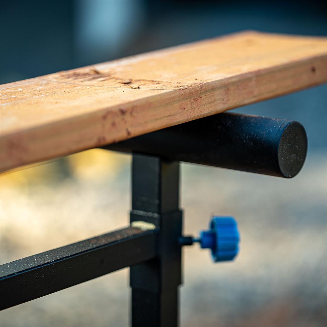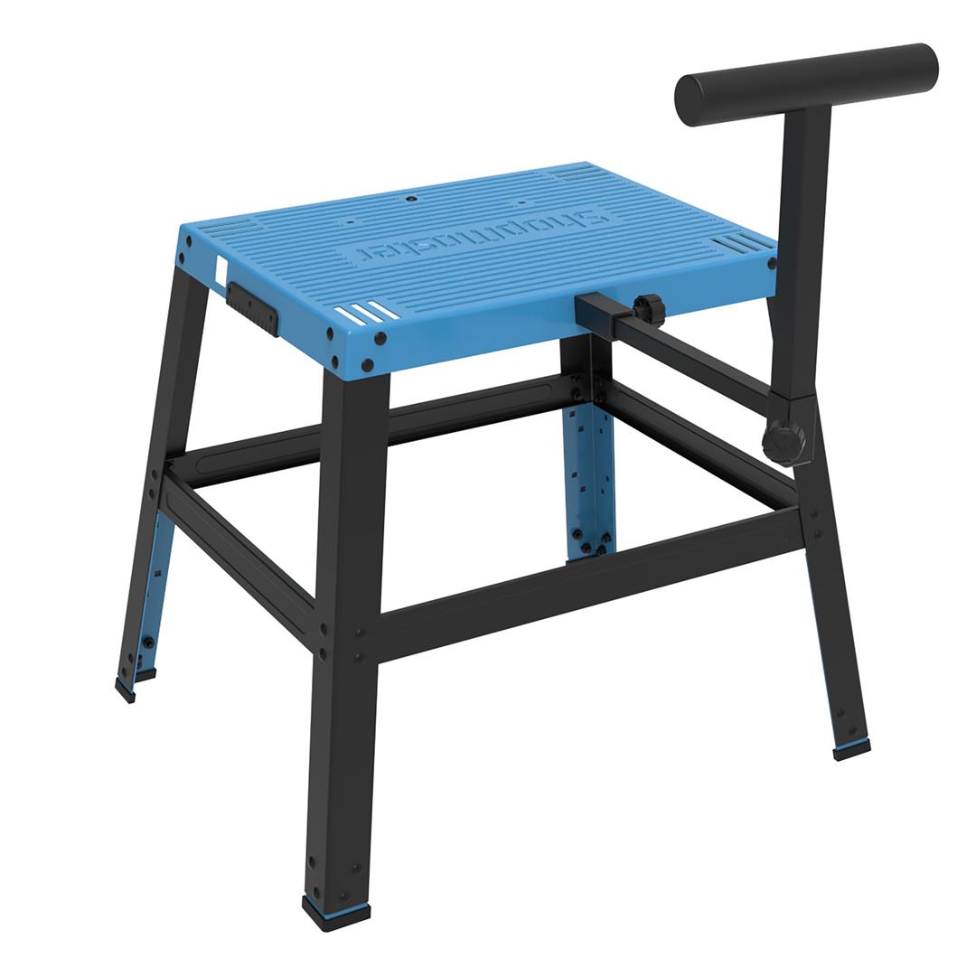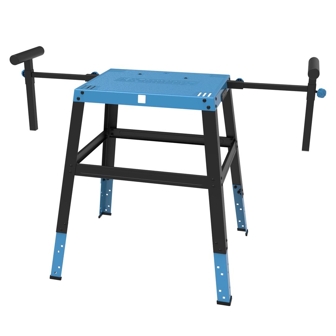 Designed to work with Delta ShopMaster table and miter saws. Adjustable height for table or miter saw applications. 400 lb capacity. Work supports for large workpieces. Adjustable side extension arms for miter saw work supports. Rear extension arm for table saw out-feed support.