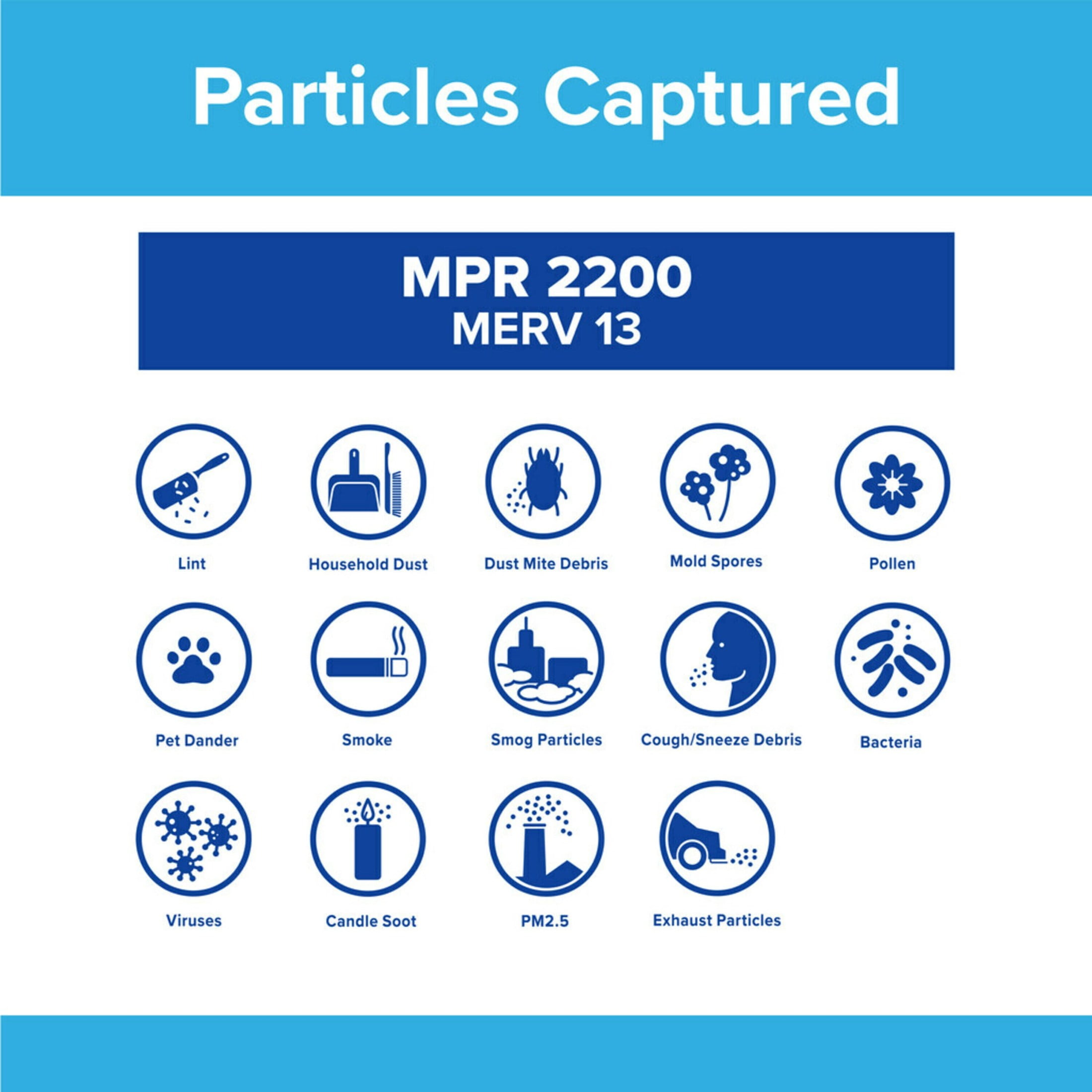 Filtrete 14x20x1 MPR 2200 Air Filter, made by 3M, helps capture unwanted particles from your household air to contribute to a cleaner, fresher home environment. Designed with exclusive Filtrete 3-in-1 technology, including a high MPR 2200 and MERV 13 rating, your AC filter will help pull and capture countless microparticles such as pet dander, smoke, bacteria and up to 78% of virus airborne particles (1) while letting cleaner air flow through. Your Filtrete Filter will also capture large particles, including lint, pollen and household dust. This filter is also CERTIFIED asthma and allergy-friendly (2). Use a 3-month pleated 1-inch home HVAC filter in your furnace, air conditioner or HVAC system. For optimal performance of your heating and cooling system or HVAC system, change your furnace filter at least every 90 days. Note: For easy replacement reminders, create a change countdown in the Filtrete Smart App. Simply use the app to scan the barcode on your filters packaging, then choose 30, 60 or 90 days for your replacement countdown. When the filters life is up, youll get a notification to change your filter. The No. 1 Recommended HVAC Air Filter Brand (3), Filtretes Home Air Filters provide the breakthrough technology needed to change how we clean our air, by filtering out particles both large and invisible, to create a cleaner, healthier home for ourselves and our families. (1) Based on airborne MS2 virus testing. Initial efficiency. (2) As outlined in report ASCR: 1246-01. (3) Based on the 2022 Ipsos US Brand Health Study of Residential HVAC Air Filters.