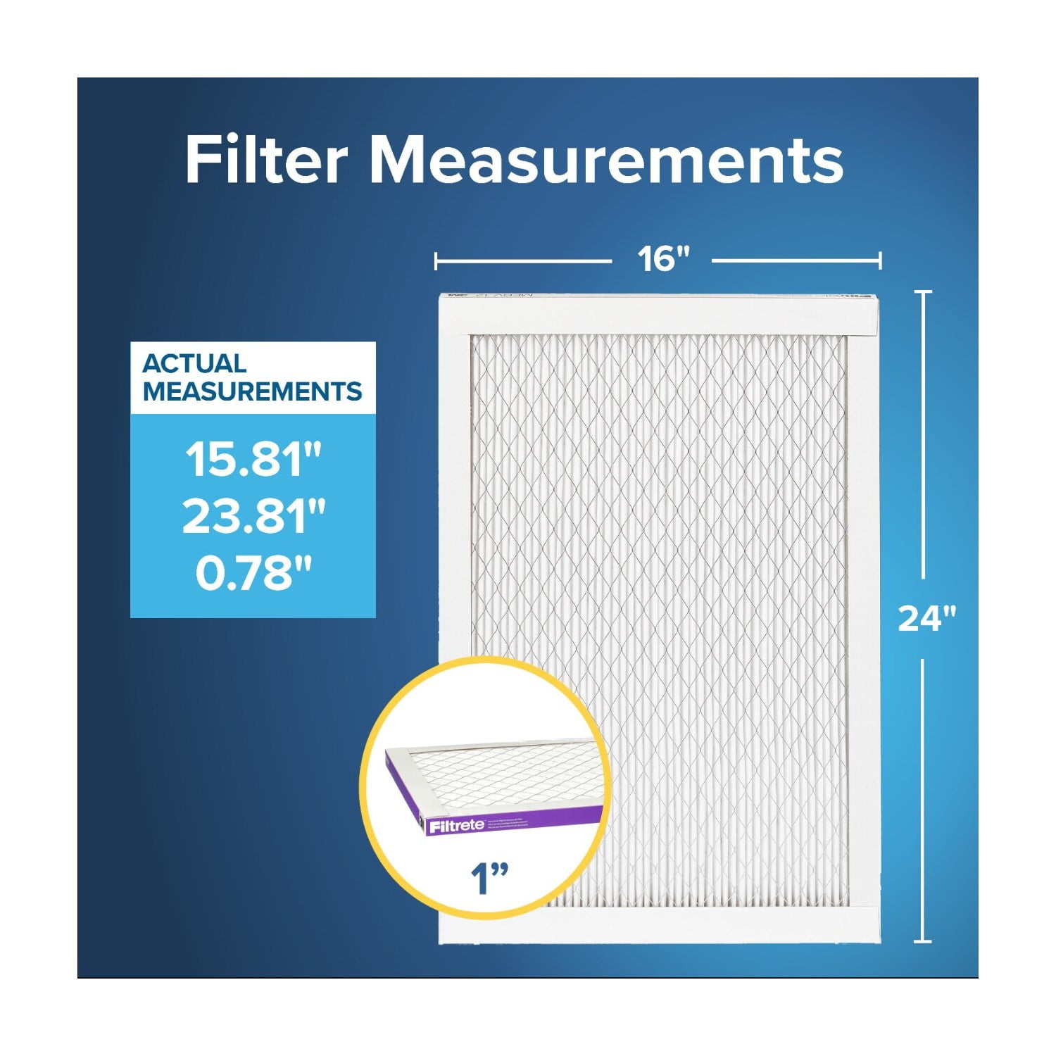 Filtrete 16x24x1 MPR 1500 Air Filter, made by 3M, helps capture unwanted particles from your household air to contribute to a cleaner, fresher home environment. Designed with exclusive Filtrete 3-in-1 technology, including a high MPR 1500 and MERV 12 rating, your AC filter will help pull and capture countless microparticles such as pet dander, smoke, bacteria and up to 54% of virus airborne particles (1) while letting cleaner air flow through. Your Filtrete Filter will also capture large particles, including lint, pollen and household dust. This filter is also CERTIFIED asthma and allergy-friendly (2). Use a 3-month pleated 1-inch home HVAC filter in your furnace, air conditioner or HVAC system. For optimal performance of your heating and cooling system or HVAC system, change your furnace filter at least every 90 days. Note: For easy replacement reminders, create a change countdown in the Filtrete Smart App. Simply use the app to scan the barcode on your filters packaging, then choose 30, 60 or 90 days for your replacement countdown. When the filters life is up, youll get a notification to change your filter. The No. 1 Recommended HVAC Air Filter Brand (3), Filtretes Home Air Filters provide the breakthrough technology needed to change how we clean our air, by filtering out particles both large and invisible, to create a cleaner, healthier home for ourselves and our families. (1) Based on airborne MS2 virus testing. Initial efficiency. (2) As outlined in report ASCR: 1246-01. (3) Based on the 2022 Ipsos US Brand Health Study of Residential HVAC Air Filters.
