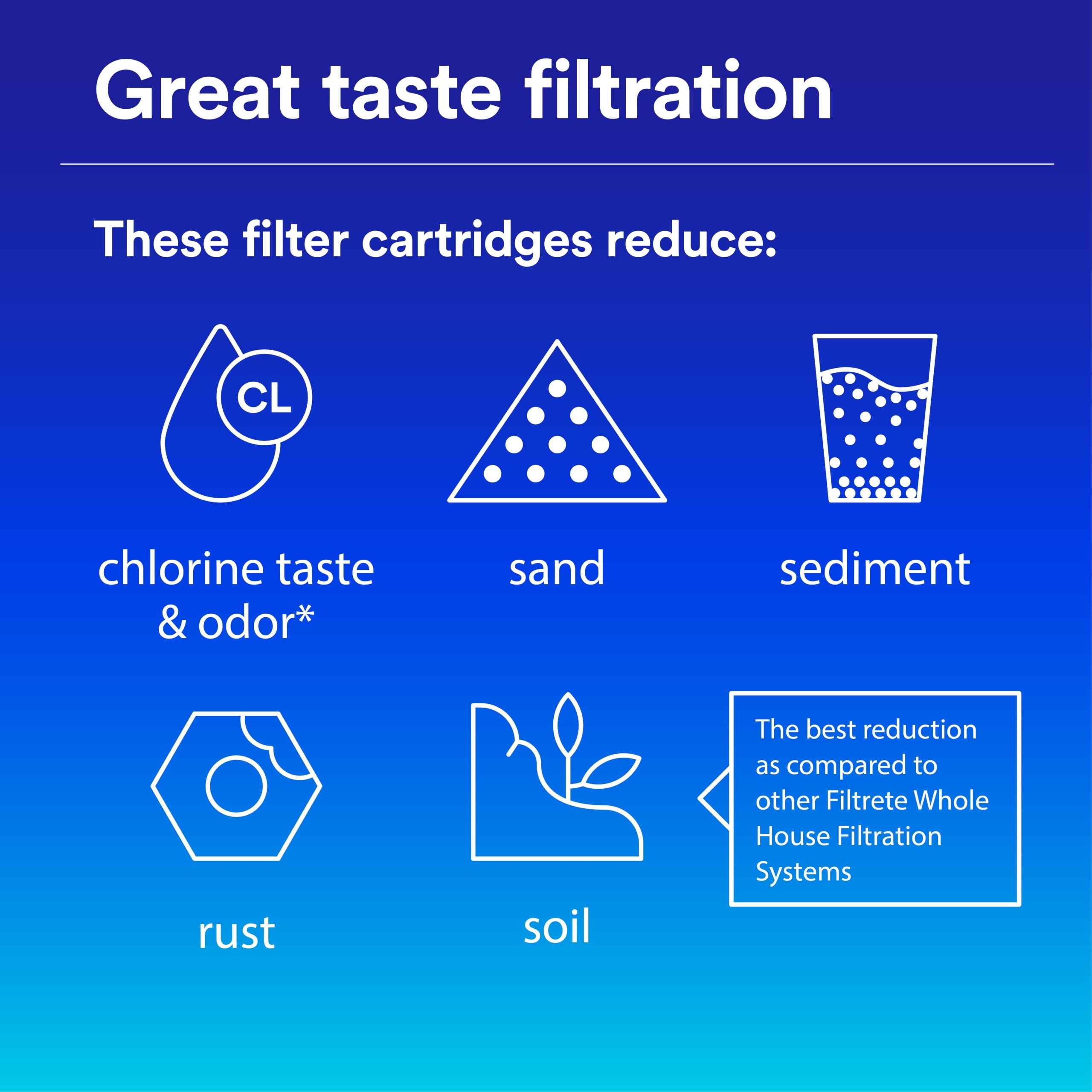 Filtrete High Performance Whole House Filter, Large Capacity. Replacement filter for Filtrete High Performance Whole House Sanitary Quick-Change Filter System 4WH-QCTO-S01. Reduces chlorine taste and odor, sand, soil, silt, rust and sediment based on 3M Testing. 1/4 turn change for easy, filter replacement without the need for a wrench. Sanitary design allows filter change without touching the dirty media or without having to clean the housings with soap between filter changes. 12-month new filter life for 4+ persons / +3-bathroom households. Space saving design. Certified to NSF Standards 42 and 372 – Use only genuine Filtrete/OEM replacement filters certified for use with Filtrete systems.