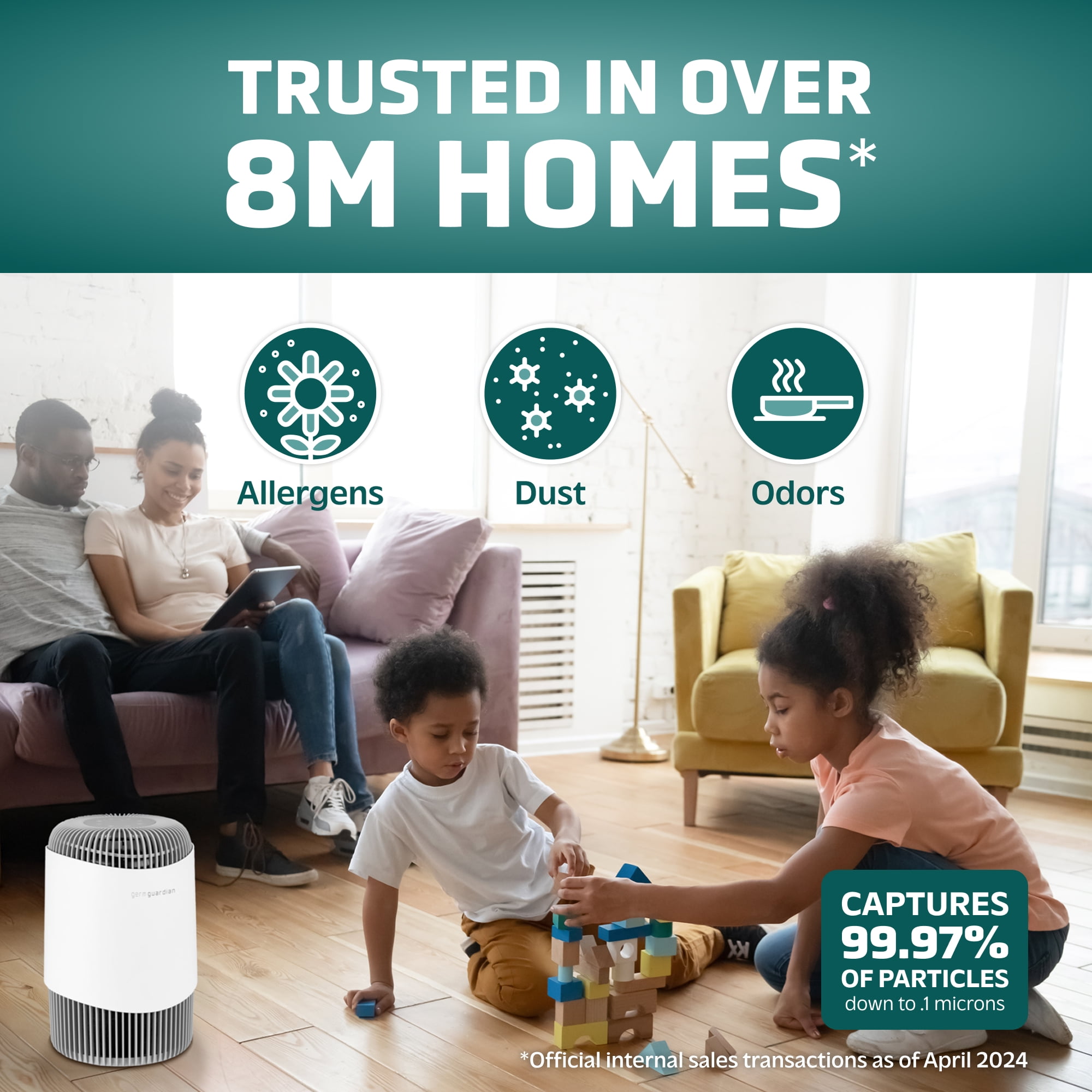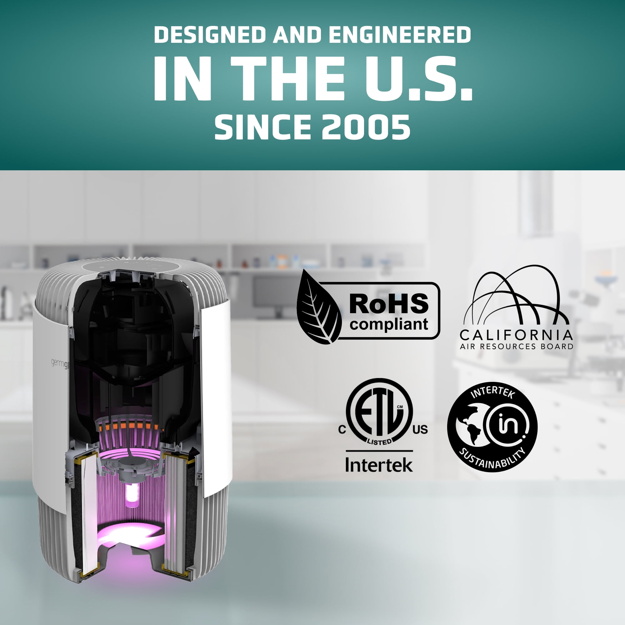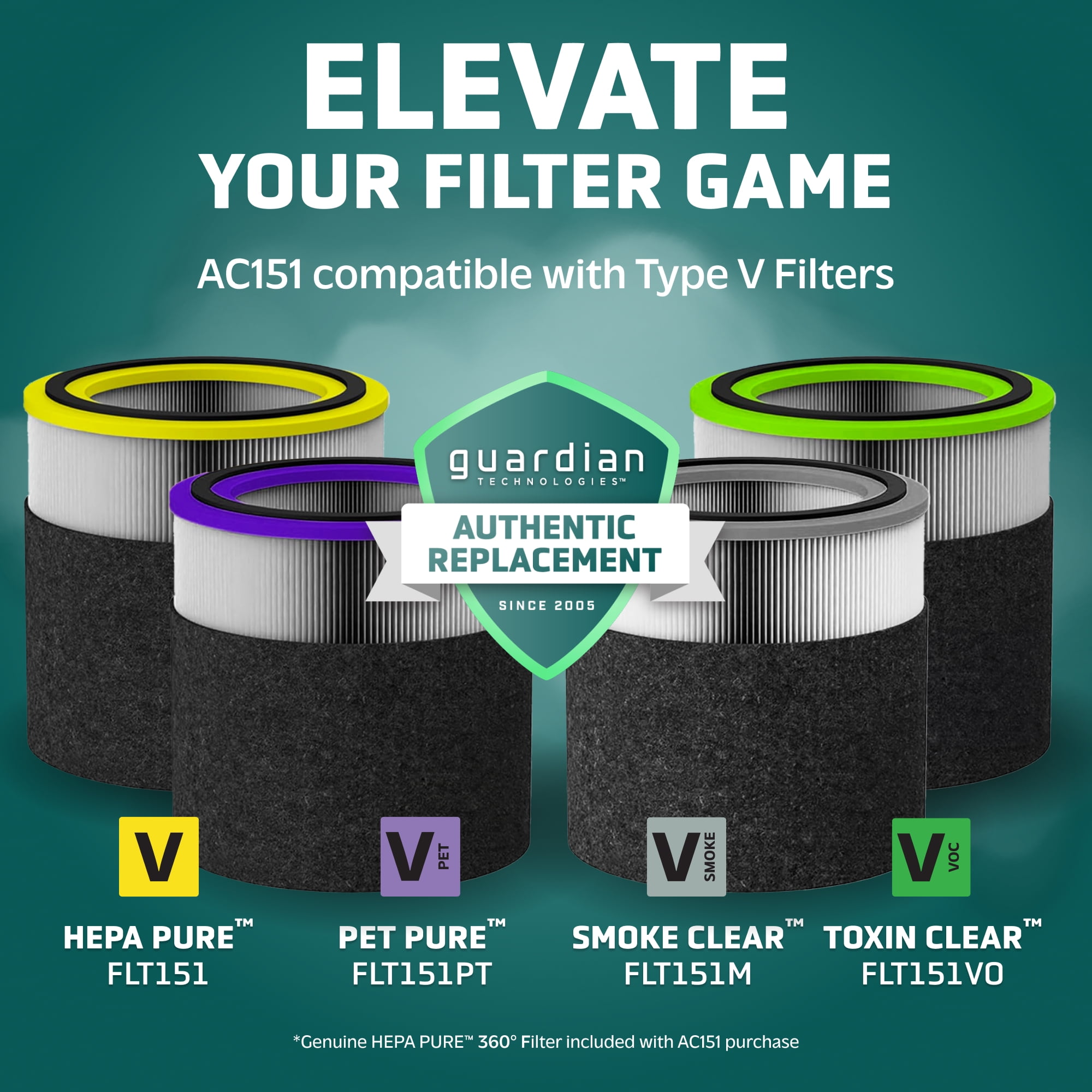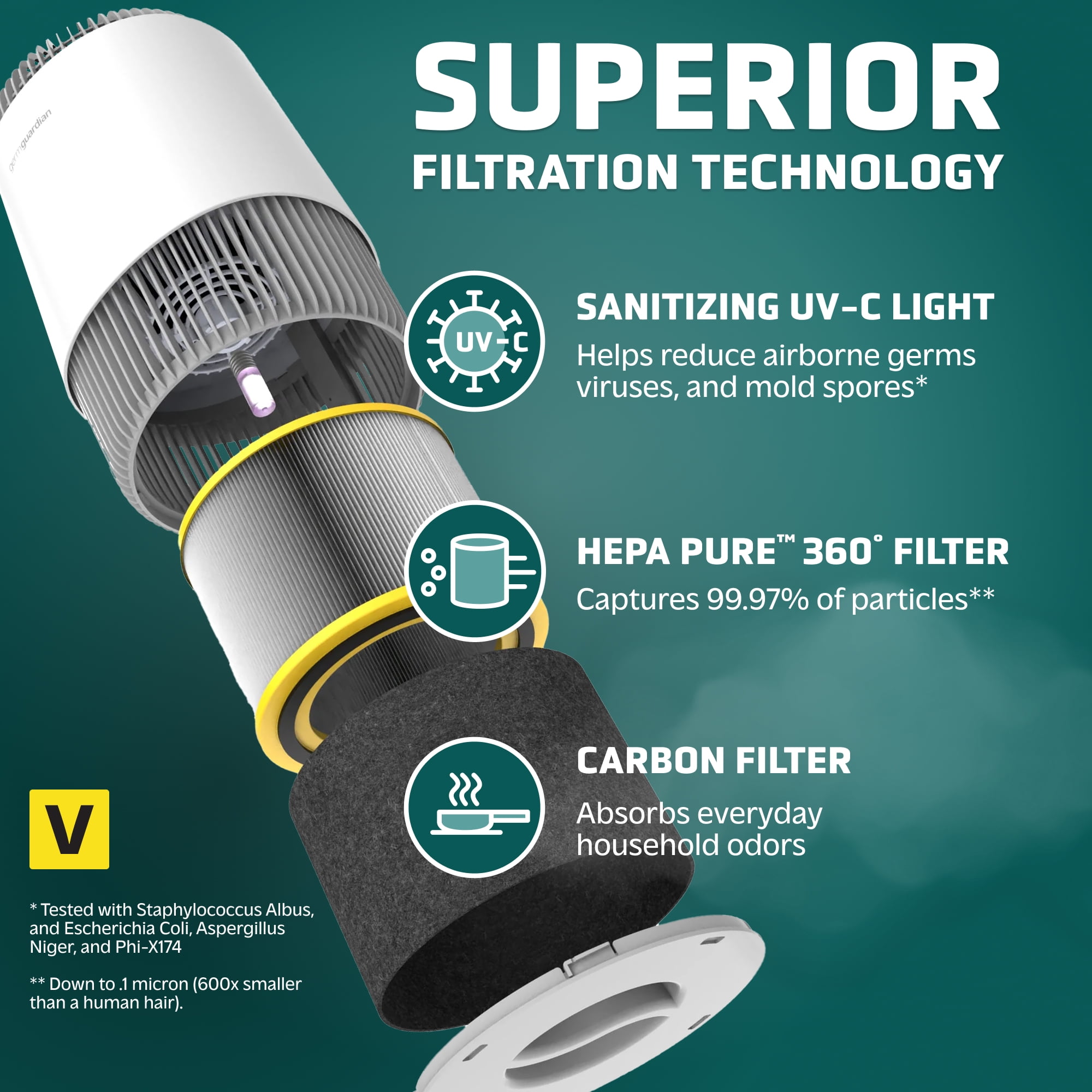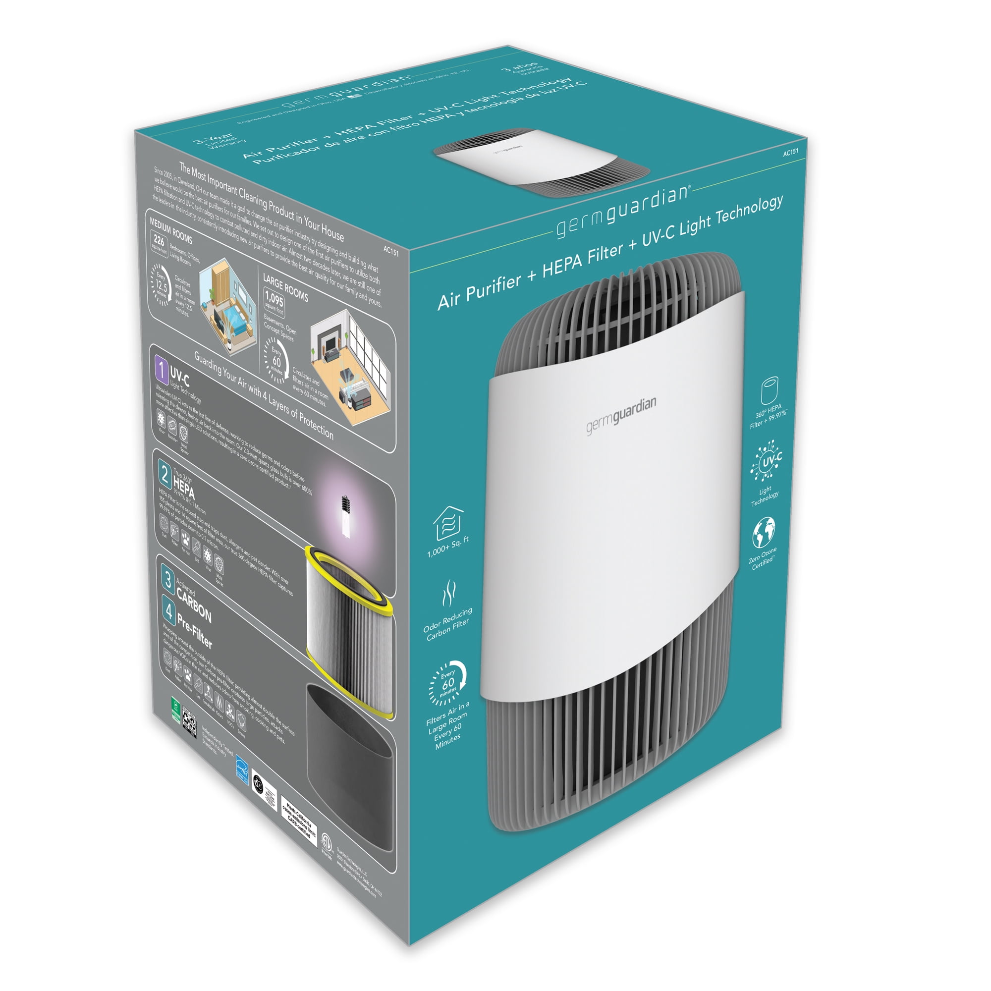 Guarding Your Air with 3 Layers of 360 Degree Protection: Genuine high-efficiency True 360 Degree HEPA PURE filter captures 99.97% of particles as small as 0.1 micron from all directions. With over 155 pleats and 14.0 square feet of filter area, our True HEPA PURE filter traps dust, pollen, harmful germs, and pet dander. Zero Ozone Certified: Ultraviolet – C (UV-C) acts as the ultimate line of defense, helping reduce airborne germs such as Staphylococcus Albus, Escherichia Coli, Aspergillus Niger, and Phi-X174 as well as airborne bacteria and mold spores*. Turbo charge your refresh with our UV-C optional setting. Our 2.3-watt quartz glass bulb is over 600% more effective than single LED-led solutions resulting in a ZERO OZONE verified product that releases cleaner, fresher air back into the room. Clean Air in 12.5 Minutes: Circulate and filter the air in a 146 sq. ft. room every 12.5 minutes or in a large 1,095 sq. ft. room every 60 minutes. Efficacy testing is performed in 30 cubic meter testing chambers to ensure accurate results and real-world replicable performance. Reduces Odors: Activated carbon pre-filter traps dust, pet hair, and other large particles while extending the life of the HEPA filter. Treated carbon absorbs volatile organic compounds from the air and reduces odors from smoking, cooking, and pets. ENERGY STAR Certified: Cleaning air since 2005! GermGuardian air purifiers are ENERGY STAR Certified, CARB (California Air Resource Board) Certified, ETL Certified, and Zero Ozone Verified! Quiet Operation: Choose from 3 speed options, with the lowest setting providing gentle white noise for a quiet, restful night’s sleep. Genuine GermGuardian Filters: Replacement filters for this air purifier are FLT151 HEPA Filter Model V. Genuine GermGuardian replacement filters for certified fit and maximum filtration. Off-brand filters often fail HEPA testing standards, fit incorrectly, reduce efficacy, and may cause damage to the air purifier. Filter Type: True HEPA