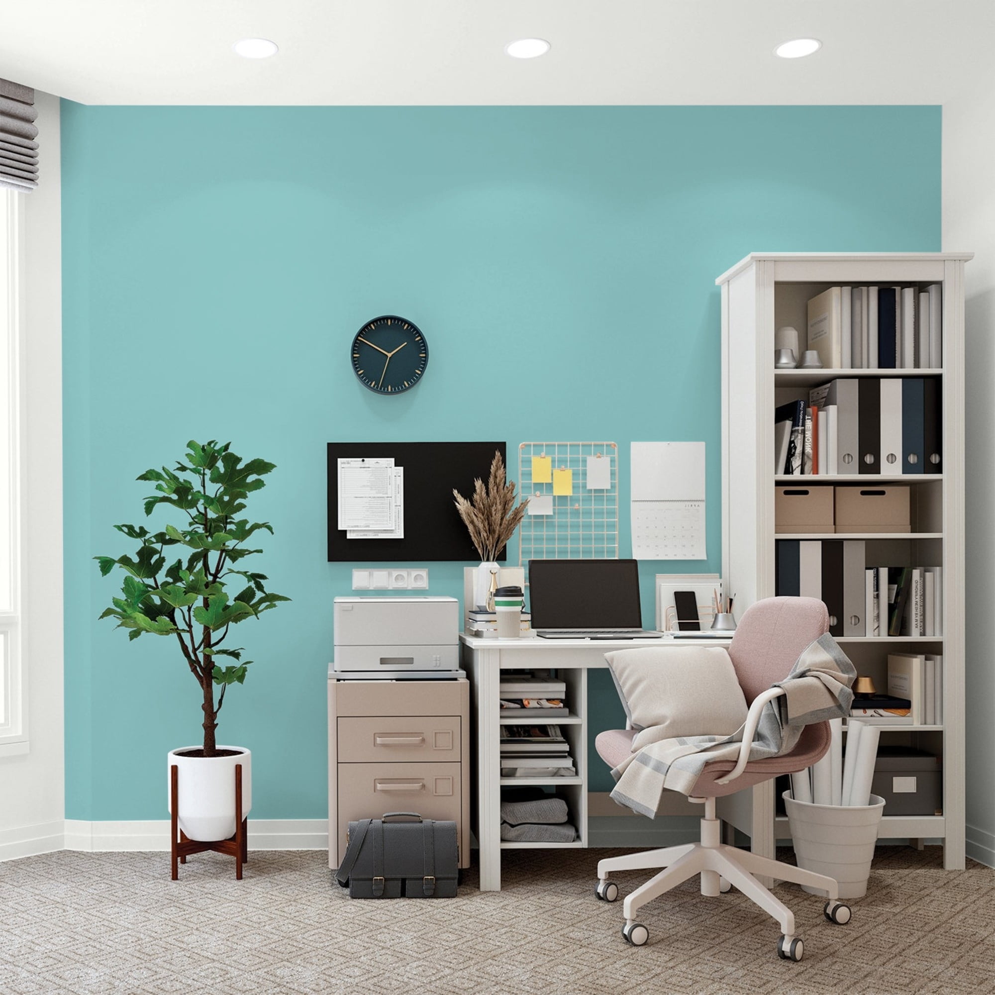 Glidden Fundamentals Interior Paint is a low-VOC, low-odor liquid paint that provides good hide, coverage, and washability. Recommended for use on properly prepared concrete/masonry, metal, drywall, plaster, and wood. Select the best sheen for your project. Flat is an ideal finish for ceilings, bedrooms and low traffic living areas. Eggshell is an ideal finish for walls in all living areas including kitchen, bathroom and living room. Semi-gloss is an ideal finish for trim and interior doors. Aqua Fiesta is a midtone, muted, tropical turquoise aqua and the undertone is aquamarine. This paint color is perfect for a bedroom, bathroom or kitchen. Combine it with light cream accents.