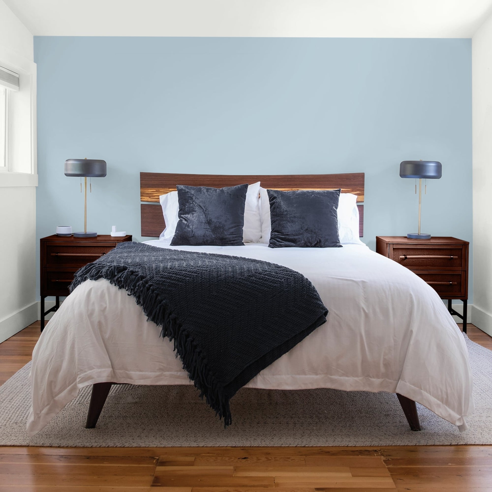Glidden Fundamentals Interior Paint is a low-VOC, low-odor liquid paint that provides good hide, coverage, and washability. Recommended for use on properly prepared concrete/masonry, metal, drywall, plaster, and wood. Select the best sheen for your project. Flat is an ideal finish for ceilings, bedrooms and low traffic living areas. Eggshell is an ideal finish for walls in all living areas including kitchen, bathroom and living room. Semi-gloss is an ideal finish for trim and interior doors. Chambray is a midtone, shaded, stormy blue and the undertone is a navy color. This color is great to paint an accent wall. Combine it with deeper blue gray accent wall.