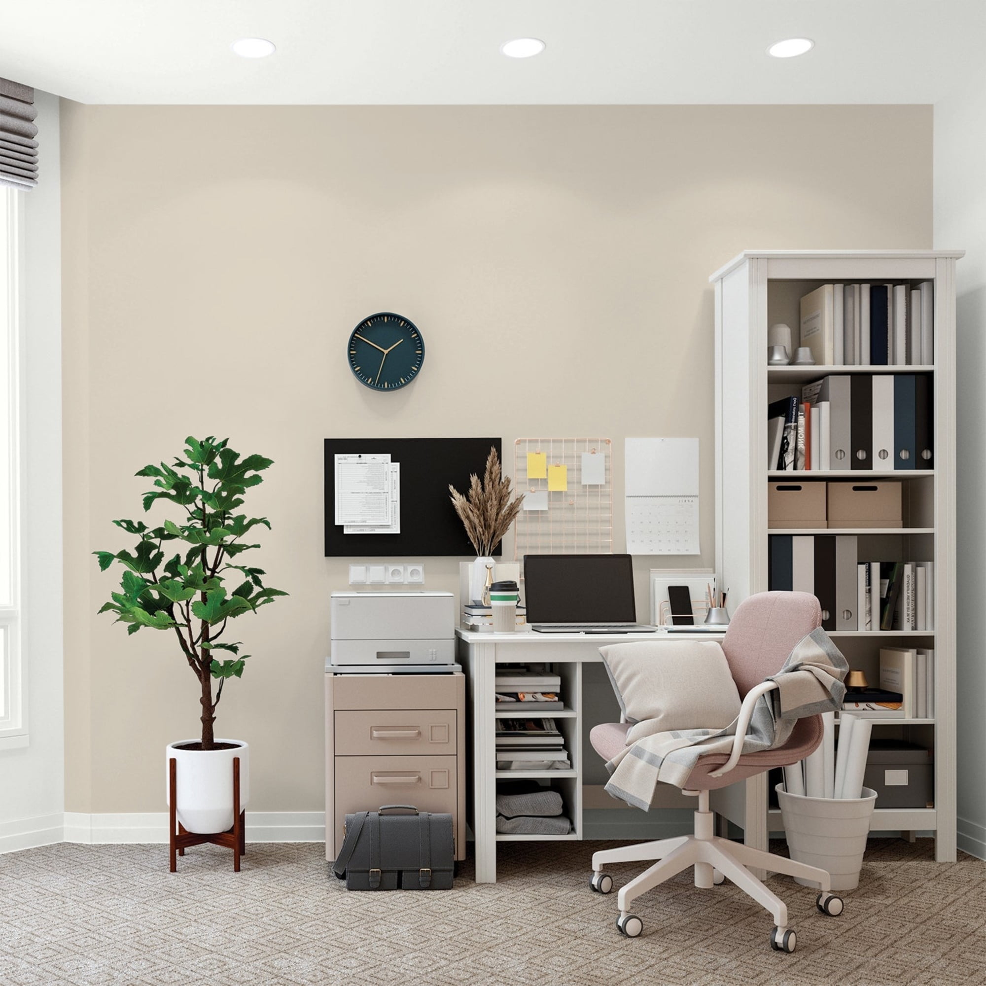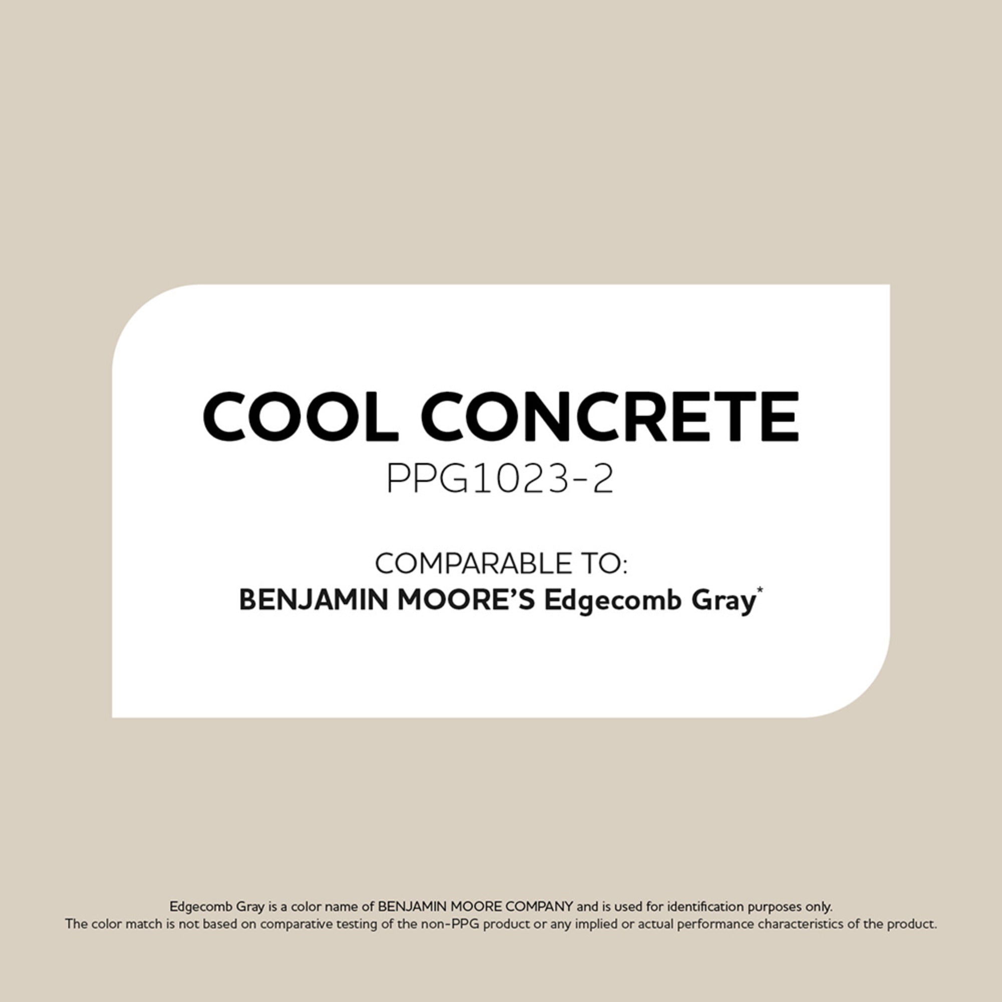 Glidden Fundamentals Interior Paint is a low-VOC, low-odor liquid paint that provides good hide, coverage, and washability. Recommended for use on properly prepared concrete/masonry, metal, drywall, plaster, and wood. Select the best sheen for your project. Flat is an ideal finish for ceilings, bedrooms and low traffic living areas. Eggshell is an ideal finish for walls in all living areas including kitchen, bathroom and living room. Semi-gloss is an ideal finish for trim and interior doors. Cool Concrete is a light, gray, yellow greige and the undertone is green. This paint color is perfect for a main wall or on kitchen cupboards. Combine it with deep-toned granite for a stunning room.