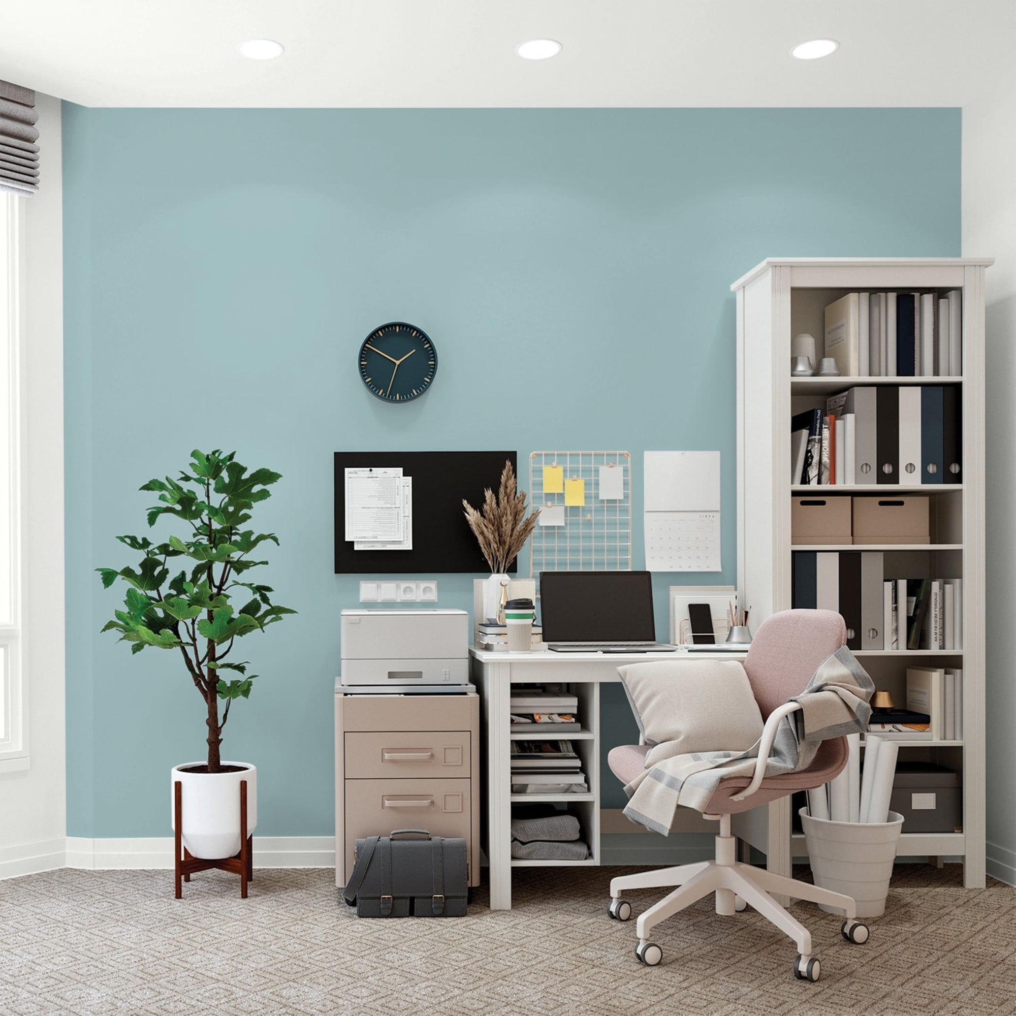 Glidden Fundamentals Interior Paint is a low-VOC, low-odor liquid paint that provides good hide, coverage, and washability. Recommended for use on properly prepared concrete/masonry, metal, drywall, plaster, and wood. Select the best sheen for your project. Flat is an ideal finish for ceilings, bedrooms and low traffic living areas. Eggshell is an ideal finish for walls in all living areas including kitchen, bathroom and living room. Semi-gloss is an ideal finish for trim and interior doors. Lazy River is a midtone, shaded, Caribbean aqua and the undertone is turquoise. For a bathroom this paint color is perfect. Combine it with soft off-white for a harmonious look.