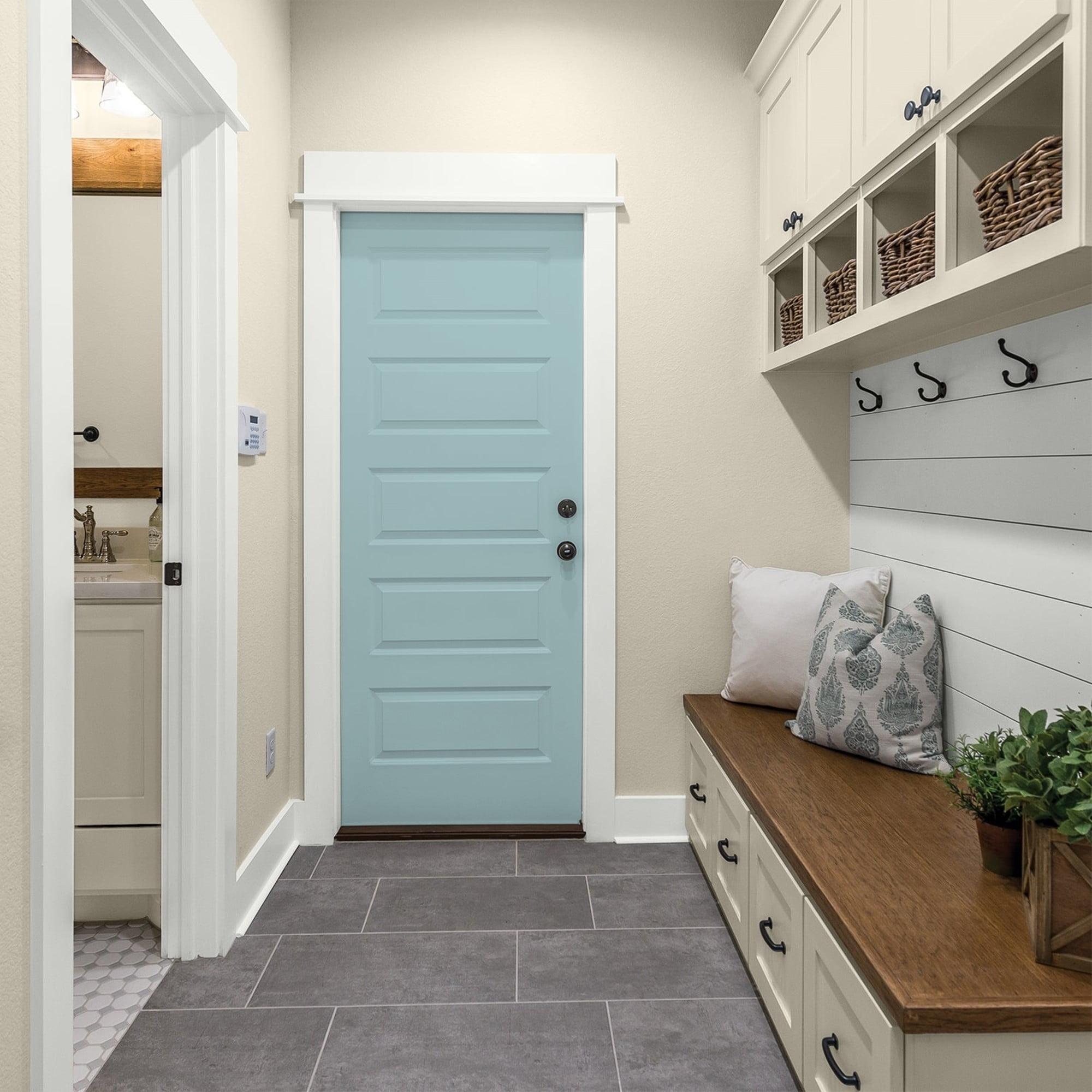 Glidden Fundamentals Interior Paint is a low-VOC, low-odor liquid paint that provides good hide, coverage, and washability. Recommended for use on properly prepared concrete/masonry, metal, drywall, plaster, and wood. Select the best sheen for your project. Flat is an ideal finish for ceilings, bedrooms and low traffic living areas. Eggshell is an ideal finish for walls in all living areas including kitchen, bathroom and living room. Semi-gloss is an ideal finish for trim and interior doors. Lazy River is a midtone, shaded, Caribbean aqua and the undertone is turquoise. For a bathroom this paint color is perfect. Combine it with soft off-white for a harmonious look.