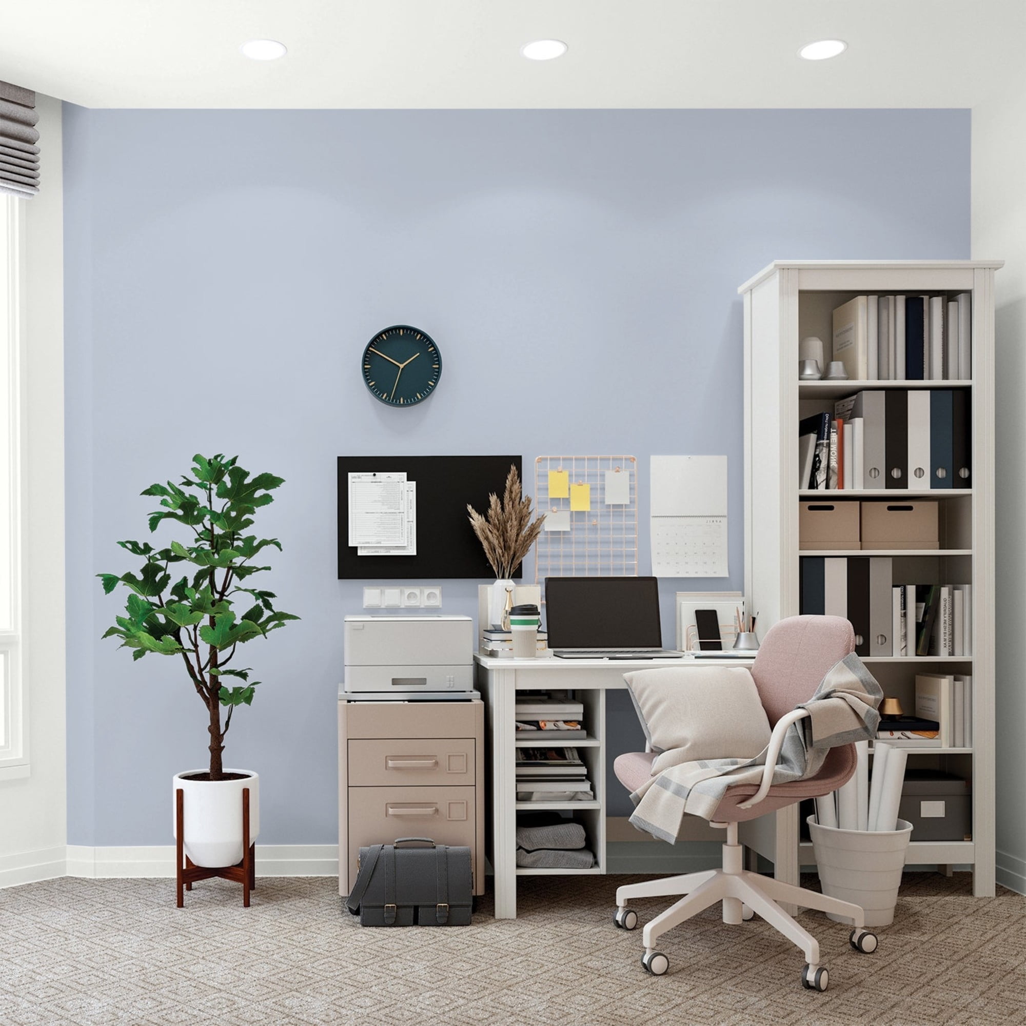 Glidden Fundamentals Interior Paint is a low-VOC, low-odor liquid paint that provides good hide, coverage, and washability. Recommended for use on properly prepared concrete/masonry, metal, drywall, plaster, and wood. Select the best sheen for your project. Flat is an ideal finish for ceilings, bedrooms and low traffic living areas. Eggshell is an ideal finish for walls in all living areas including kitchen, bathroom and living room. Semi-gloss is an ideal finish for trim and interior doors. Northern Exposure is a soft, shaded, enchanting blue-purple and the undertone is misty. This paint color is perfect for a main wall in any interior. Combine it with black trim.