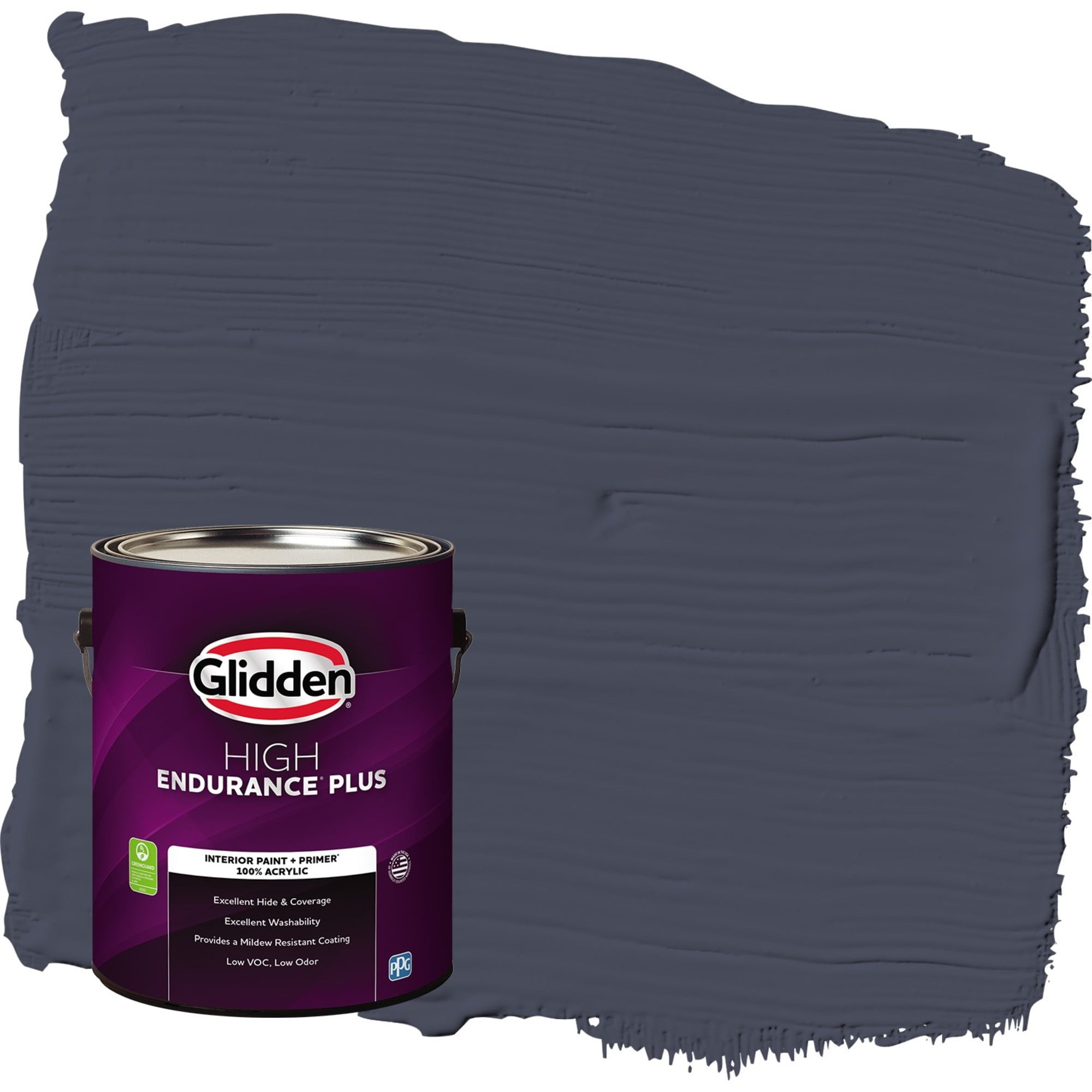 Glidden High Endurance Plus Interior Paint + Primer is a high quality, interior 100% acrylic paint and primer in one, offered at an exceptional price. This low odor, Zero VOC* paint provides outstanding hide and coverage and is highly scrubbable, washable and stain resistant, making it a great choice for any interior paint project. *Colorants added to this base paint may increase VOC level significantly depending on color choices. Black Flame is a dark, cool, mulberry black and the undertone is a royal blue. This paint color is perfect to make a statement in a dining room. Combine it with bright and vibrant artwork and creamy white trim.