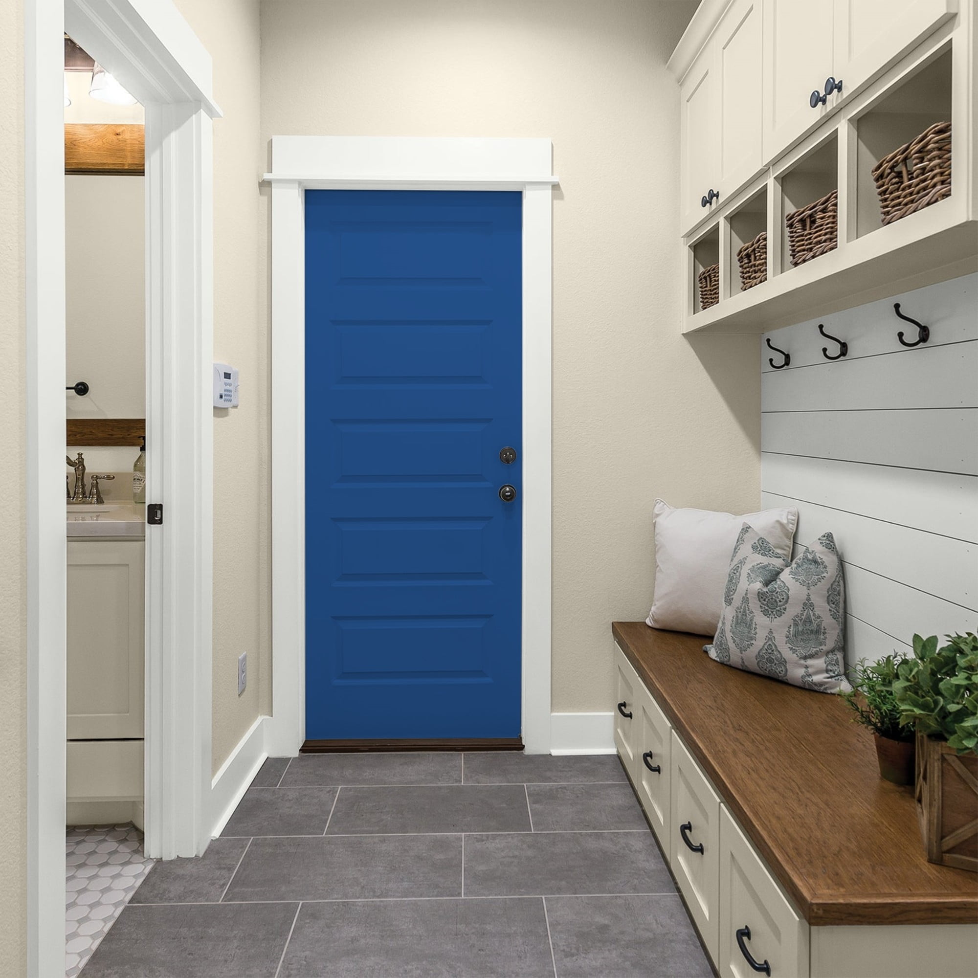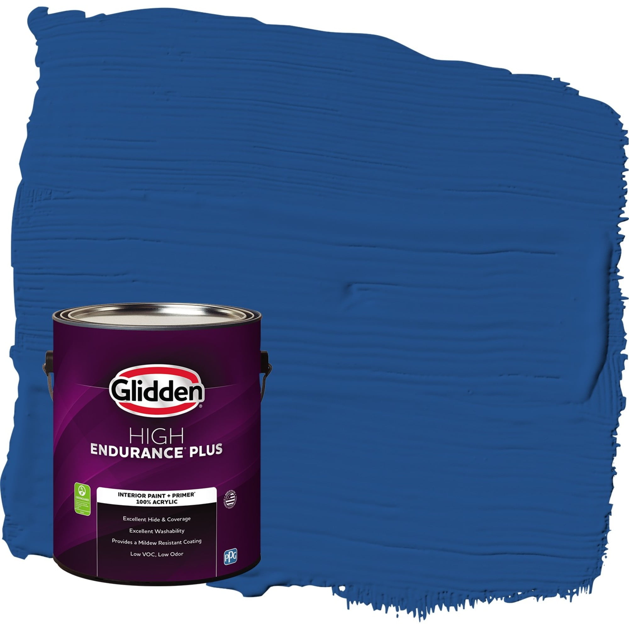 Glidden High Endurance Plus Interior Paint + Primer is a high quality, interior 100% acrylic paint and primer in one, offered at an exceptional price. This low odor, Zero VOC* paint provides outstanding hide and coverage and is highly scrubbable, washable and stain resistant, making it a great choice for any interior paint project. *Colorants added to this base paint may increase VOC level significantly depending on color choices. Brilliant Blue is a dark, muted, crystal lake blue and the undertone is night sky. This paint color is perfect for a front door or an accent wall. Combine it with a lighter shade of this color and shades of sand.