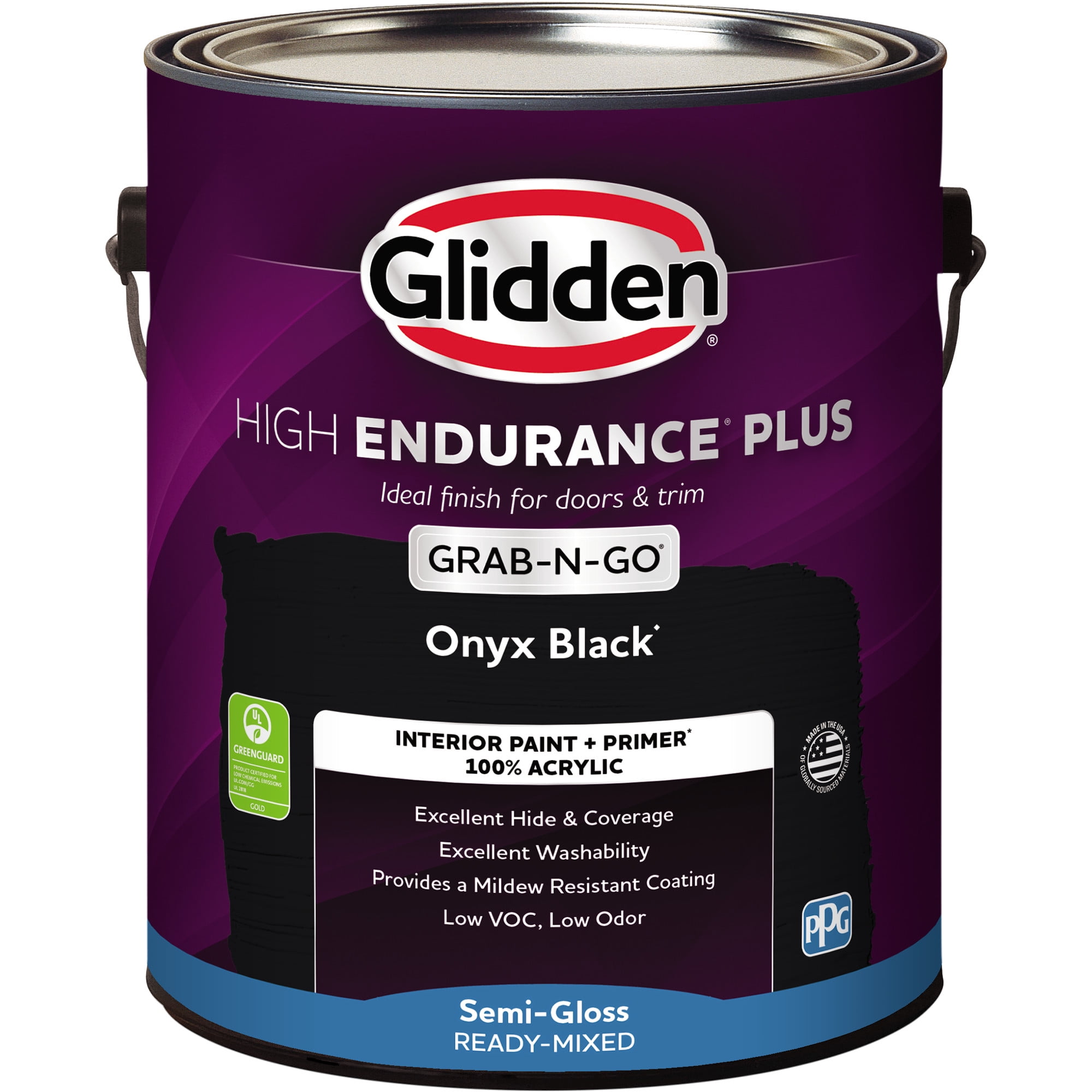 Interior liquid wall paint + primer* all-in-one 100% acrylic ready-mixed, grab-n-go paint in our most popular colors Excellent hide & coverage up to 400 sq. ft. per gallon Excellent Washability Provides a mildew resistant coating Low VOC, low odor; Dry time 30-60 minutes, Recoat 2-4 hours Glidden High Endurance Plus Interior has achieved GREENGUARD GOLD Certification