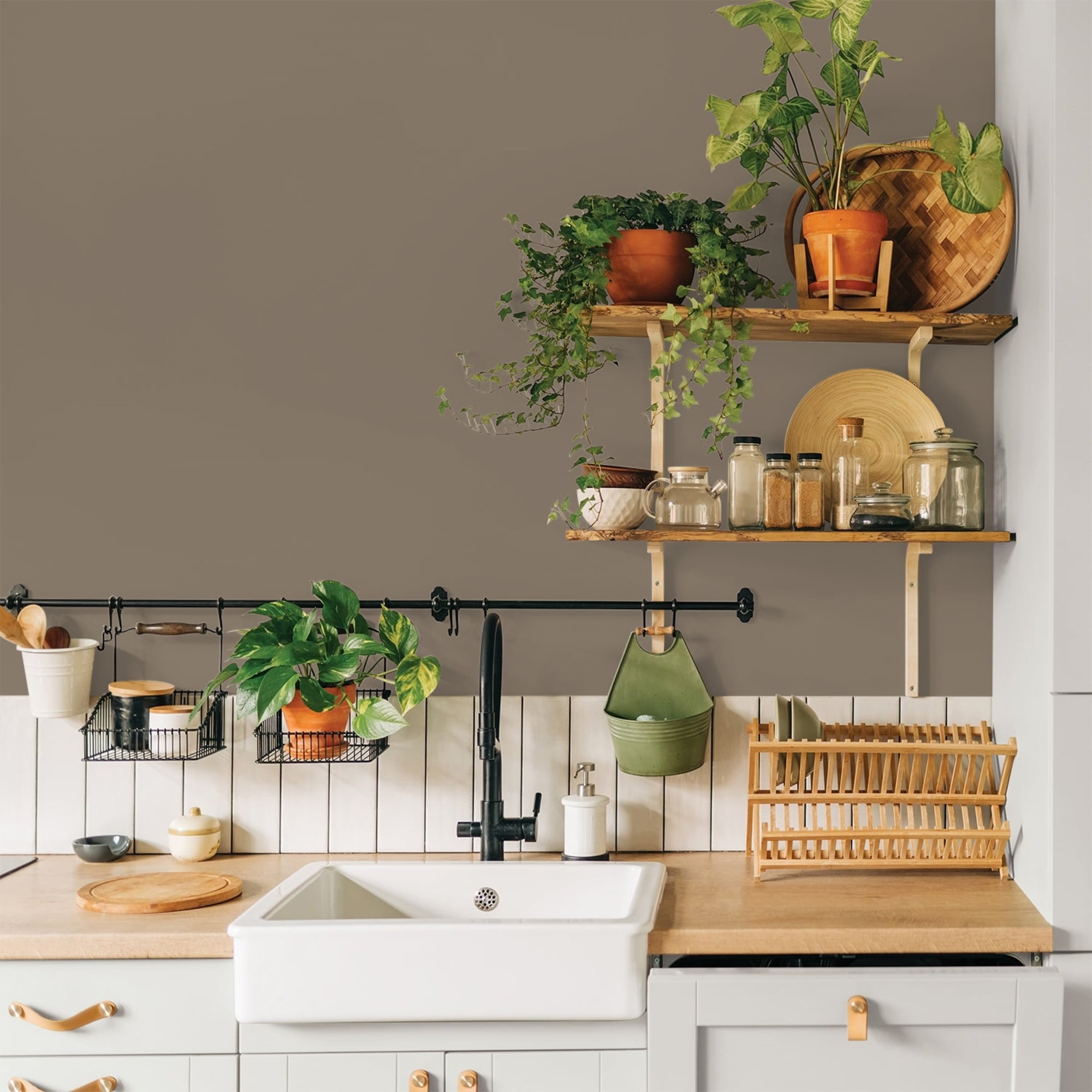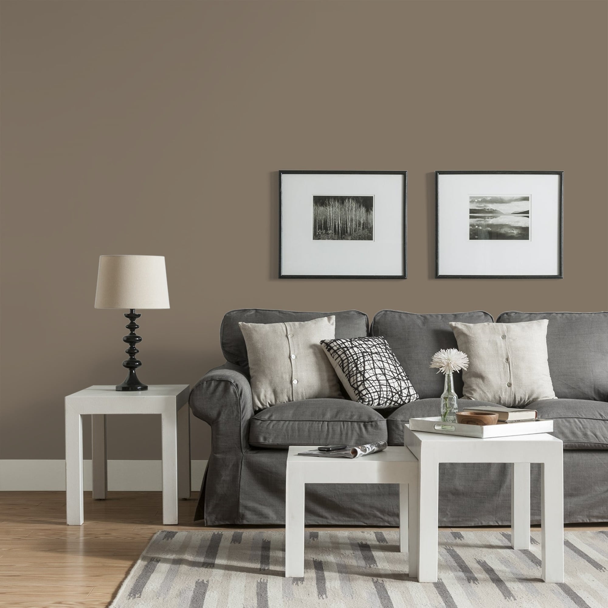 Glidden One Coat Interior is a super-premium quality paint that provides in one coat coverage*, an exceptional hide and stain blocking finish. This Low odor/ Low VOC formula has excellent scrubbability so it stand up to frequent cleanings. Ideal for use on properly prepared interior walls, ceilings, or trim composed of new or previously painted drywall, plaster, masonry, wood and metal. Available in Flat, Eggshell, Semi-Gloss Sheens. Clam Shell is a deep, gray, clay beige and the undertone is khaki. This paint color is perfect for interior or exterior walls. Combine it with lighter greiges or soft gold-toned accents.