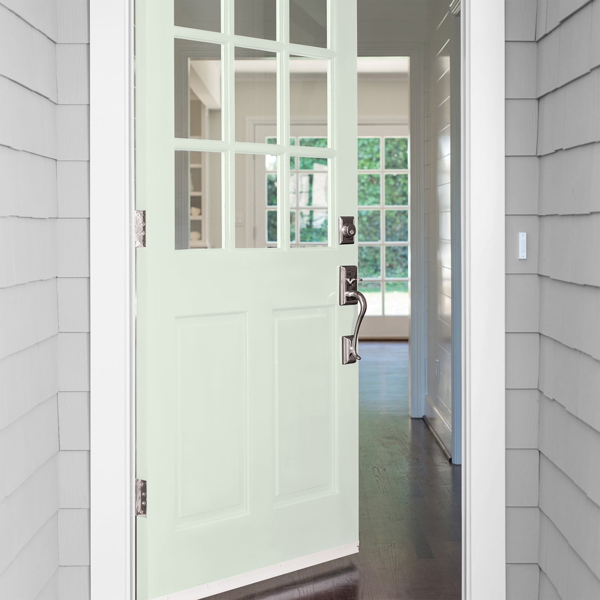 Glidden One Coat Exterior Paint is a super-premium quality paint that provides in one coat coverage* an enhance UV protection finish. This 100% acrylic paint provides a mildew resistant coating, excellent hide and adhesion, and exceptional resistance to fading, cracking & peeling on many exterior projects including properly prepared, exterior wood, brick, masonry, concrete, weathered aluminum, and primed metal substrates. Available in Flat, Satin, Semi-Gloss Sheens. Cloudy Day is a pale, shaded, pasture green and the undertone is mint. This color is perfect for a bedroom or to create a spa-like feel in your bathroom. Combine it with white or deep-toned woods and scarlet or plum accents.