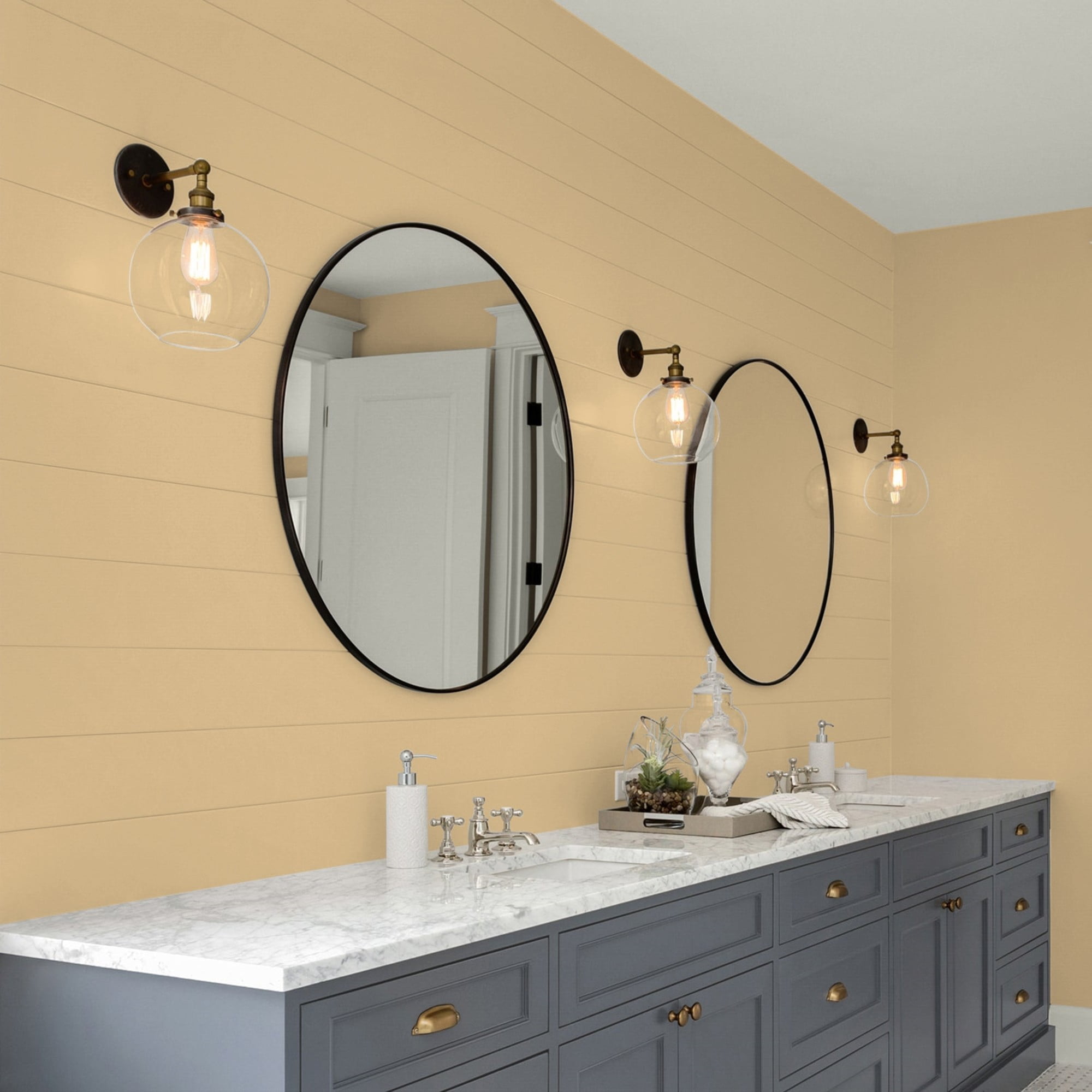 Glidden One Coat Interior is a super-premium quality paint that provides in one coat coverage*, an exceptional hide and stain blocking finish. This Low odor/ Low VOC formula has excellent scrubbability so it stand up to frequent cleanings. Ideal for use on properly prepared interior walls, ceilings, or trim composed of new or previously painted drywall, plaster, masonry, wood and metal. Available in Flat, Eggshell, Semi-Gloss Sheens. Craftsman Gold is a midtone, muted, sun-kissed yellow and the undertone is lemon. In a dining room this paint color will be beautiful. Combine it with white trim and touches of fine dark woods.