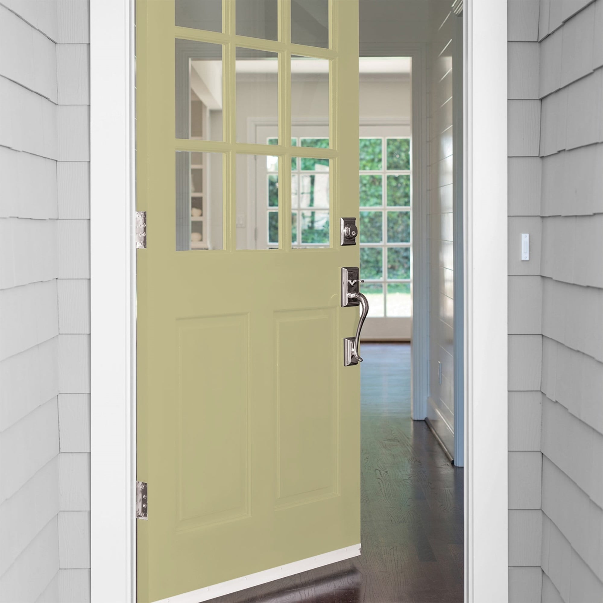 Glidden One Coat Exterior Paint is a super-premium quality paint that provides in one coat coverage* an enhance UV protection finish. This 100% acrylic paint provides a mildew resistant coating, excellent hide and adhesion, and exceptional resistance to fading, cracking & peeling on many exterior projects including properly prepared, exterior wood, brick, masonry, concrete, weathered aluminum, and primed metal substrates. Available in Flat, Satin, Semi-Gloss Sheens. Cress Green is a midtone, shaded, grassy green and the undertone is a foliage green. This paint color is perfect for a chic kitchen. Combine it with stainless steel appliances and black accents.