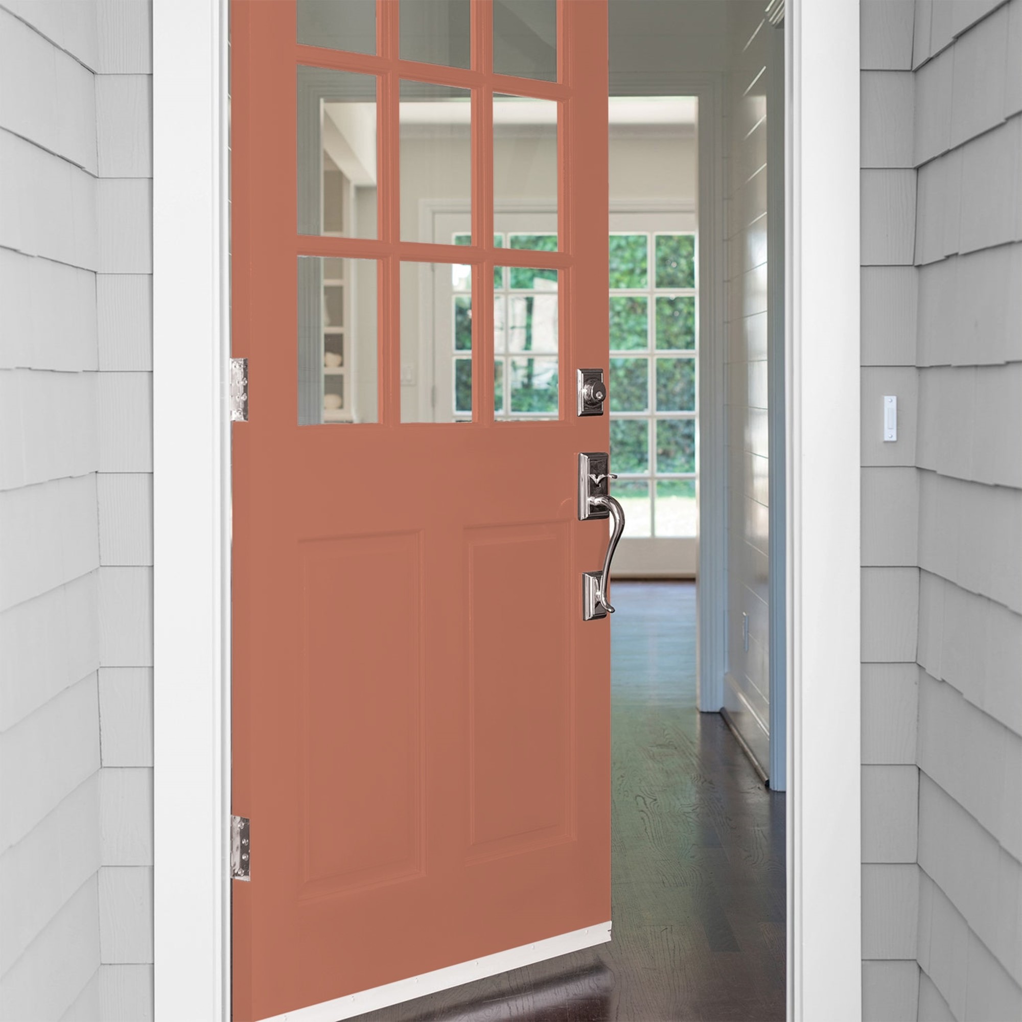 Glidden One Coat Exterior Paint is a super-premium quality paint that provides in one coat coverage* an enhance UV protection finish. This 100% acrylic paint provides a mildew resistant coating, excellent hide and adhesion, and exceptional resistance to fading, cracking & peeling on many exterior projects including properly prepared, exterior wood, brick, masonry, concrete, weathered aluminum, and primed metal substrates. Available in Flat, Satin, Semi-Gloss Sheens. Crushed Cinnamon is a deep, muted, apricot orange and the undertone is cinnamon. This paint color is perfect for a glowing accent wall. Combine it with deep mysterious blues for contrast.