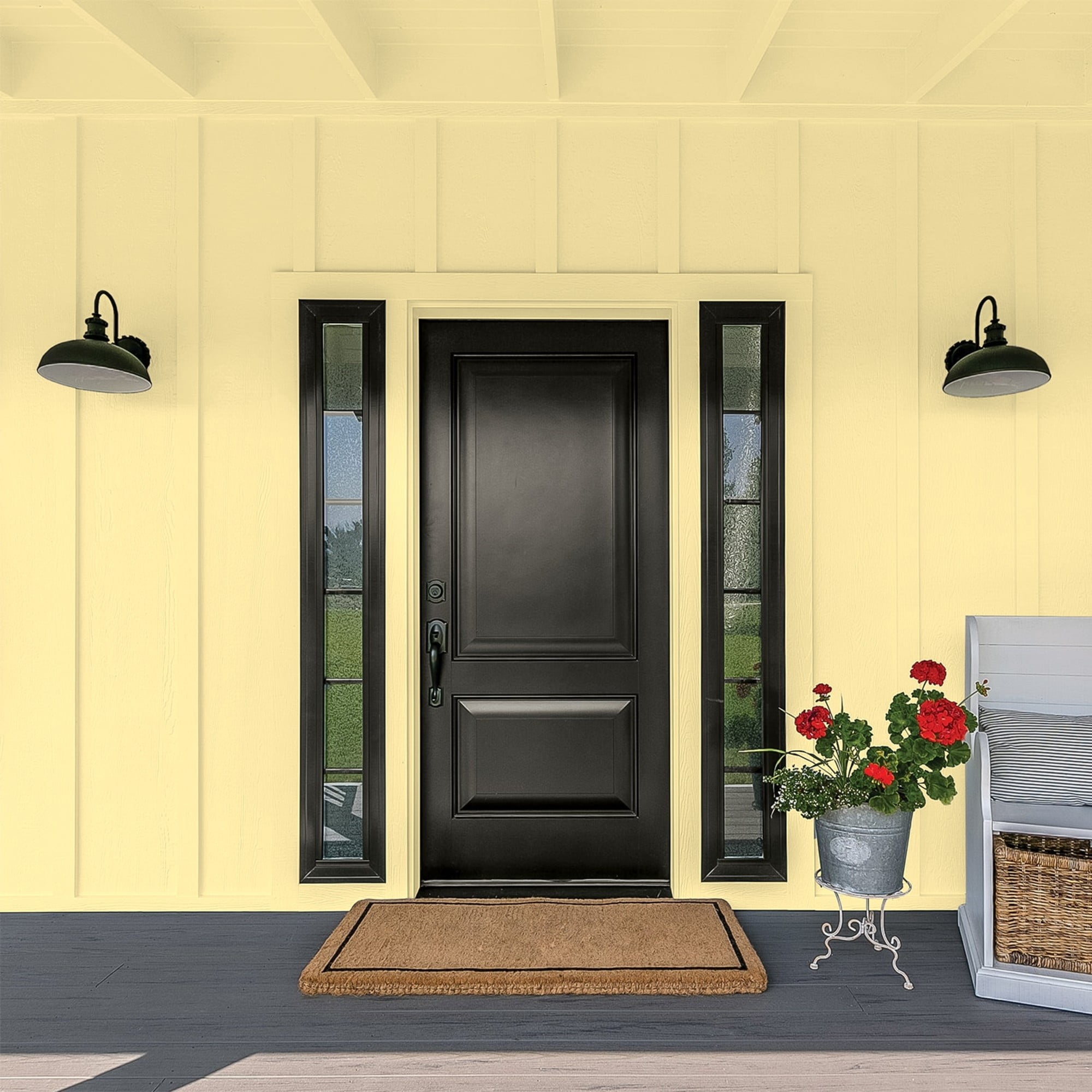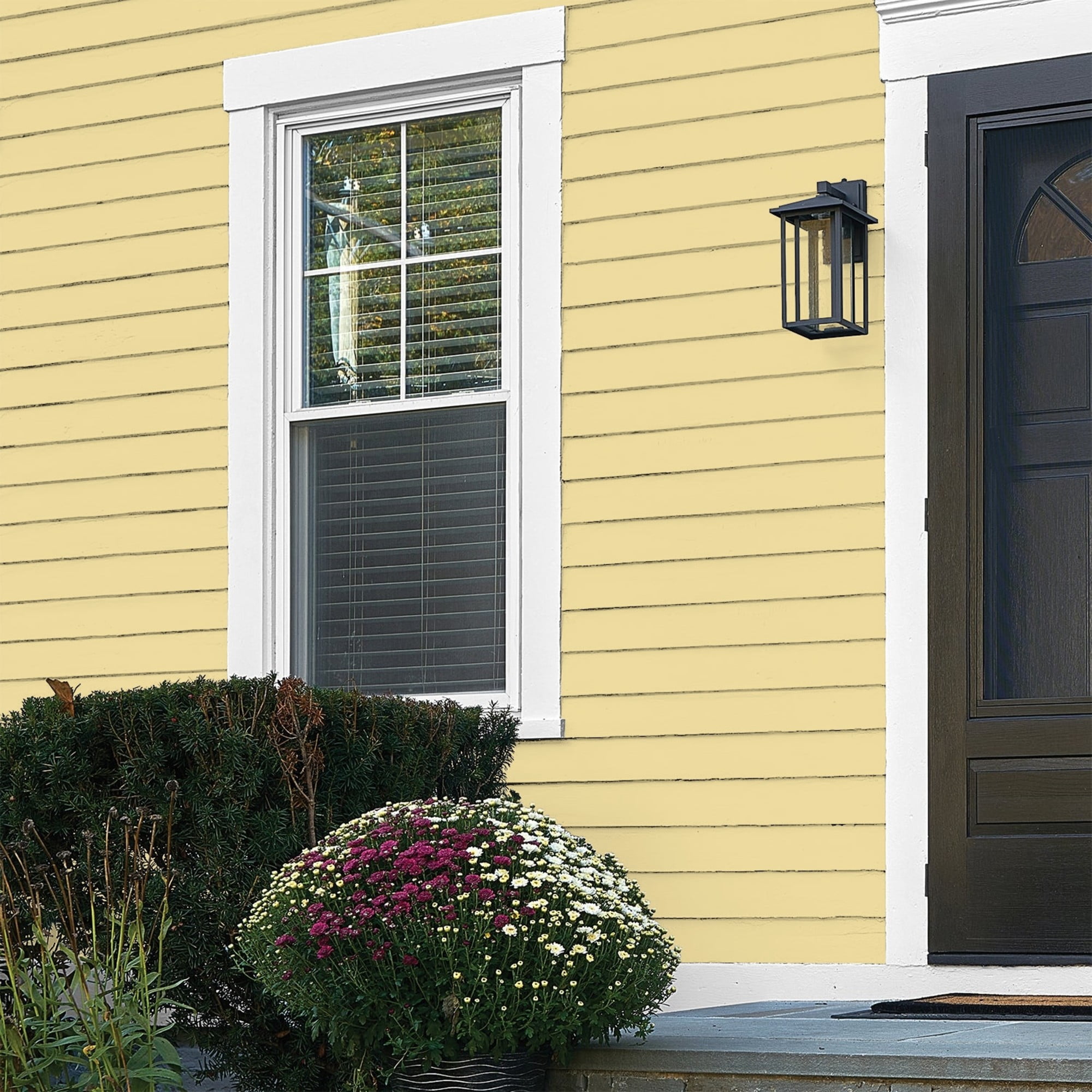 Glidden One Coat Exterior Paint is a super-premium quality paint that provides in one coat coverage* an enhance UV protection finish. This 100% acrylic paint provides a mildew resistant coating, excellent hide and adhesion, and exceptional resistance to fading, cracking & peeling on many exterior projects including properly prepared, exterior wood, brick, masonry, concrete, weathered aluminum, and primed metal substrates. Available in Flat, Satin, Semi-Gloss Sheens. Demeter is a midtone, muted, zesty citrus yellow and the undertone is mustard. This paint color makes any room look perfect desired. Combine it with off-white trim for a stunning decor.