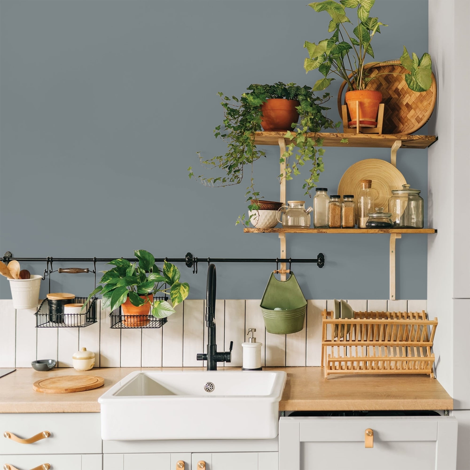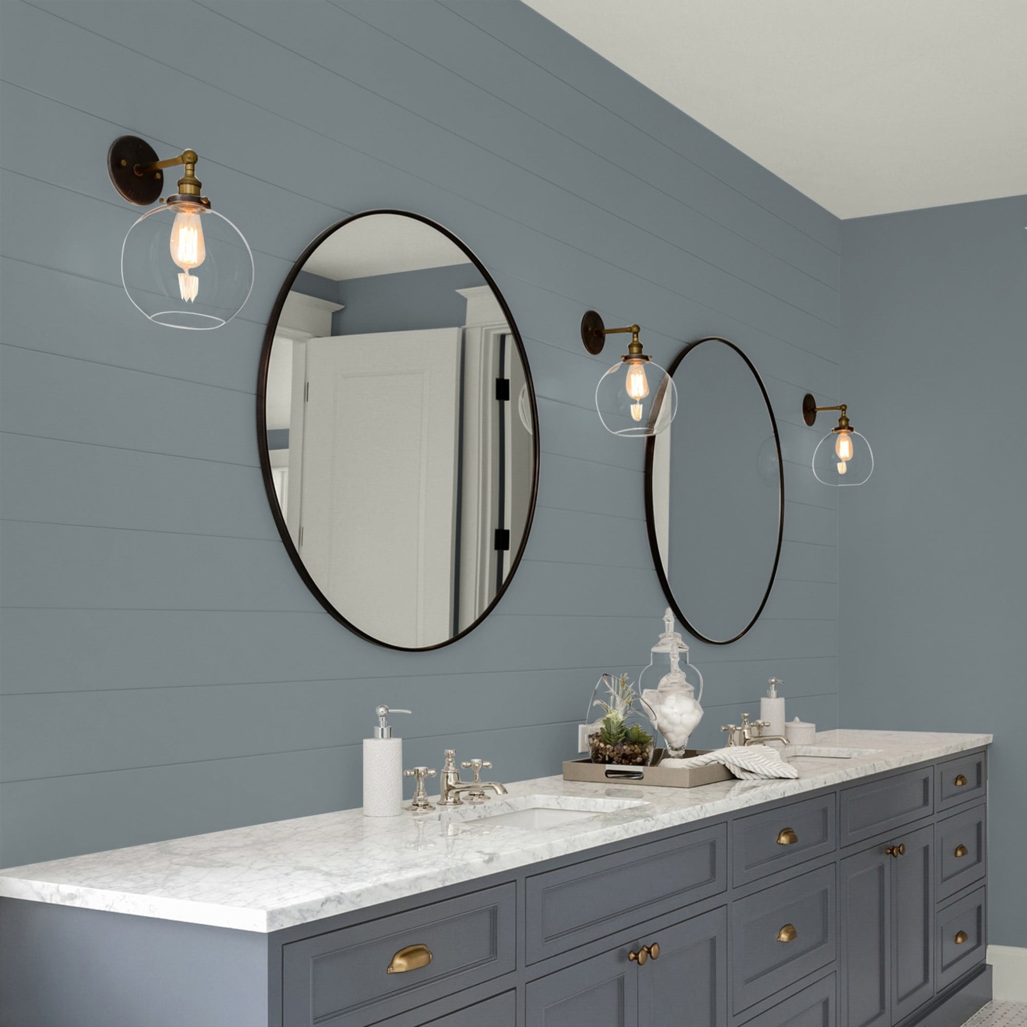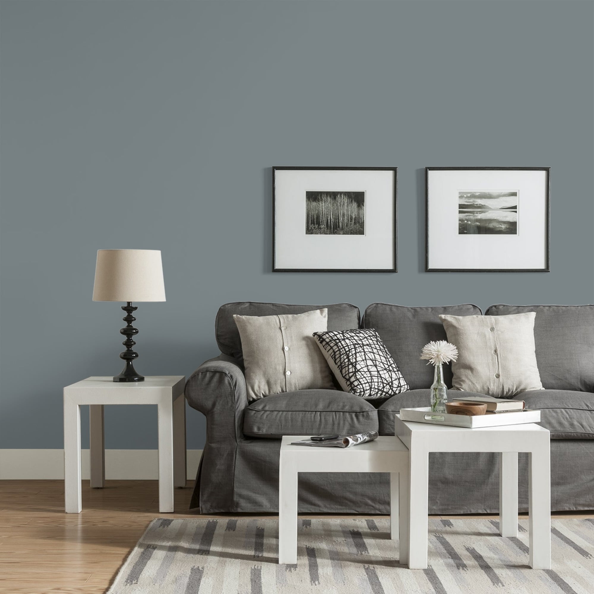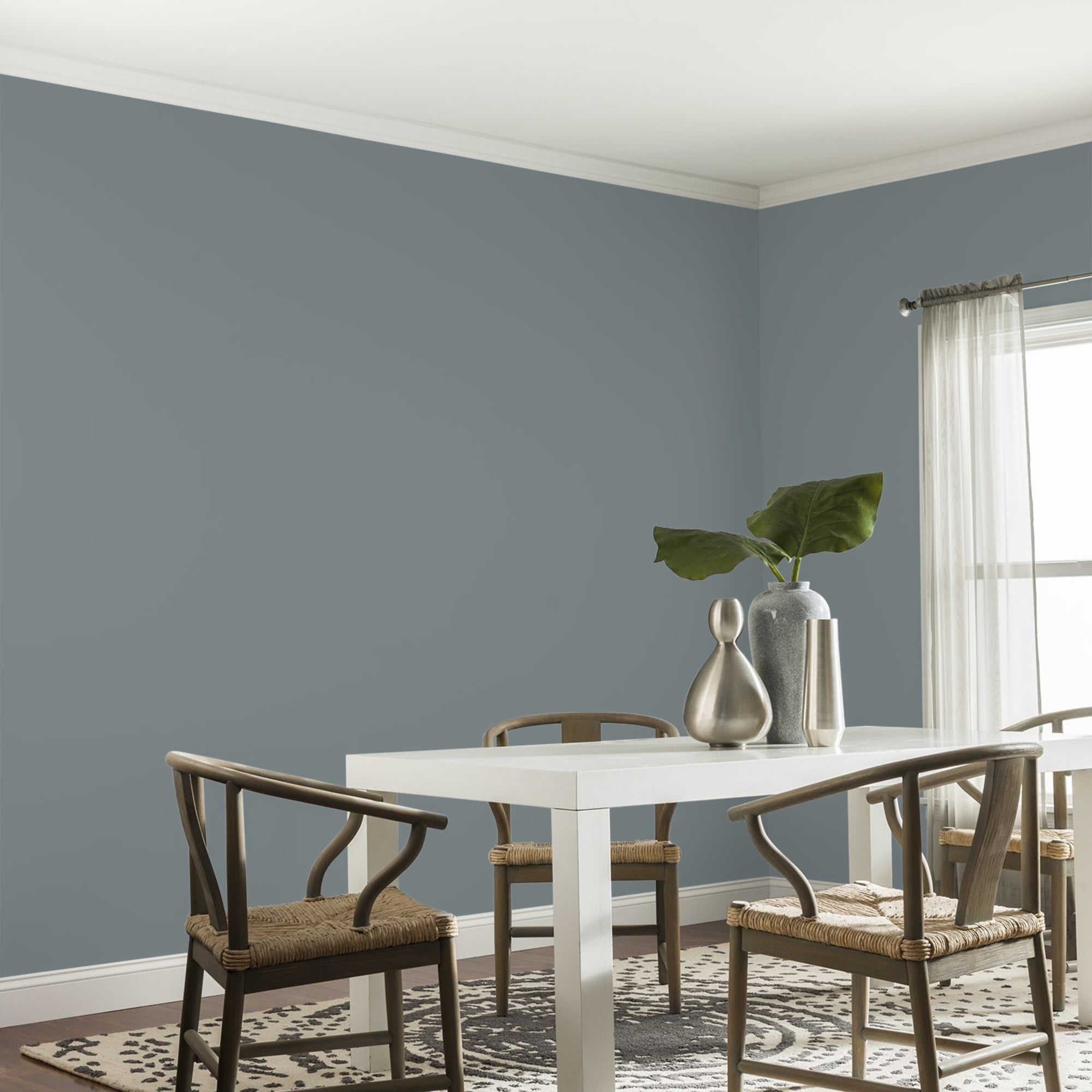 Glidden One Coat Interior is a super-premium quality paint that provides in one coat coverage*, an exceptional hide and stain blocking finish. This Low odor/ Low VOC formula has excellent scrubbability so it stand up to frequent cleanings. Ideal for use on properly prepared interior walls, ceilings, or trim composed of new or previously painted drywall, plaster, masonry, wood and metal. Available in Flat, Eggshell, Semi-Gloss Sheens. Garrison Gray is a saturated, gray, indigo blue and the undertone is a cobalt blue. This paint color is perfect to make a statement as an accent wall. Combine it with shades of lemony yellow for a soft glow.