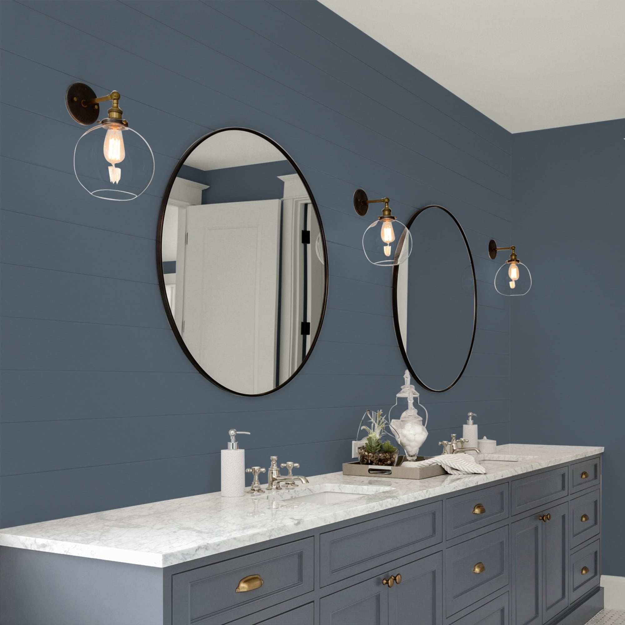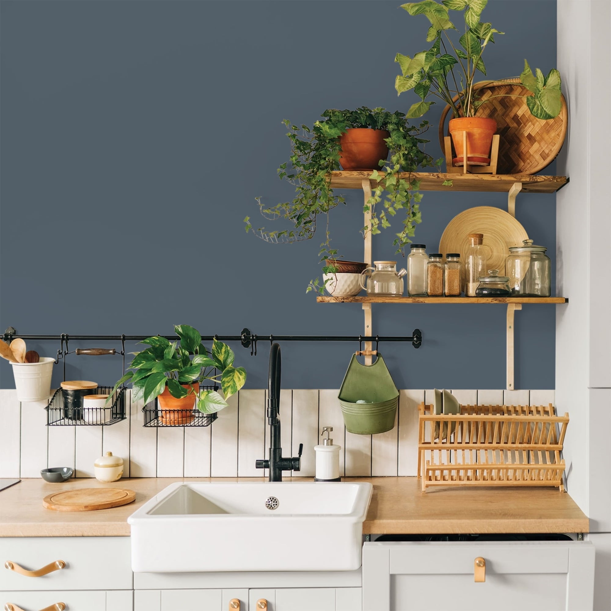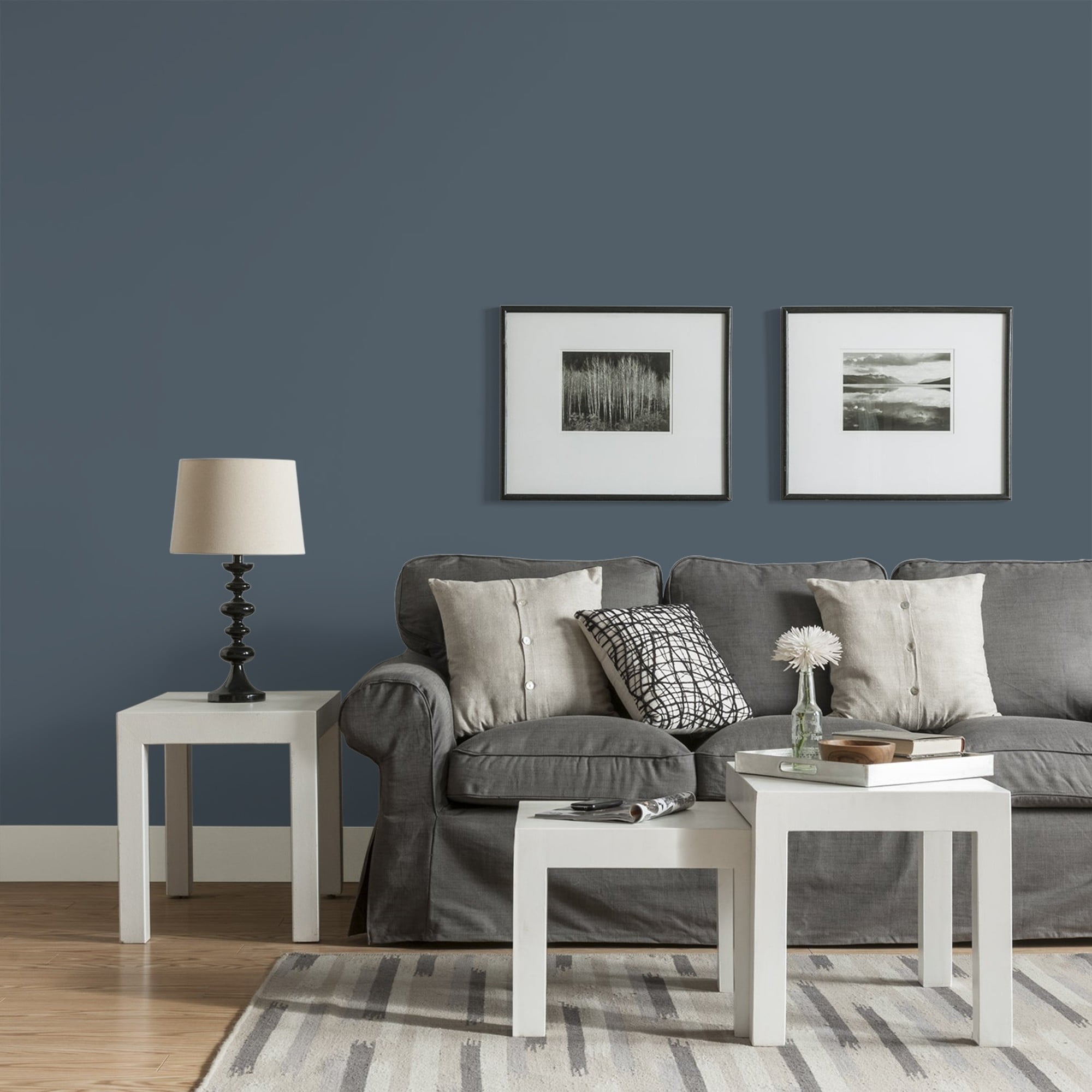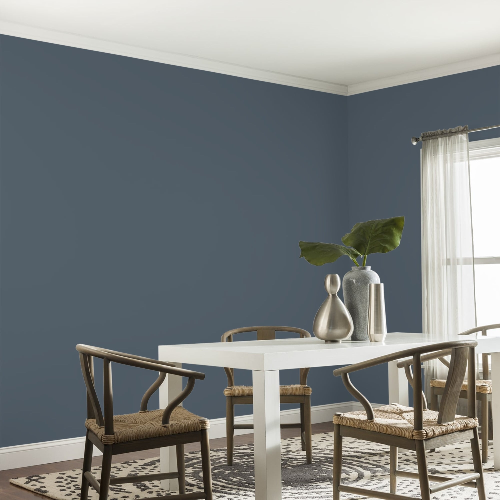 Glidden One Coat Interior is a super-premium quality paint that provides in one coat coverage*, an exceptional hide and stain blocking finish. This Low odor/ Low VOC formula has excellent scrubbability so it stand up to frequent cleanings. Ideal for use on properly prepared interior walls, ceilings, or trim composed of new or previously painted drywall, plaster, masonry, wood and metal. Available in Flat, Eggshell, Semi-Gloss Sheens. Goblin is a dark, gray, orchid blue and the undertone is violet. This paint color is perfect for an accent in a study area. Combine it with light gray walls and golden wood tones in furniture.