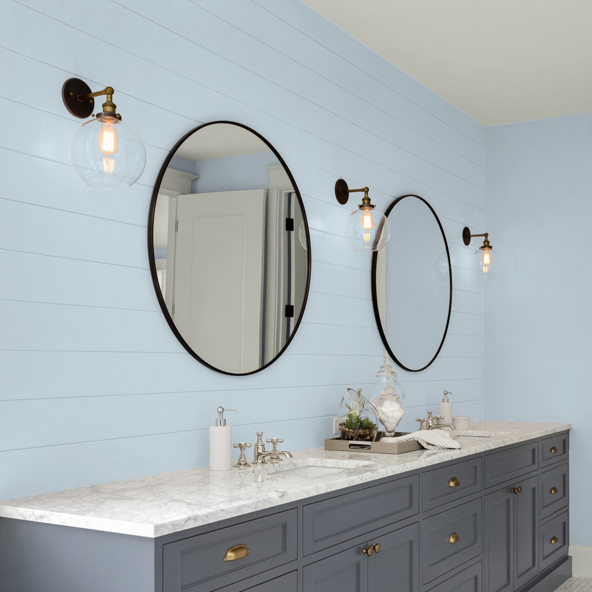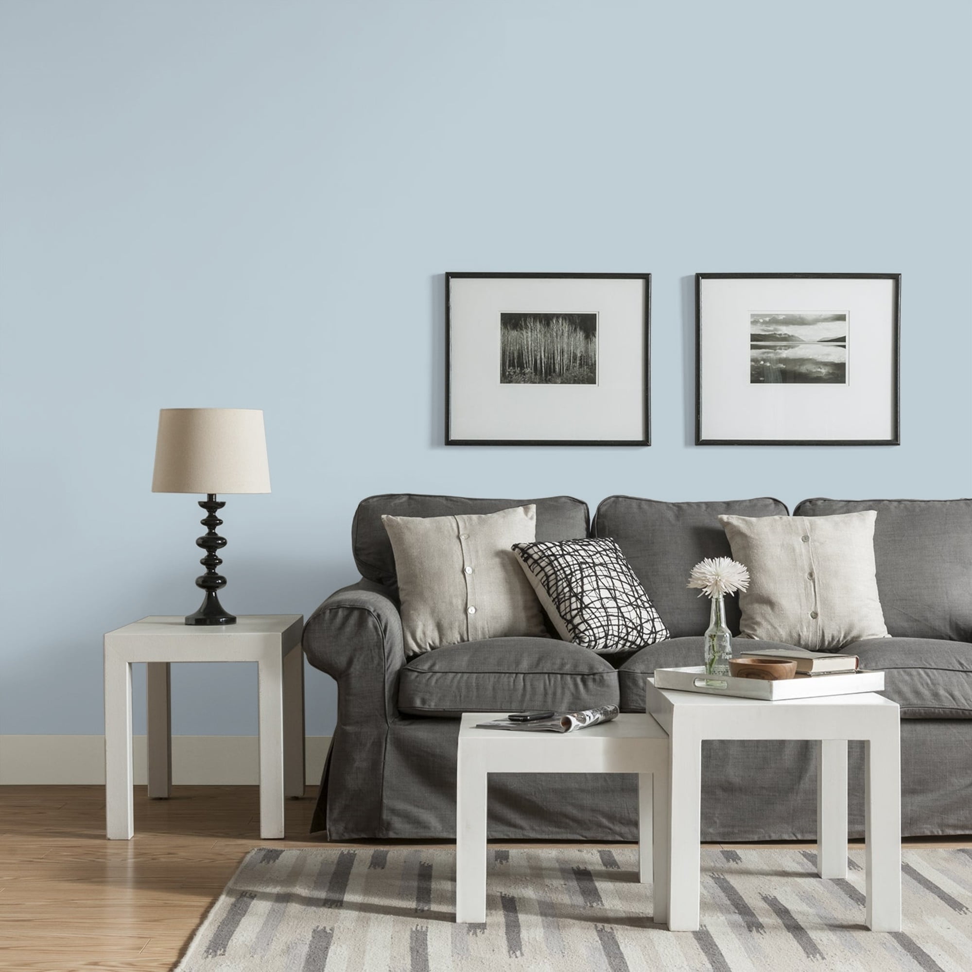 Glidden One Coat Interior is a super-premium quality paint that provides in one coat coverage*, an exceptional hide and stain blocking finish. This Low odor/ Low VOC formula has excellent scrubbability so it stand up to frequent cleanings. Ideal for use on properly prepared interior walls, ceilings, or trim composed of new or previously painted drywall, plaster, masonry, wood and metal. Available in Flat, Eggshell, Semi-Gloss Sheens. Keepsakes is a light, gray, baby blue and the undertone is indigo. This paint color is perfect for a kitchen or to create a spa-like bedroom or bathroom. Combine it with white trim for fresh appeal.