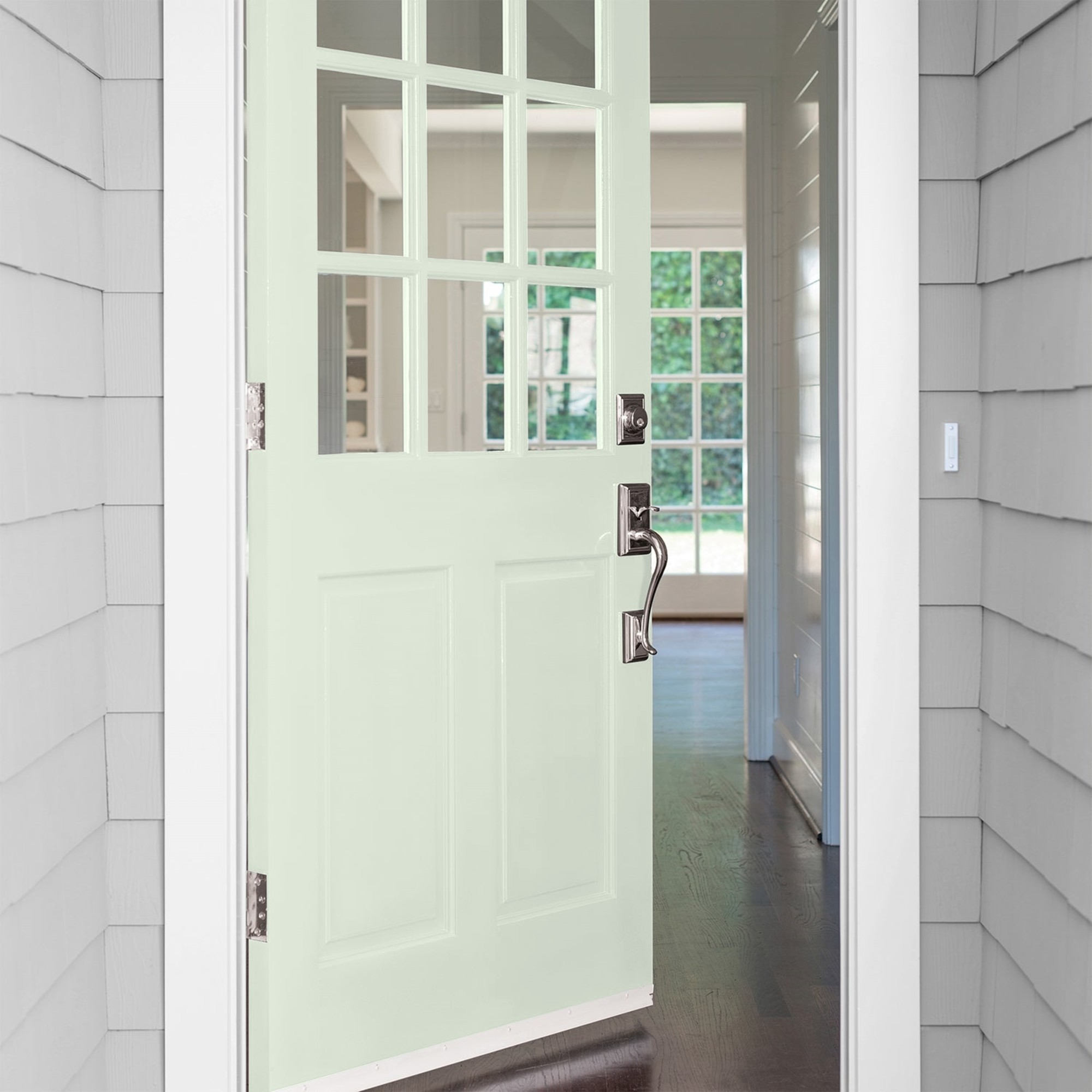 Glidden One Coat Exterior Paint is a super-premium quality paint that provides in one coat coverage* an enhance UV protection finish. This 100% acrylic paint provides a mildew resistant coating, excellent hide and adhesion, and exceptional resistance to fading, cracking & peeling on many exterior projects including properly prepared, exterior wood, brick, masonry, concrete, weathered aluminum, and primed metal substrates. Available in Flat, Satin, Semi-Gloss Sheens. Lime Daiquiri is a pale, neutral, woodland green and the undertone is yellow. This paint color is perfect for a crisp, clean look. Combine it with white trim.