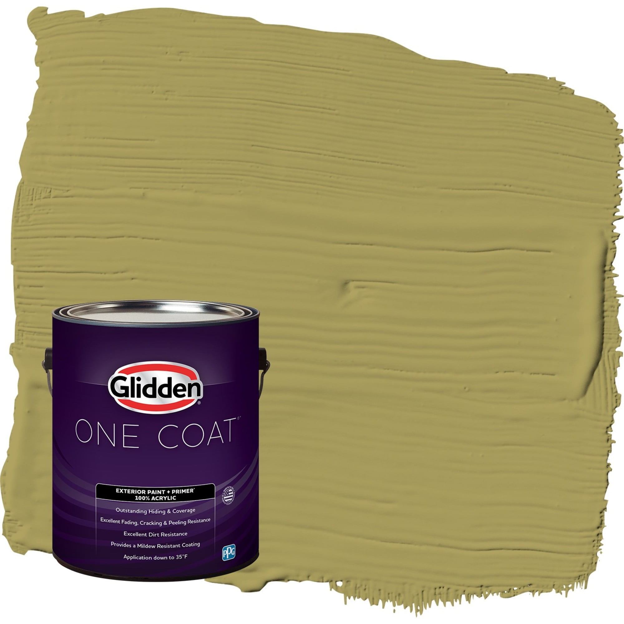 Glidden One Coat Exterior Paint is a super-premium quality paint that provides in one coat coverage* an enhance UV protection finish. This 100% acrylic paint provides a mildew resistant coating, excellent hide and adhesion, and exceptional resistance to fading, cracking & peeling on many exterior projects including properly prepared, exterior wood, brick, masonry, concrete, weathered aluminum, and primed metal substrates. Available in Flat, Satin, Semi-Gloss Sheens. Loveliest Leaves is a deep, subdued, grassy green and the undertone is a foliage green. This paint color is perfect for a man cave or room to . Combine it with accents of dusty orange and earthy reds for a touch of nature.