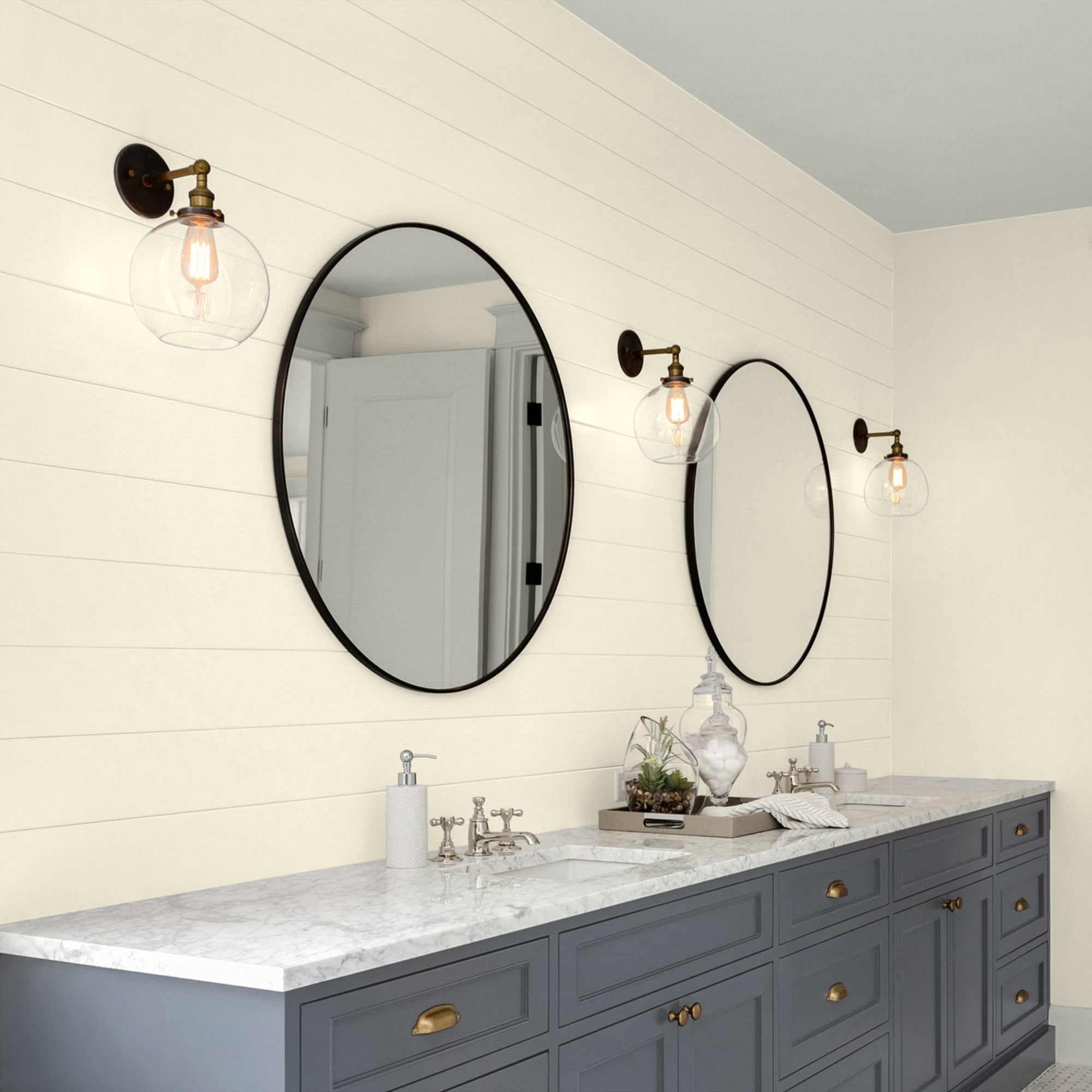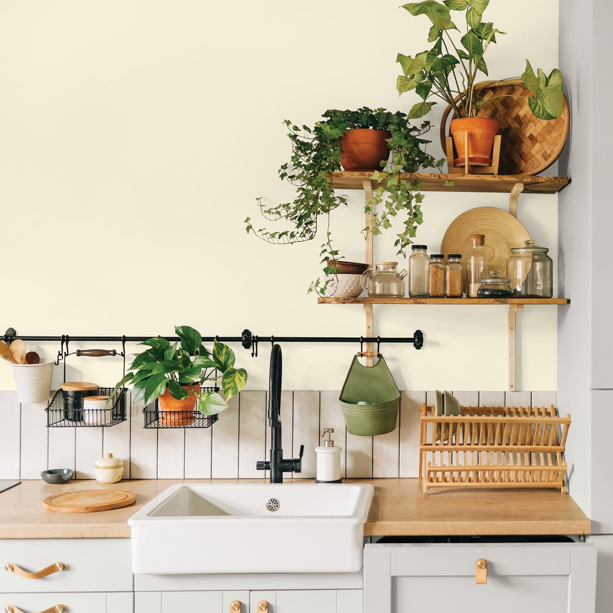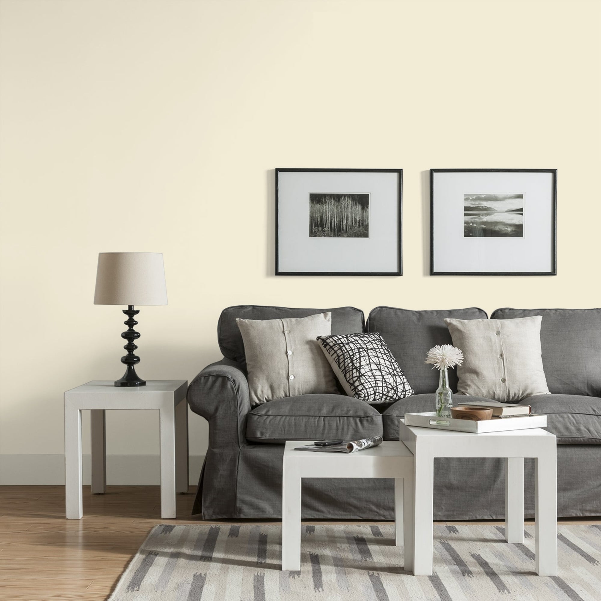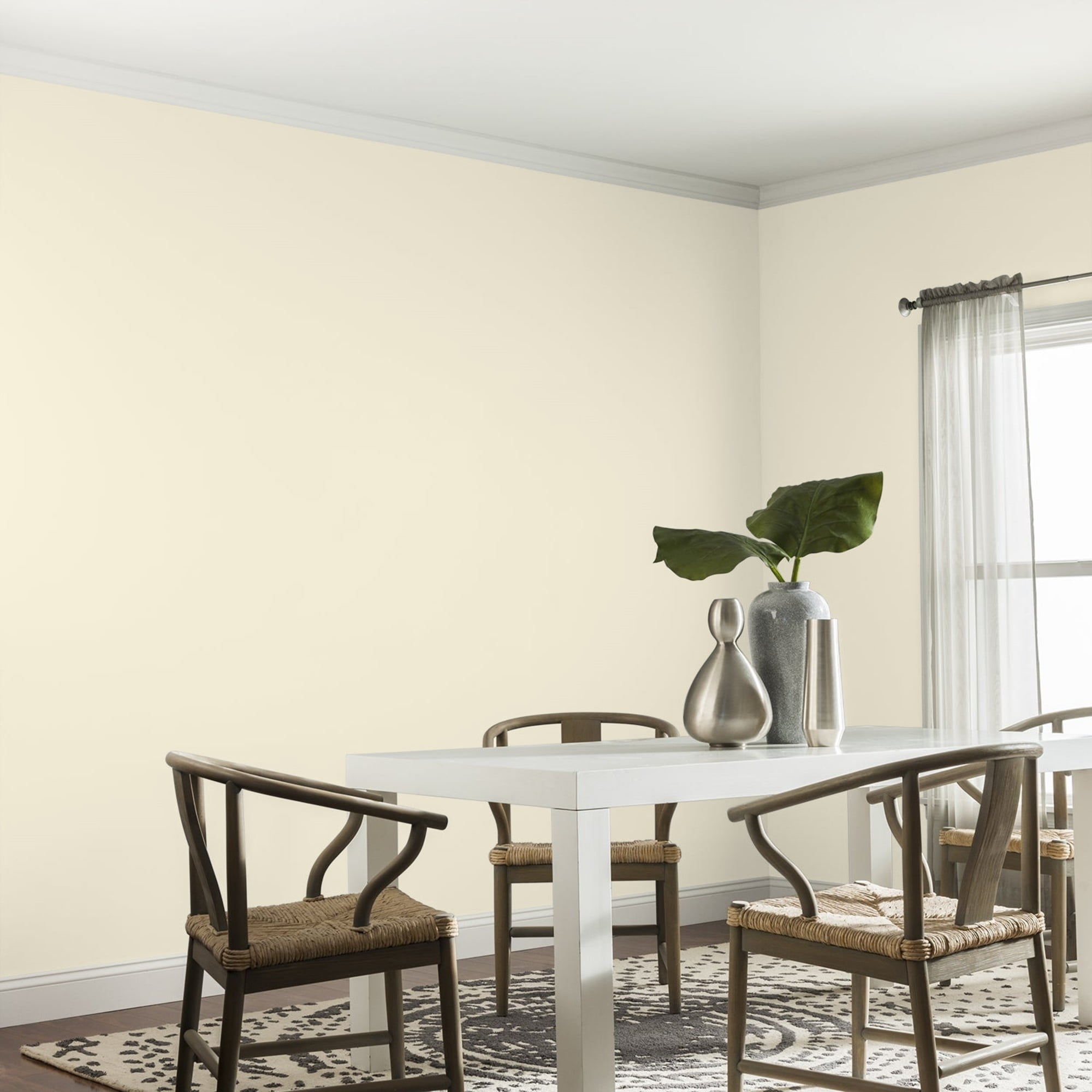 Glidden One Coat Interior is a super-premium quality paint that provides in one coat coverage*, an exceptional hide and stain blocking finish. This Low odor/ Low VOC formula has excellent scrubbability so it stand up to frequent cleanings. Ideal for use on properly prepared interior walls, ceilings, or trim composed of new or previously painted drywall, plaster, masonry, wood and metal. Available in Flat, Eggshell, Semi-Gloss Sheens. Mesa Beige is a light, muted, sun-kissed yellow and the undertone is lemon. This paint color is perfect for a baby’s room or laundry room. Combine it with white trim for a sunny French Country appeal.