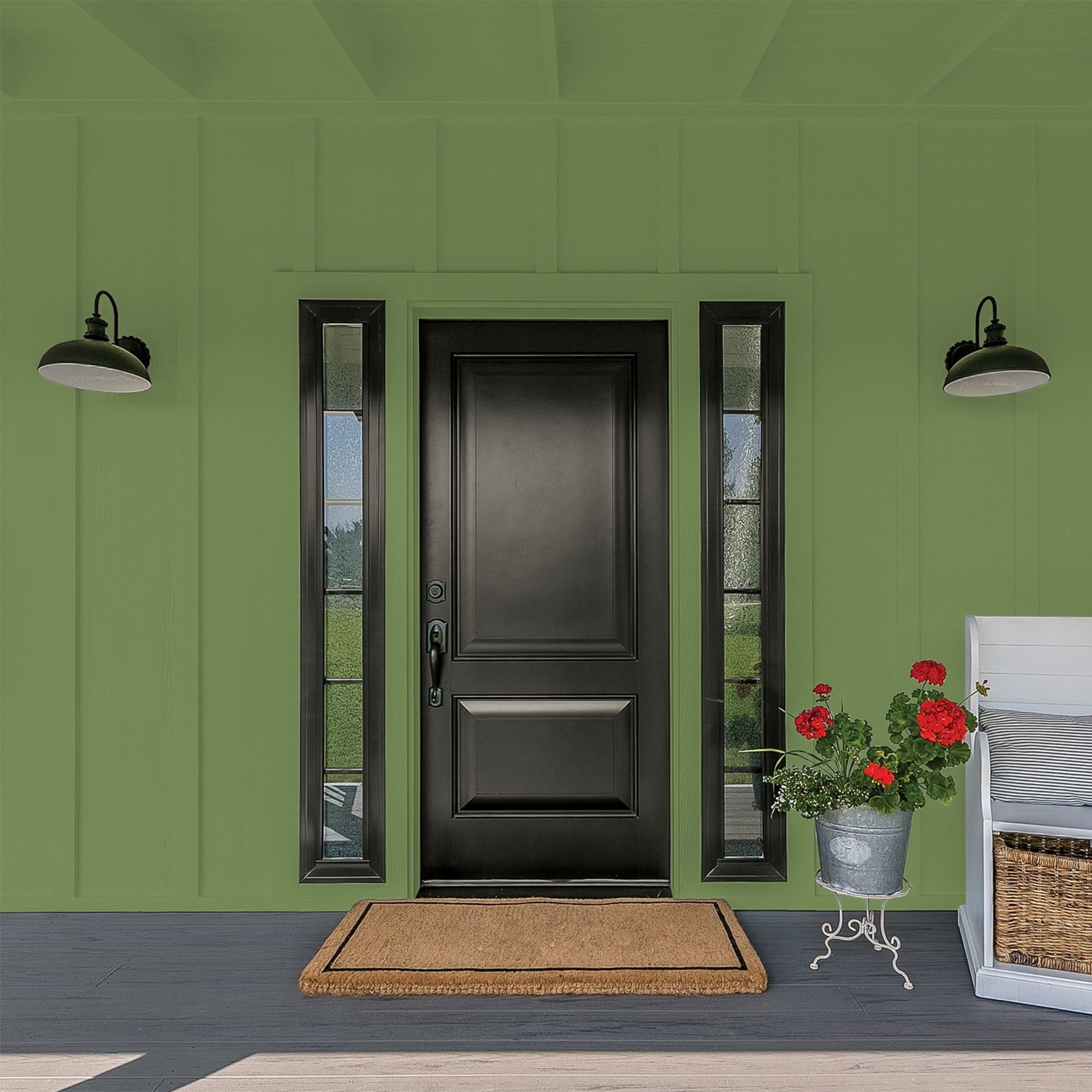 Glidden One Coat Exterior Paint is a super-premium quality paint that provides in one coat coverage* an enhance UV protection finish. This 100% acrylic paint provides a mildew resistant coating, excellent hide and adhesion, and exceptional resistance to fading, cracking & peeling on many exterior projects including properly prepared, exterior wood, brick, masonry, concrete, weathered aluminum, and primed metal substrates. Available in Flat, Satin, Semi-Gloss Sheens. Mint Leaves is a dark, muted, granny smith green and the undertone is a grassy green. This paint color is perfect for a front door. Combine it with white trim.