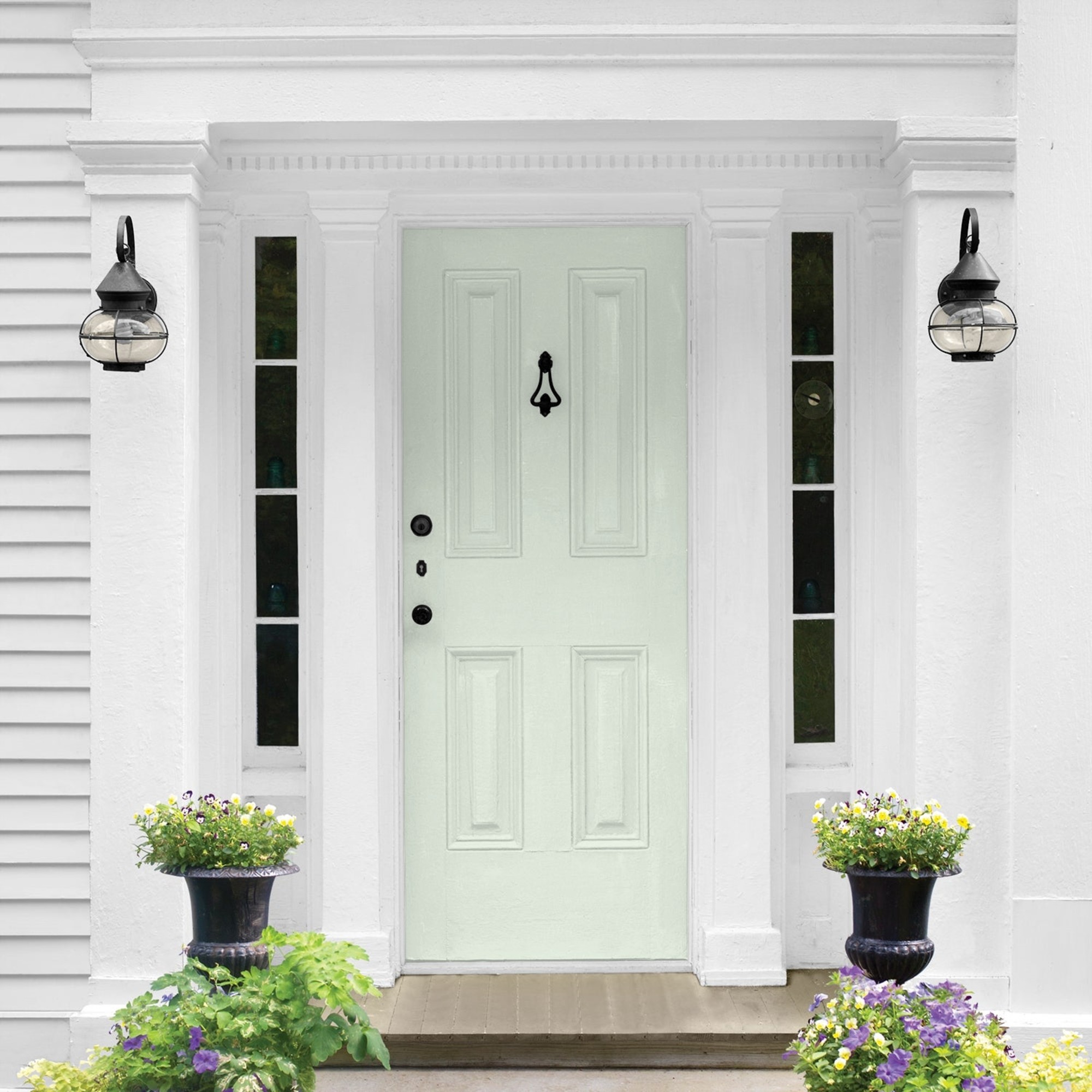 Glidden One Coat Exterior Paint is a super-premium quality paint that provides in one coat coverage* an enhance UV protection finish. This 100% acrylic paint provides a mildew resistant coating, excellent hide and adhesion, and exceptional resistance to fading, cracking & peeling on many exterior projects including properly prepared, exterior wood, brick, masonry, concrete, weathered aluminum, and primed metal substrates. Available in Flat, Satin, Semi-Gloss Sheens. Mint Wafer is a light, subdued, pasture green and the undertone is mint. This paint color is perfect for a stately dining room. Combine it with accents of gold refinement.
