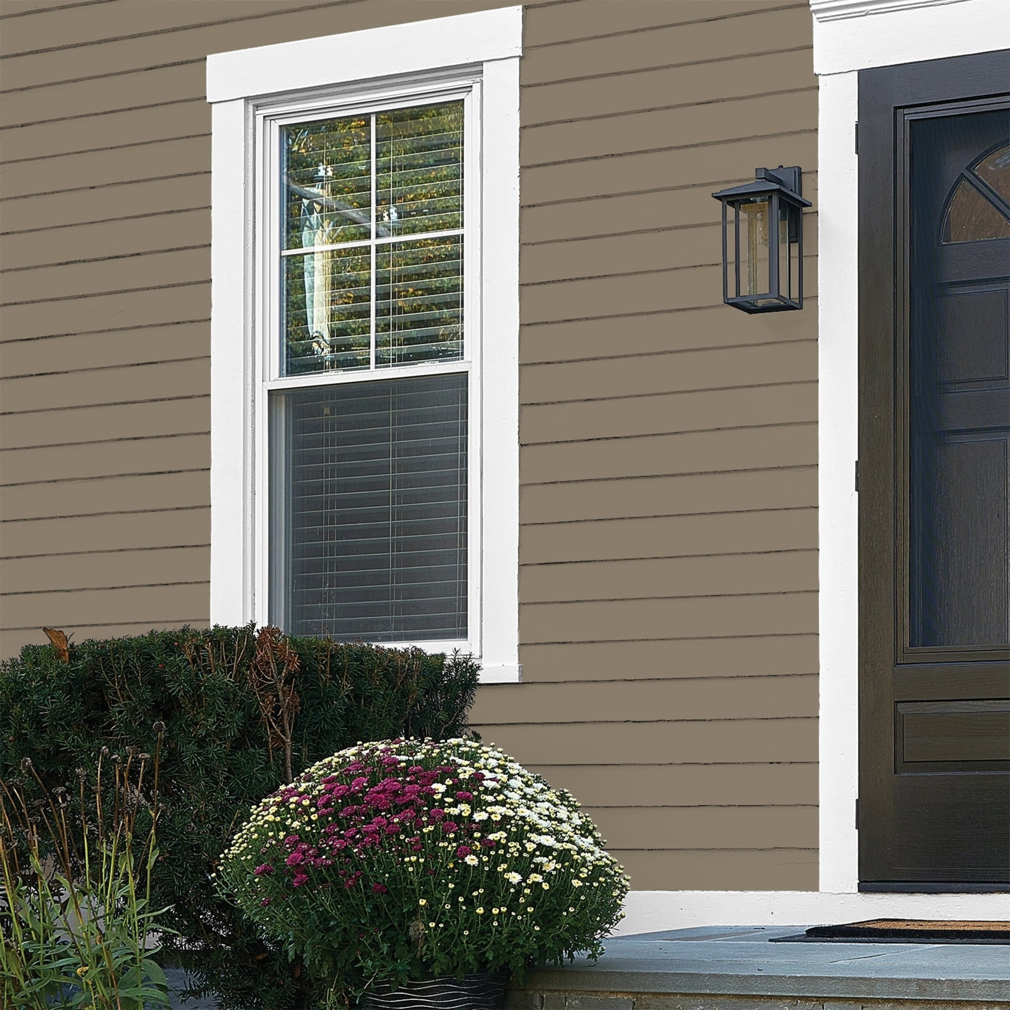Glidden One Coat Exterior Paint is a super-premium quality paint that provides in one coat coverage* an enhance UV protection finish. This 100% acrylic paint provides a mildew resistant coating, excellent hide and adhesion, and exceptional resistance to fading, cracking & peeling on many exterior projects including properly prepared, exterior wood, brick, masonry, concrete, weathered aluminum, and primed metal substrates. Available in Flat, Satin, Semi-Gloss Sheens. Patches is a deep, gray, golden beige and the undertone is almond. This color is perfect to paint the exterior of your home when you want more of a neutral tint. Combine it with deep charcoal or black trim.