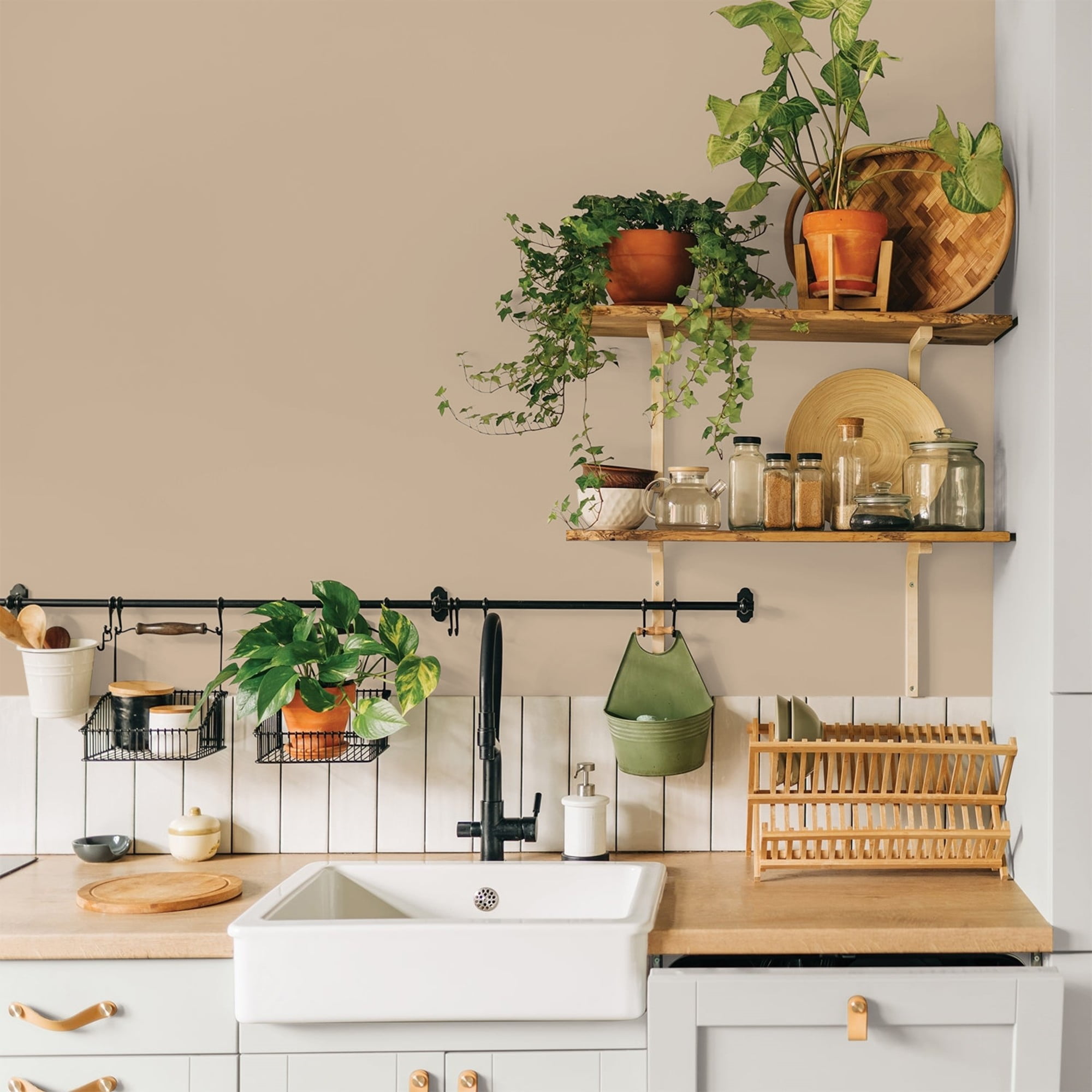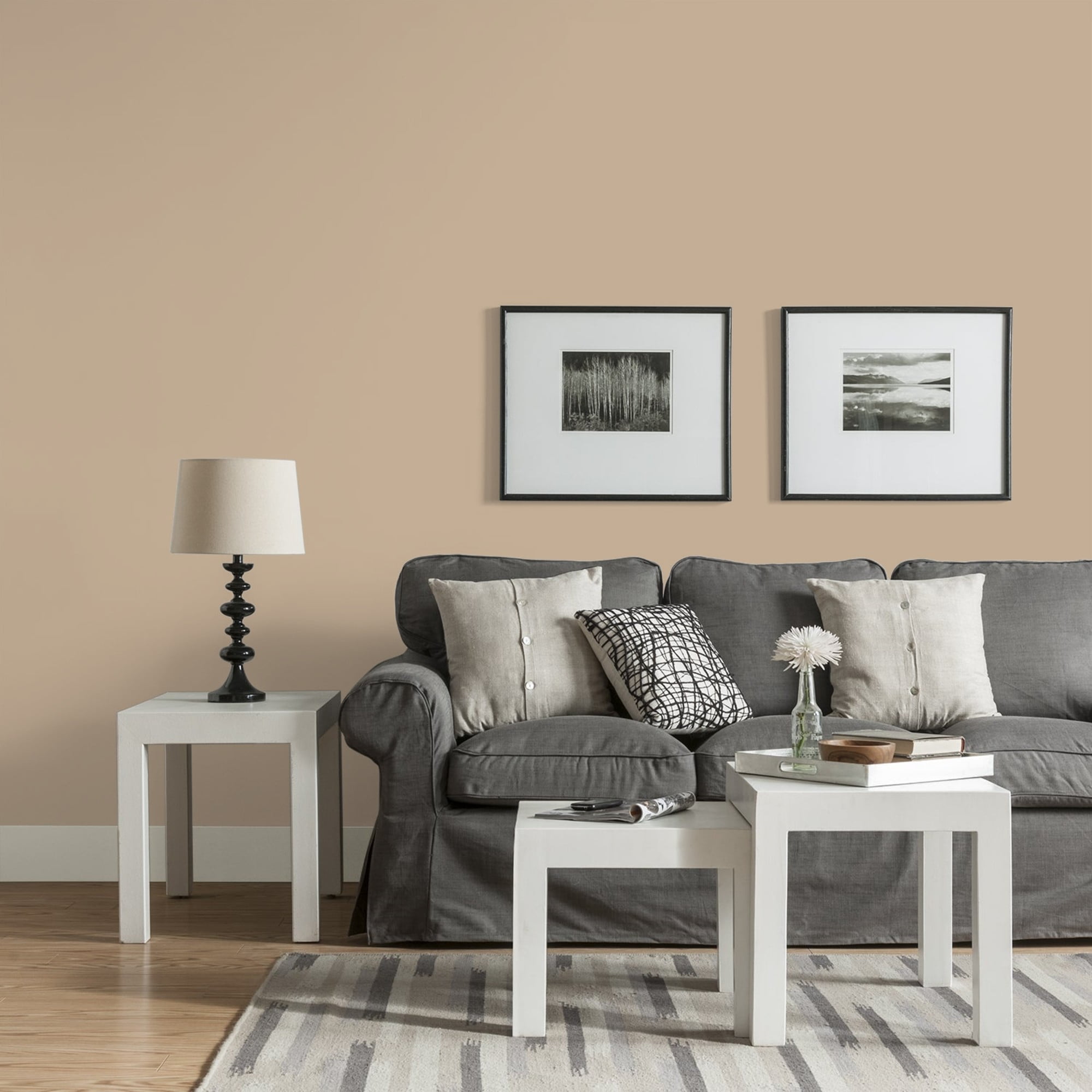 Glidden One Coat Interior is a super-premium quality paint that provides in one coat coverage*, an exceptional hide and stain blocking finish. This Low odor/ Low VOC formula has excellent scrubbability so it stand up to frequent cleanings. Ideal for use on properly prepared interior walls, ceilings, or trim composed of new or previously painted drywall, plaster, masonry, wood and metal. Available in Flat, Eggshell, Semi-Gloss Sheens. Persuasion is a soft, neutral, modern beige and the undertone is mahogany. This paint color is perfect for a bedroom or study area. Combine it with honeyed and light woods.