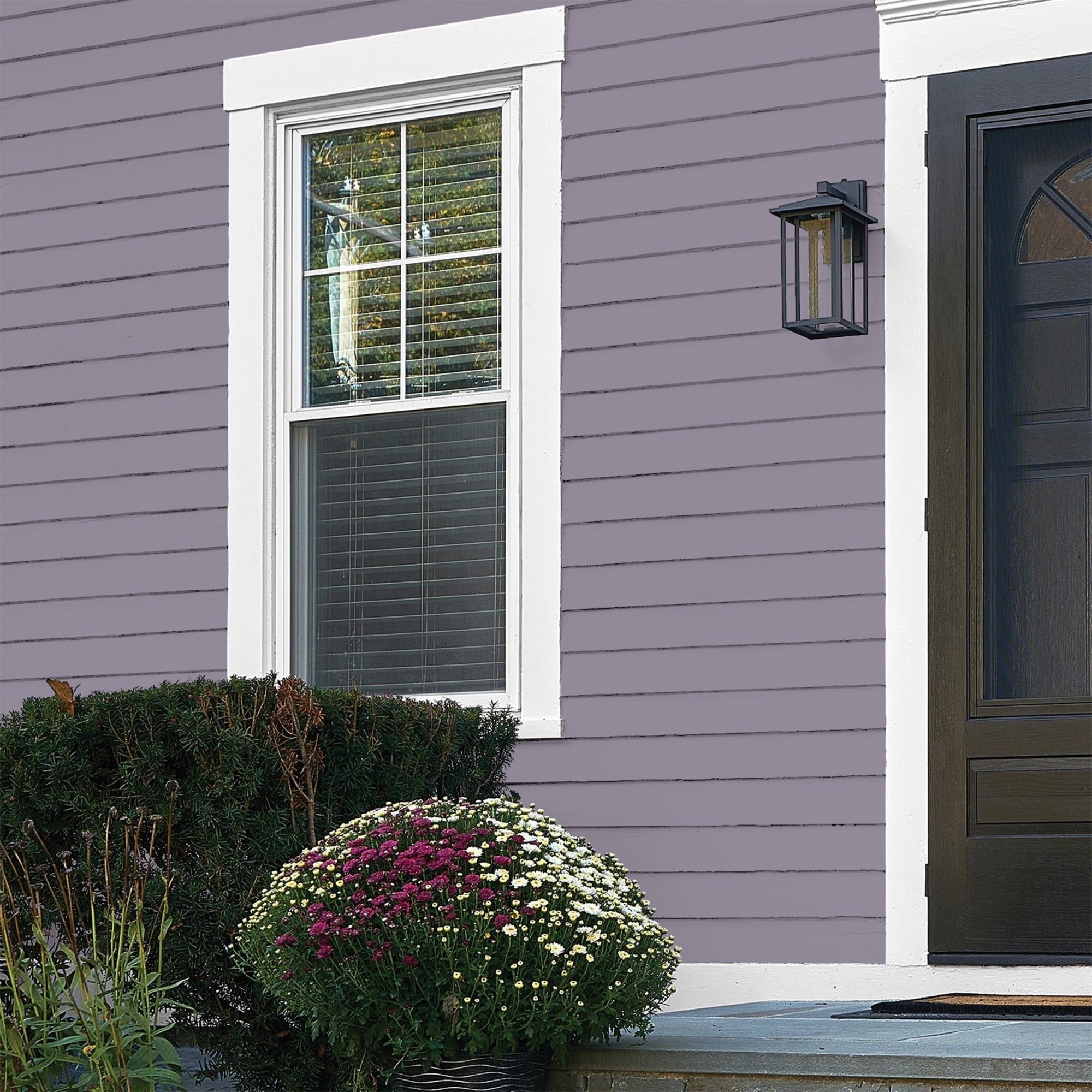 Glidden One Coat Exterior Paint is a super-premium quality paint that provides in one coat coverage* an enhance UV protection finish. This 100% acrylic paint provides a mildew resistant coating, excellent hide and adhesion, and exceptional resistance to fading, cracking & peeling on many exterior projects including properly prepared, exterior wood, brick, masonry, concrete, weathered aluminum, and primed metal substrates. Available in Flat, Satin, Semi-Gloss Sheens. Tin Lizzie is a saturated, neutral, heliotrope purple and the undertone is raspberry. This paint color is perfect for all the walls of a room. Combine it with lighter shades on the remaining walls.
