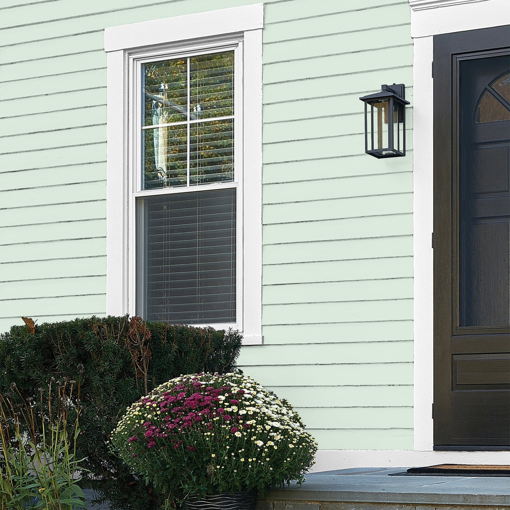 Glidden One Coat Exterior Paint is a super-premium quality paint that provides in one coat coverage* an enhance UV protection finish. This 100% acrylic paint provides a mildew resistant coating, excellent hide and adhesion, and exceptional resistance to fading, cracking & peeling on many exterior projects including properly prepared, exterior wood, brick, masonry, concrete, weathered aluminum, and primed metal substrates. Available in Flat, Satin, Semi-Gloss Sheens. Tint Of Green is a pale, bright, crisp clover green and the undertone is Kelly green. This paint color is perfect for a meditation space or room for fresh Zen-like appeal. Combine it with soft pink accents for an aristocratic look.