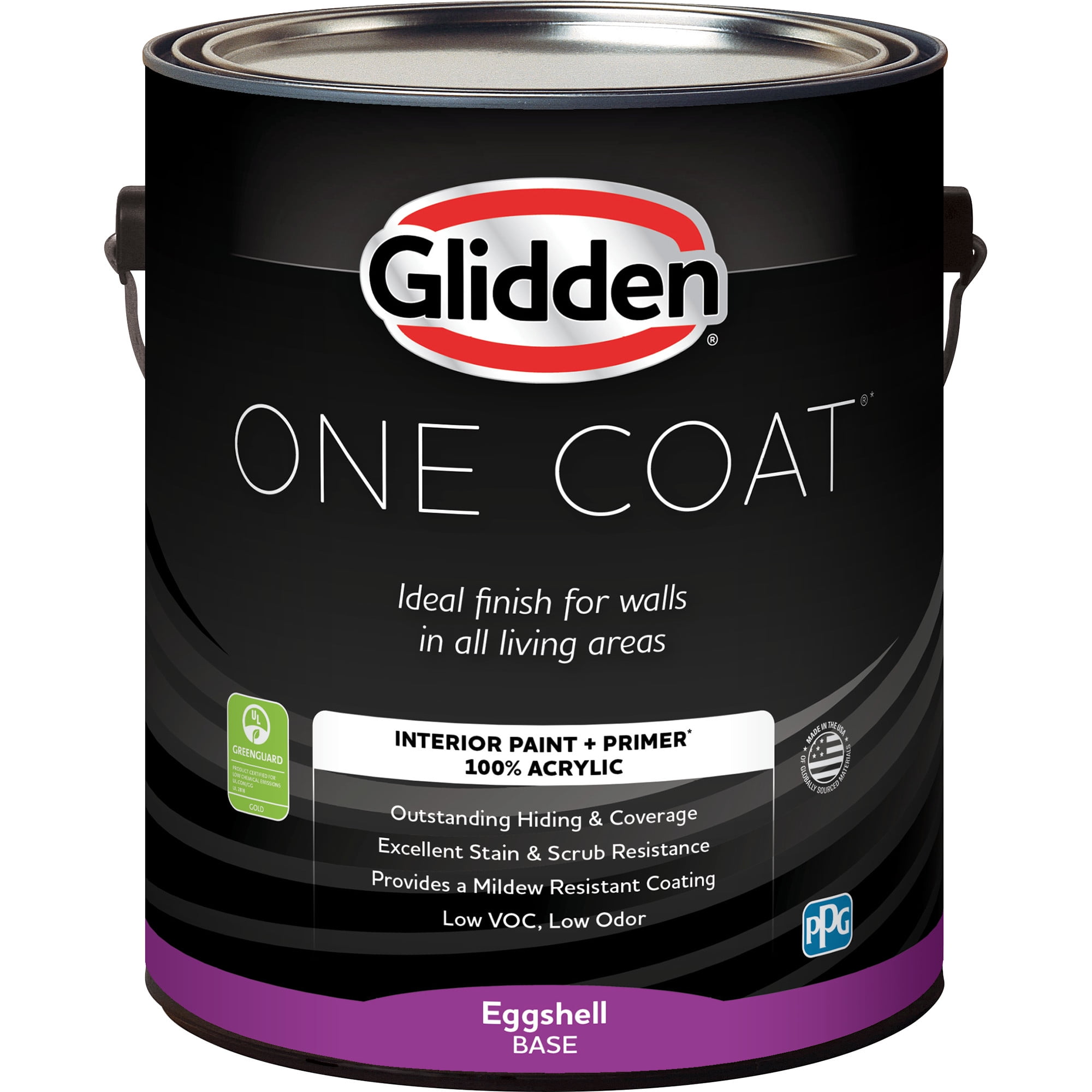 Interior liquid paint + primer* 100% acrylic Outstanding hide and coverage up to 400 sq. ft. per gallon Excellent washability Provides a mildew resistant coating Low VOC, low odor; Dry time 30-60 minutes, Recoat 2-4 hours Available in a hand selected palette of our most popular colors