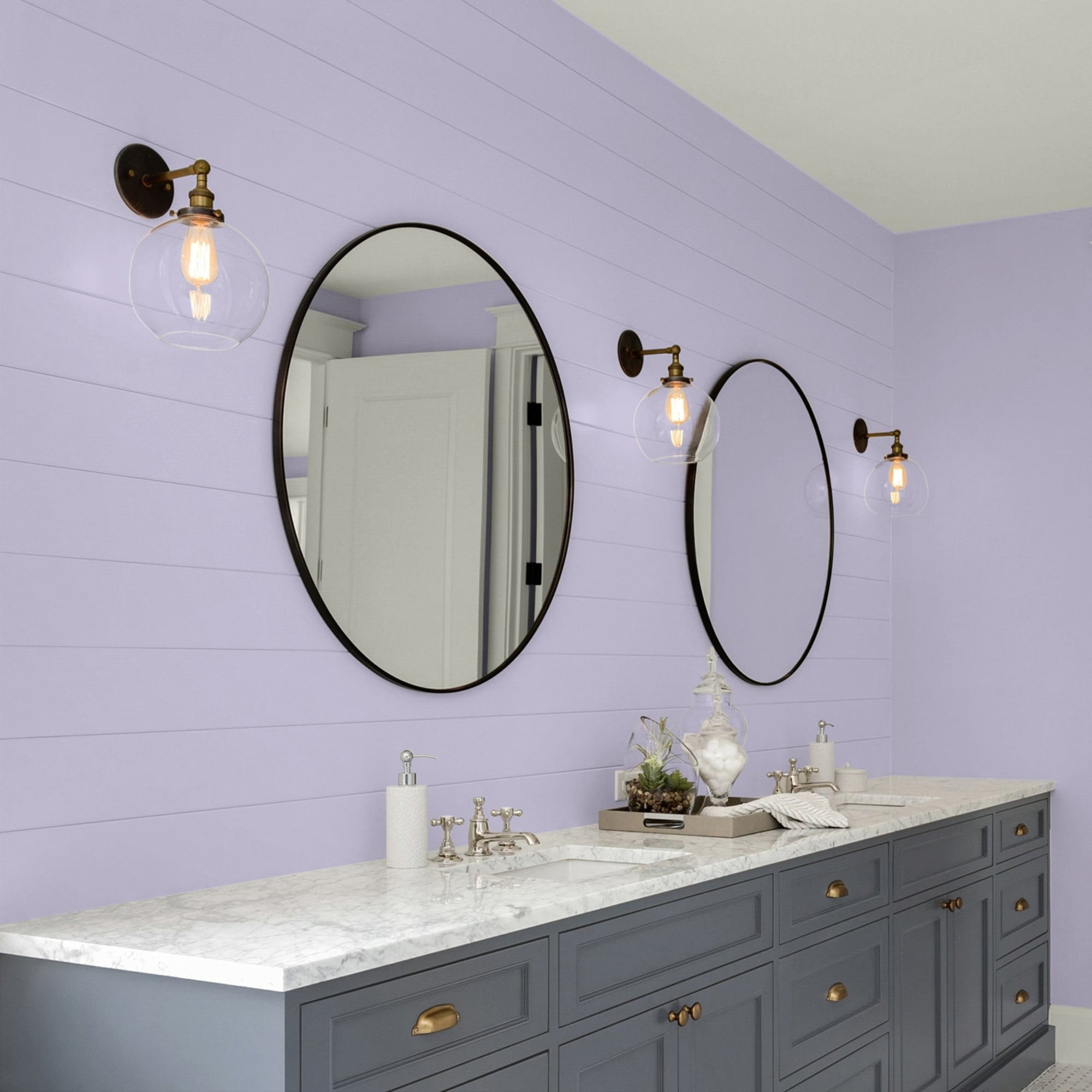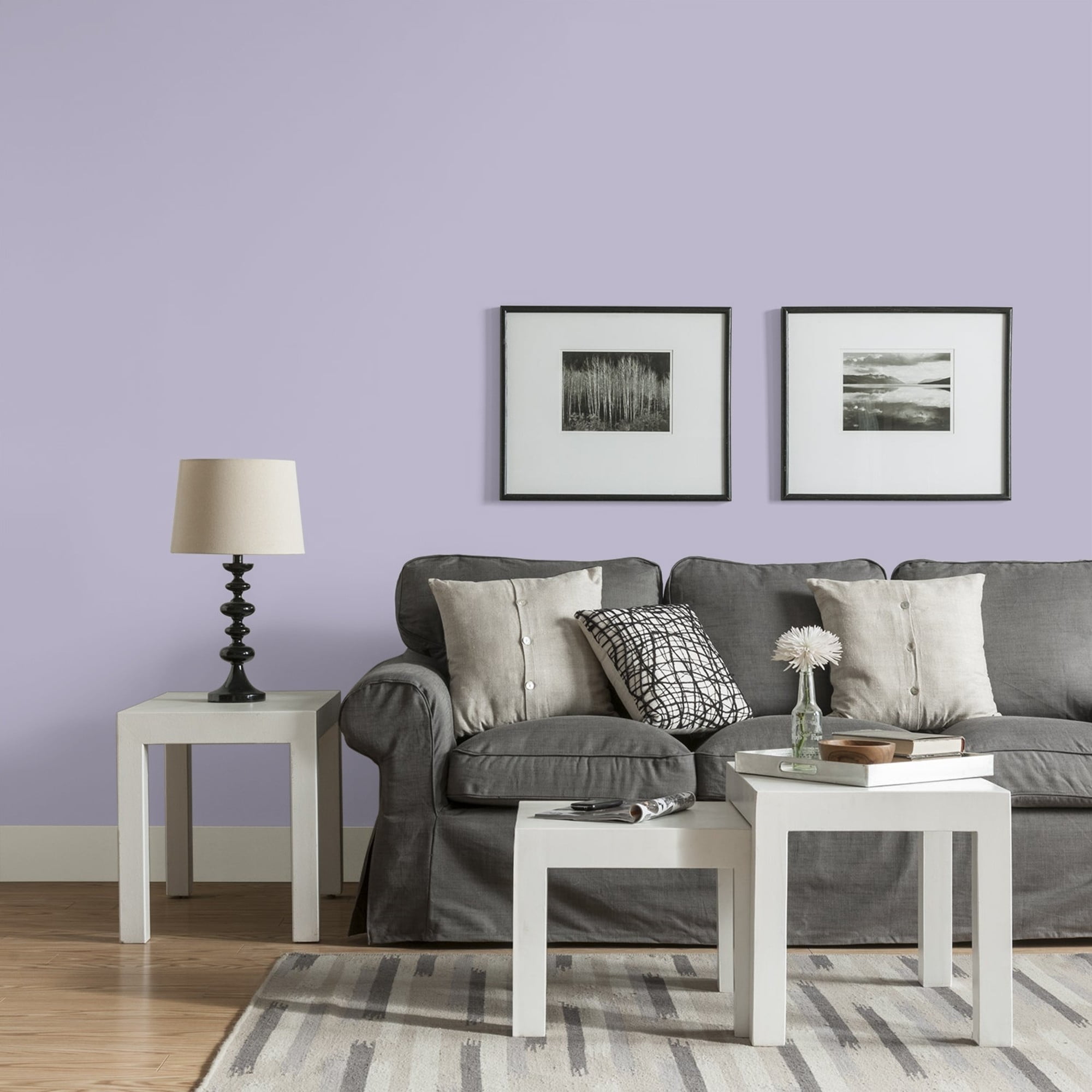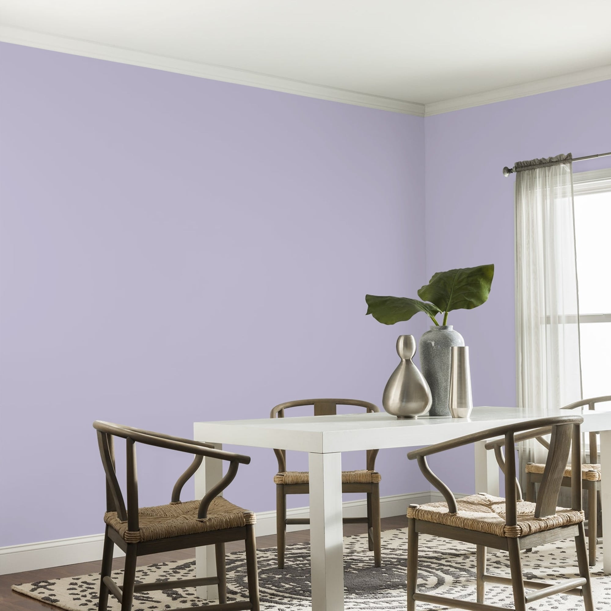Glidden One Coat Interior is a super-premium quality paint that provides in one coat coverage*, an exceptional hide and stain blocking finish. This Low odor/ Low VOC formula has excellent scrubbability so it stand up to frequent cleanings. Ideal for use on properly prepared interior walls, ceilings, or trim composed of new or previously painted drywall, plaster, masonry, wood and metal. Available in Flat, Eggshell, Semi-Gloss Sheens. Wild Lilac is a midtone, muted, amethyst purple and the undertone is paisley purple. In a dining room this paint color will be beautiful or a bedroom. Combine it with off-white and silver touches to complete the harmony.