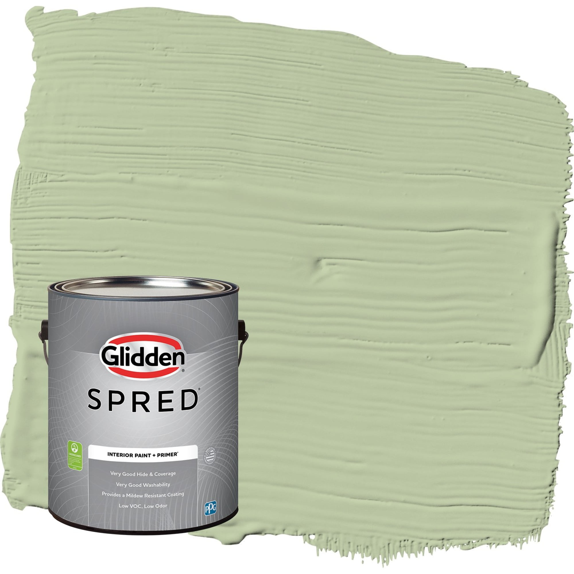 Interior liquid paint + primer* Very good hide & coverage up to 400 sq. ft. per gallon Very good washability Provides a mildew resistant coating Low VOC, low odor; Fast drying in 30-60 minutes, recoat 2-4 hours Glidden Spred Interior has achieved GREENGUARD GOLD Certification Available in a hand selected palette of our most popular colors