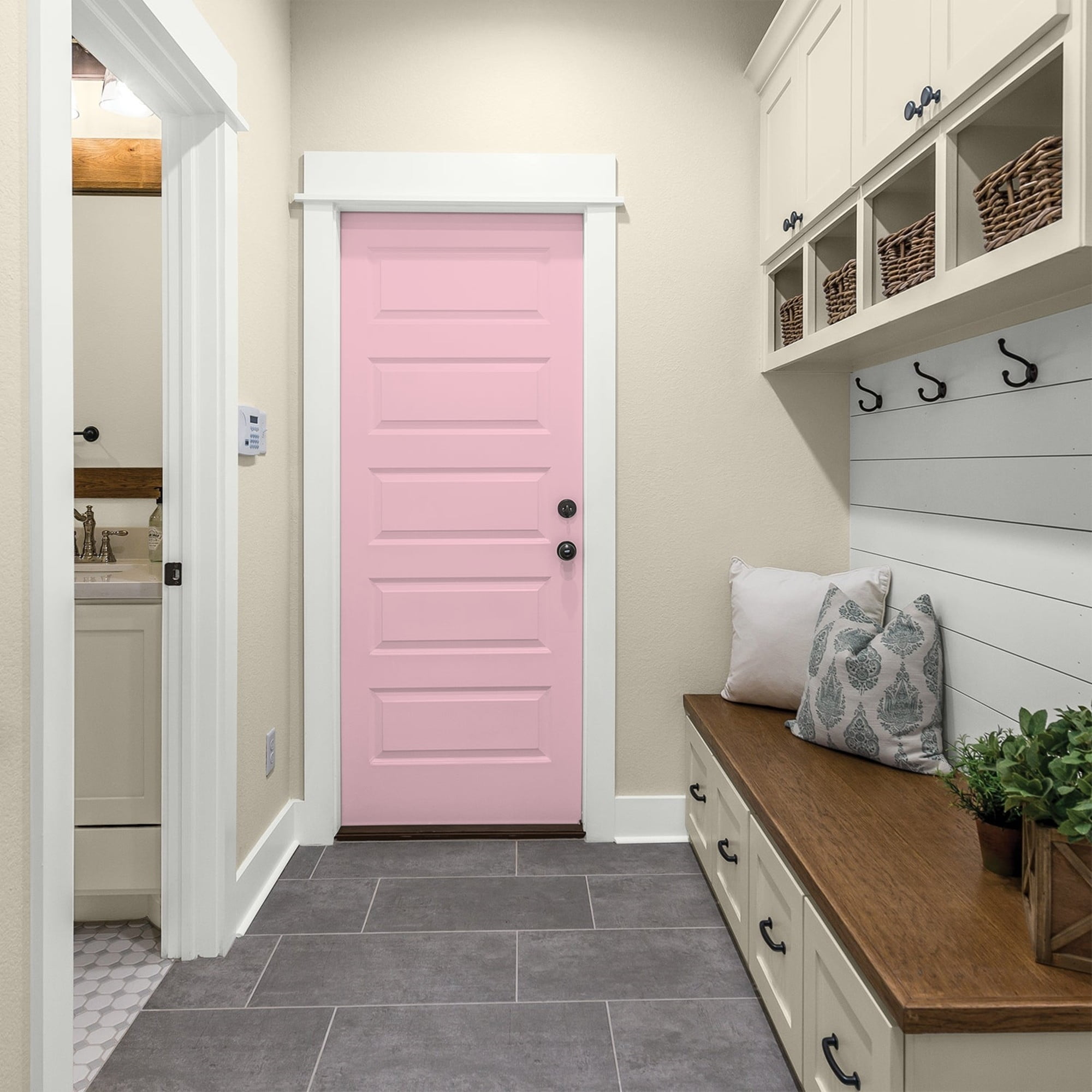 Glidden Spred is a multi-purpose interior latex paint + primer. This low odor/zero VOC* paint provides good hiding and is scrubbable and washable to withstand repeated cleanings. Ideal for use on properly prepared interior walls, ceilings, or trim composed of new or previous ly painted drywall, plaster, masonry, wood and metal. *Colorants added to this base paint may increase VOC level significantly depending on color choices. Rose Melody is a soft, bright, cheerful cerise pink and the undertone is rose-pink. This paint color is perfect for a girl’s room. Combine it with minty greens and soft grays.
