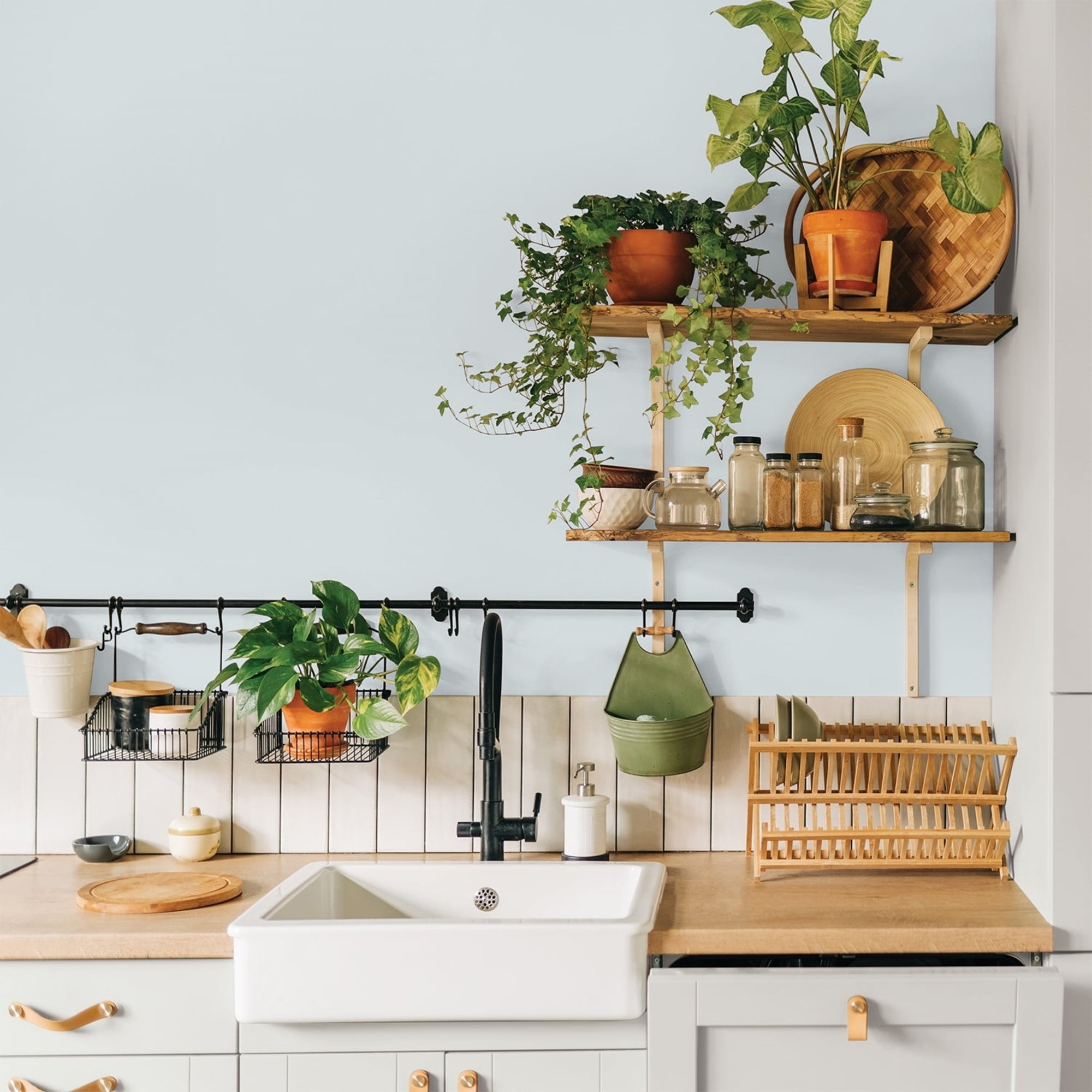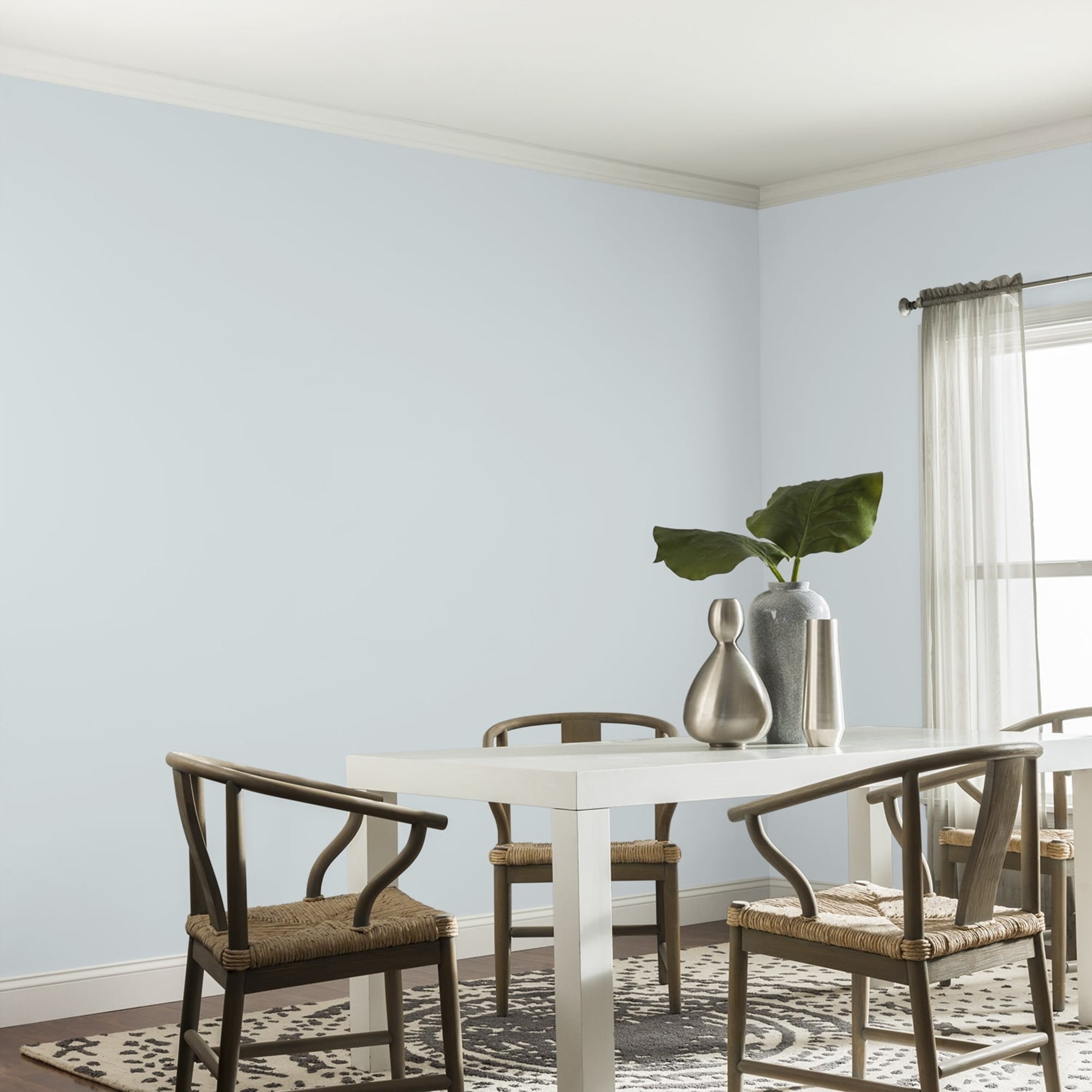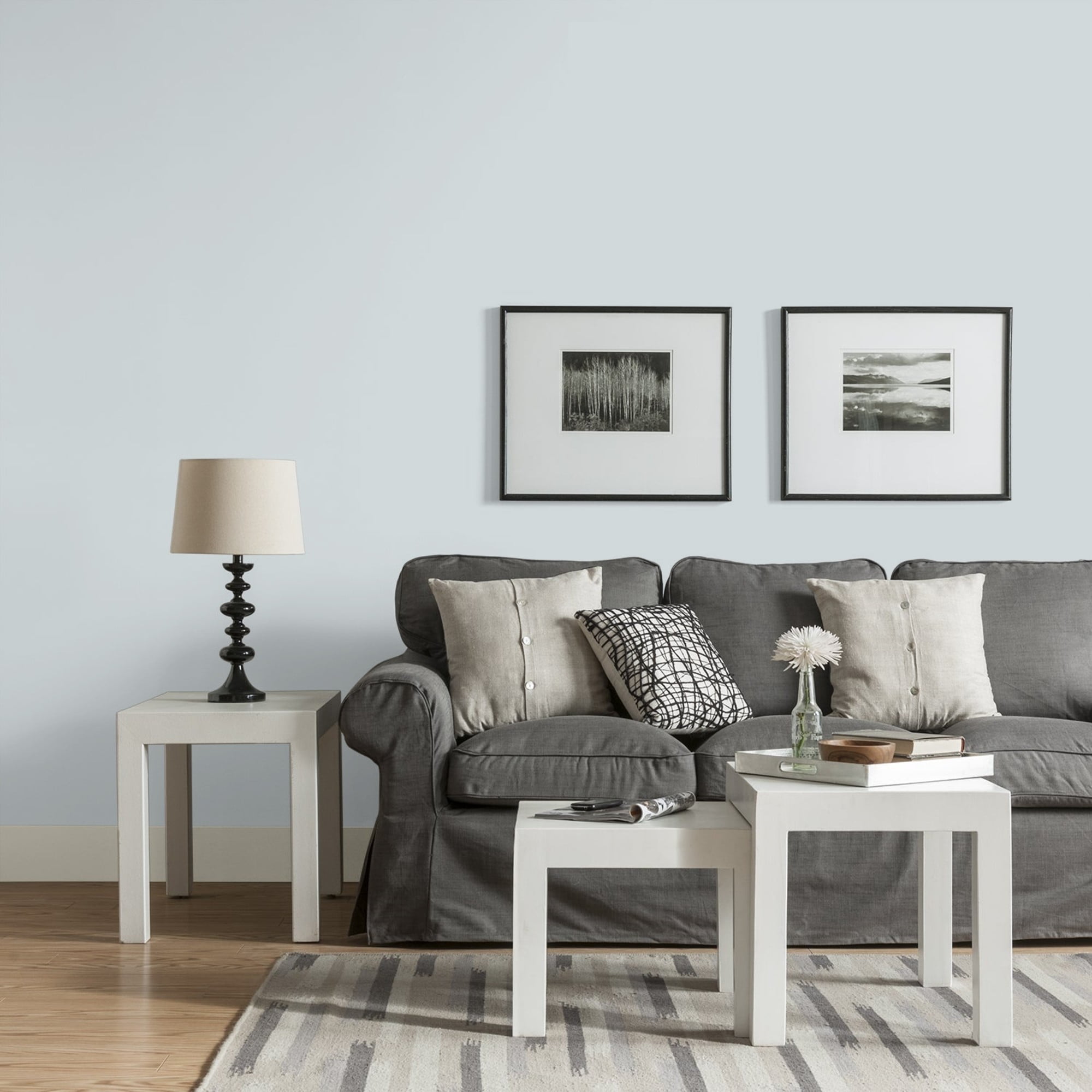 Glidden Spred is a multi-purpose interior latex paint + primer. This low odor/zero VOC* paint provides good hiding and is scrubbable and washable to withstand repeated cleanings. Ideal for use on properly prepared interior walls, ceilings, or trim composed of new or previous ly painted drywall, plaster, masonry, wood and metal. *Colorants added to this base paint may increase VOC level significantly depending on color choices. Tinsel is a soft, cool, nautical gray and the undertone is baby shark. This paint color is perfect for kitchens and walls or cupboards and in any other room for a cool, calming country feel. Combine it with warm white trim.