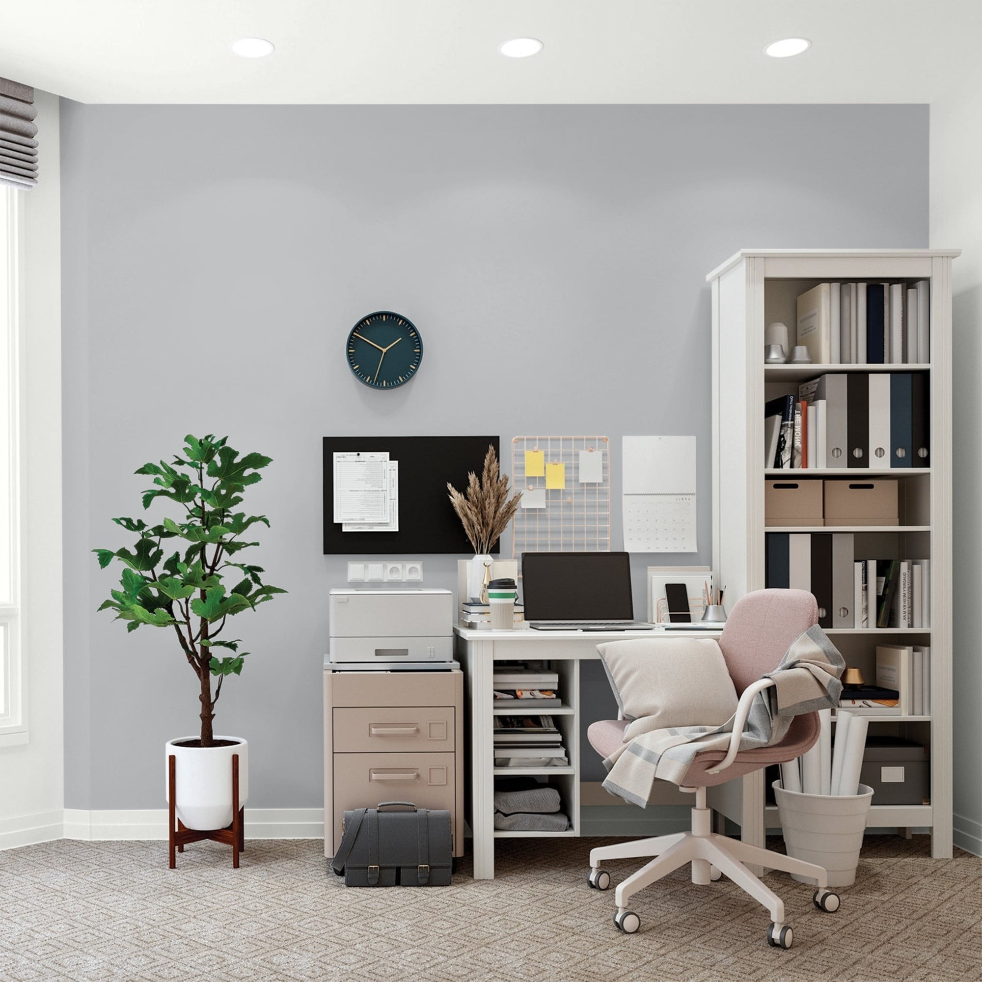 Glidden Spred is a multi-purpose interior latex paint + primer. This low odor/zero VOC* paint provides good hiding and is scrubbable and washable to withstand repeated cleanings. Ideal for use on properly prepared interior walls, ceilings, or trim composed of new or previous ly painted drywall, plaster, masonry, wood and metal. *Colorants added to this base paint may increase VOC level significantly depending on color choices. Whirlwind is a soft, gray, enchanting purple and the undertone is misty. This color is perfect to paint a lovely baby’s room.Combine it with tints of light mint greens on surrounding walls.