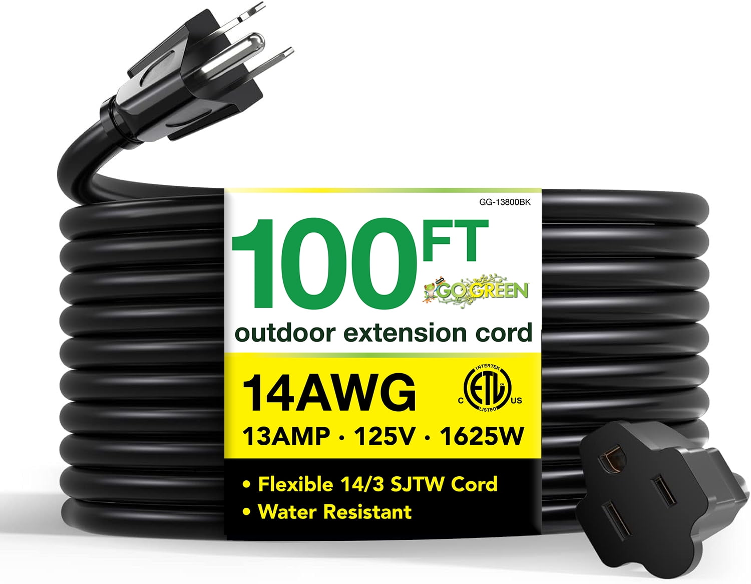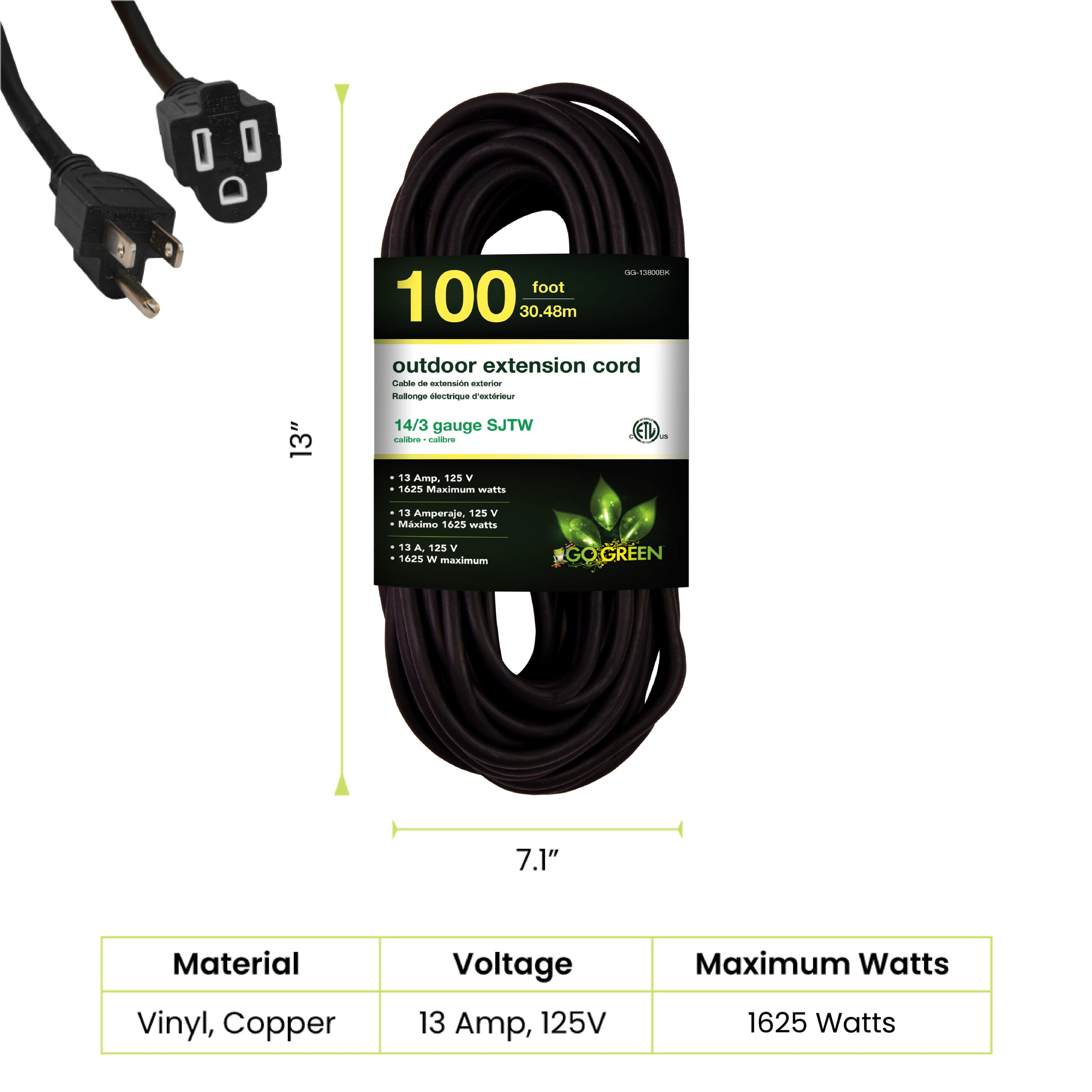 Extension Cord: The GoGreen Power (GG-13800BK) is a contractor grade 14/3 SJTW extension cord. 100 Foot Extension Cord: This powerful extension cord is 100 feet long. It is also moisture resistant, abrasion resistant, and durable, even with prolonged exposure to sunlight! Molded Plug Extension Cord: The heavy duty extension cord has molded plugs which gives it a sturdy build and makes it easy to use. Outdoor Extension Cable: The cable is recommended for use with heavy duty equipment and tools, with a maximum of 13 amps, 1875 watts, 125 volts. Size and Other Details: This 14/3 SJTW cable is cETL listed and meets all industry standards. Go Green and follow the instructions located on the products package for recycling (visit the GoGreen Power homepage for additional details)