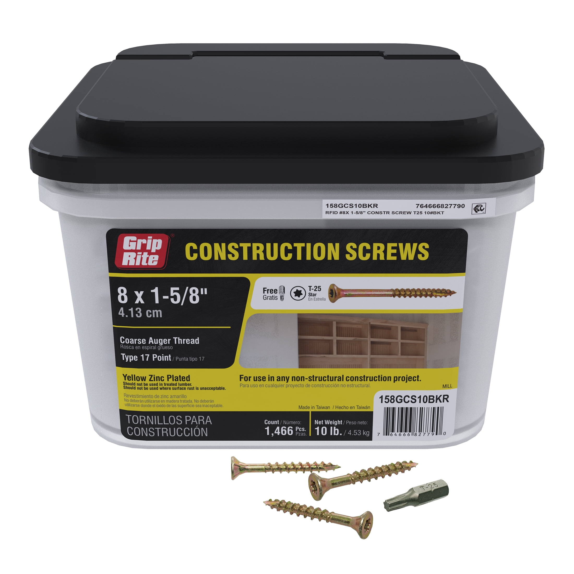 Grip-Rite interior gold construction screws are the reliable choice for a multitude of indoor fastening solutions, including cabinetry, trim, doors, shelving, general woodworking and non-structural framing, among others. Featuring T-25 star drive which helps eliminate camouts and type 17 point which helps the screw engage quickly and does not require pre drilling. An all-purpose screw for reliable results during interior construction. Get the job done right with Grip-Rite.