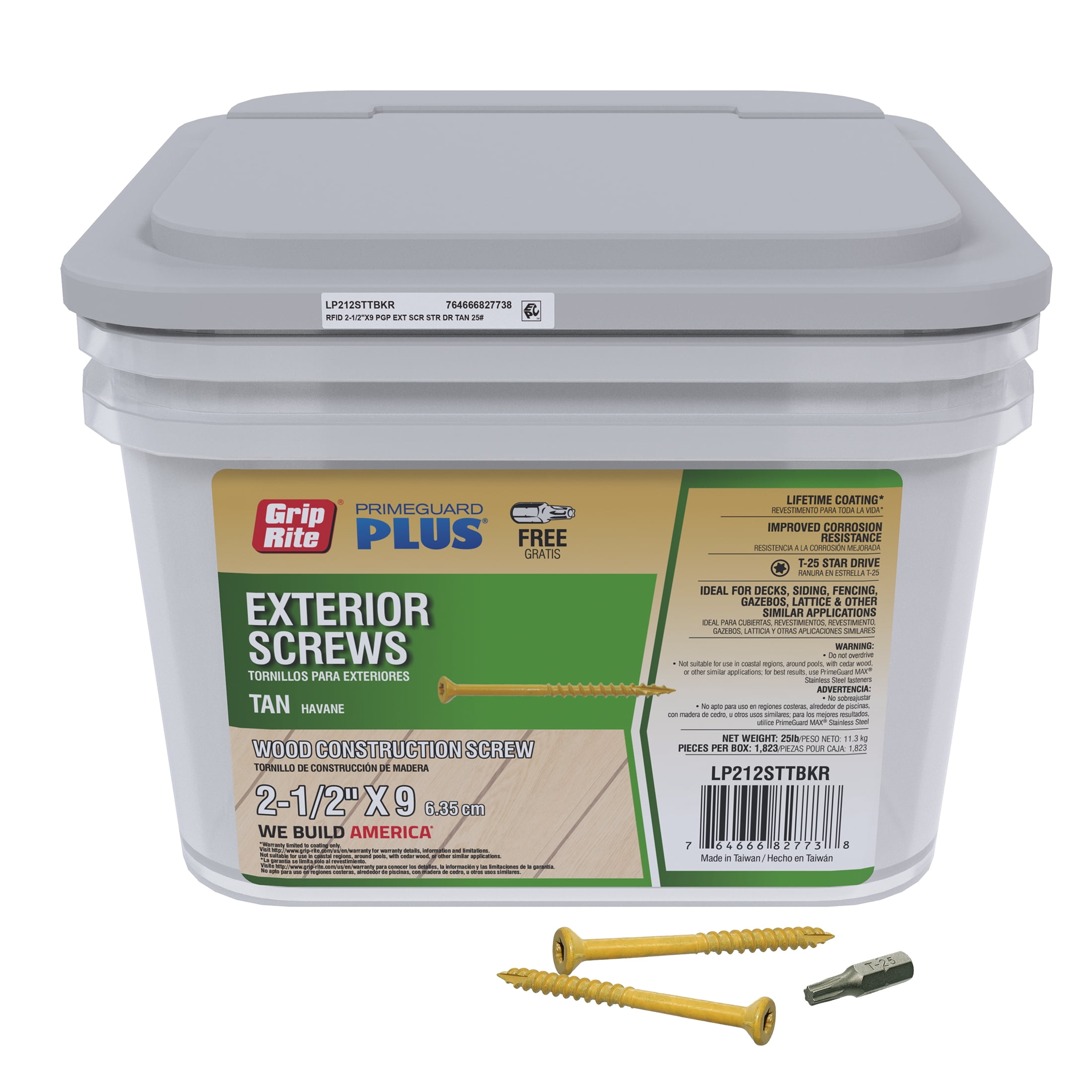 Grip-Rite Exterior Fasteners engineered with our exclusive PrimeGuard Plus premium coating are guaranteed for the life of the project against rust and corrosion to prolong the beauty and durability of decks, siding, fences, gazebos and other outdoor projects. Grip-Rite Exterior Screws are built to contractor specs star drives to quickly engage the included bit, heads that smoothly countersink the coarse thread fastener for a flush finish and a type 17 point to reduce pre-drilling while engaging rapidly with the project material, helping to prevent splitting.