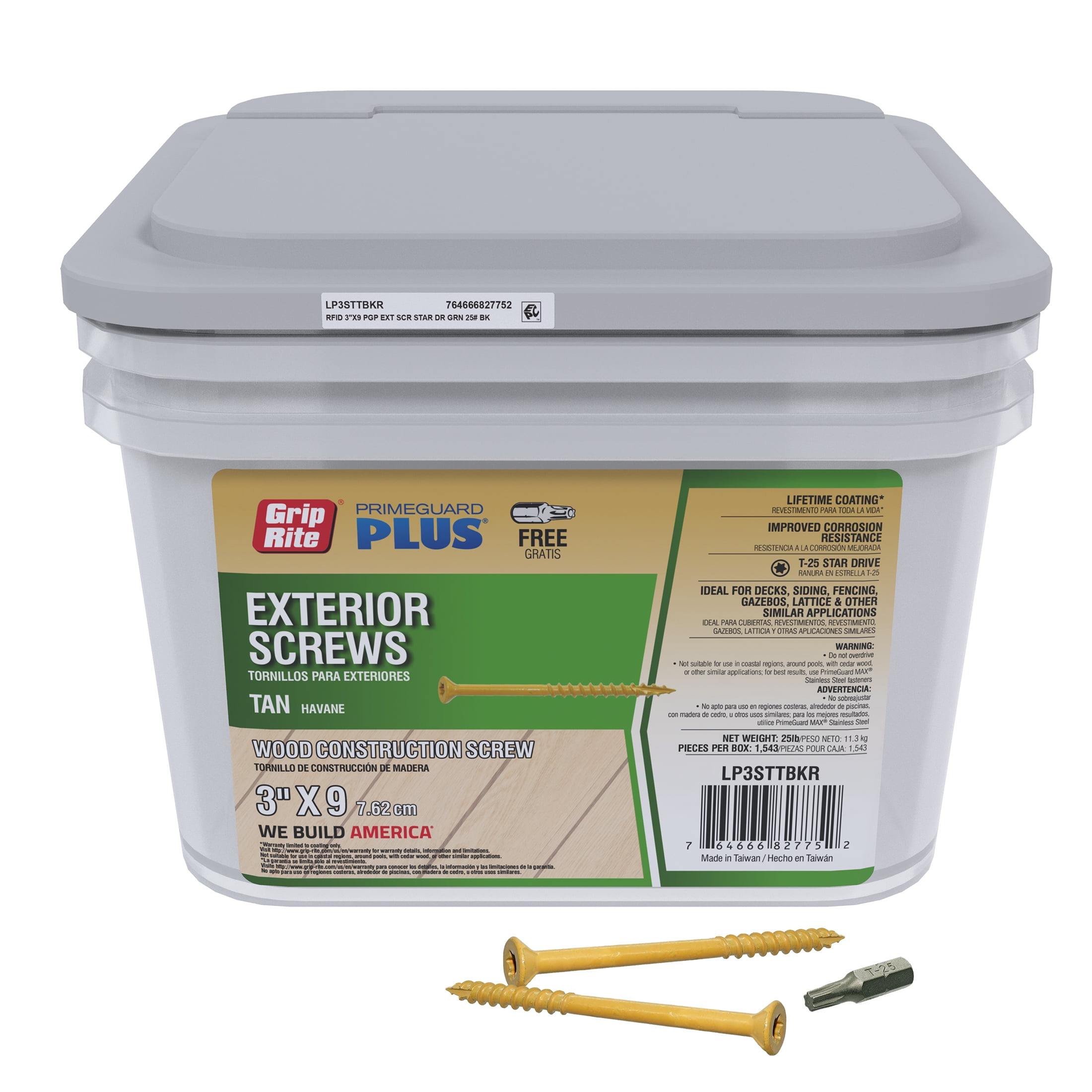 Grip-Rite Exterior Fasteners engineered with our exclusive PrimeGuard Plus premium coating are guaranteed for the life of the project against rust and corrosion to prolong the beauty and durability of decks, siding, fences, gazebos and other outdoor projects. Grip-Rite Exterior Screws are built to contractor specs star drives to quickly engage the included bit, heads that smoothly countersink the coarse thread fastener for a flush finish and a type 17 point to reduce pre-drilling while engaging rapidly with the project material, helping to prevent splitting.